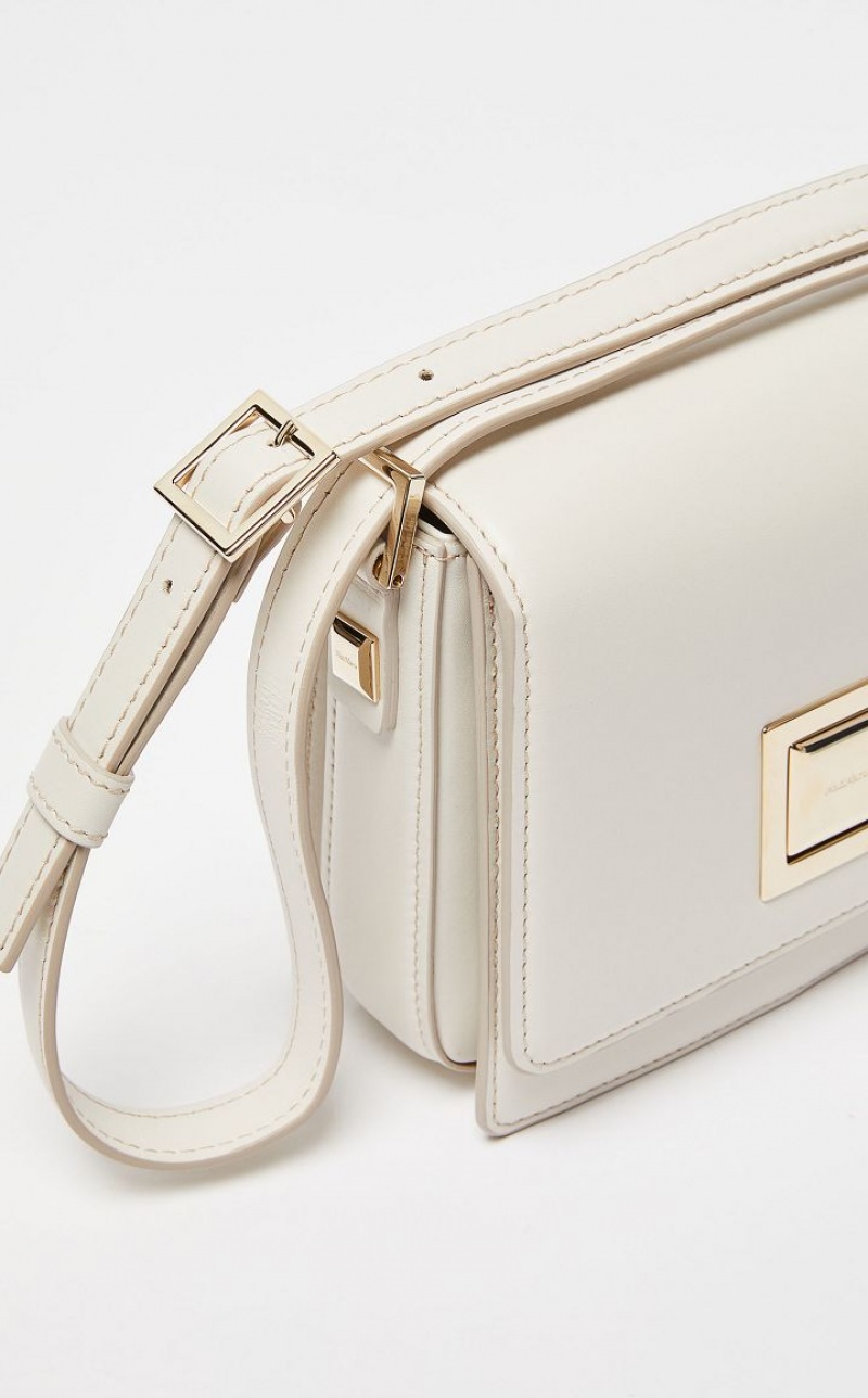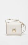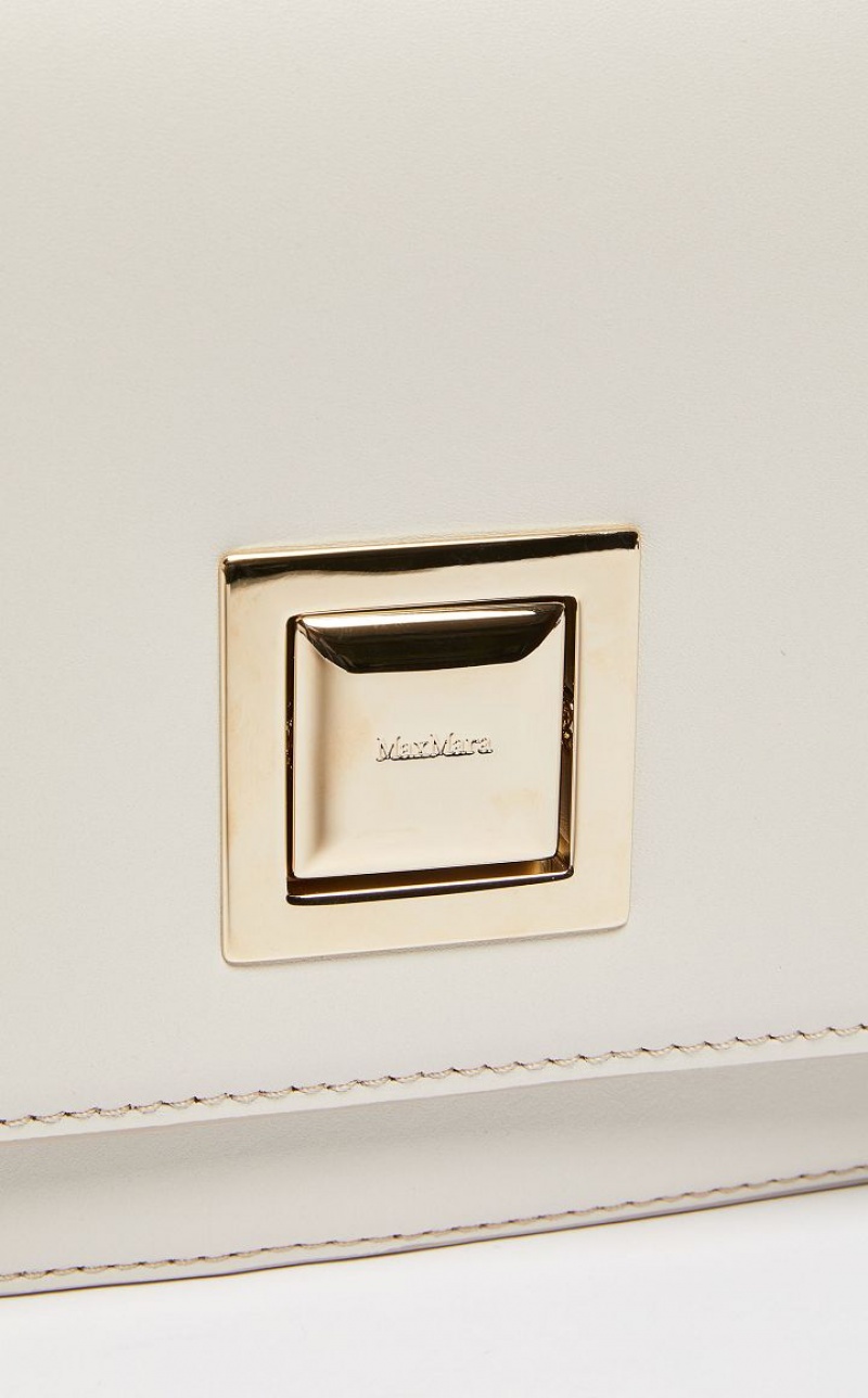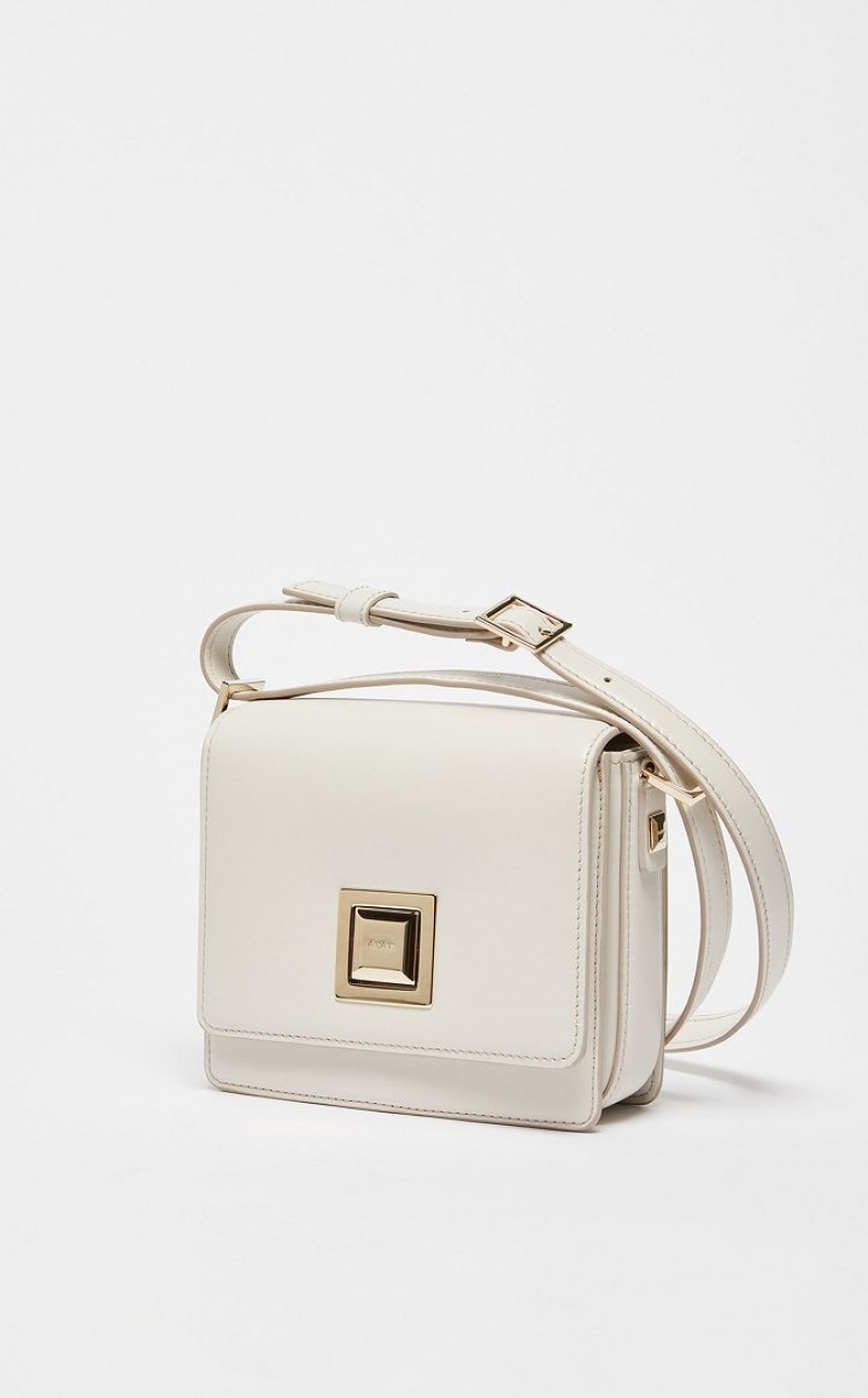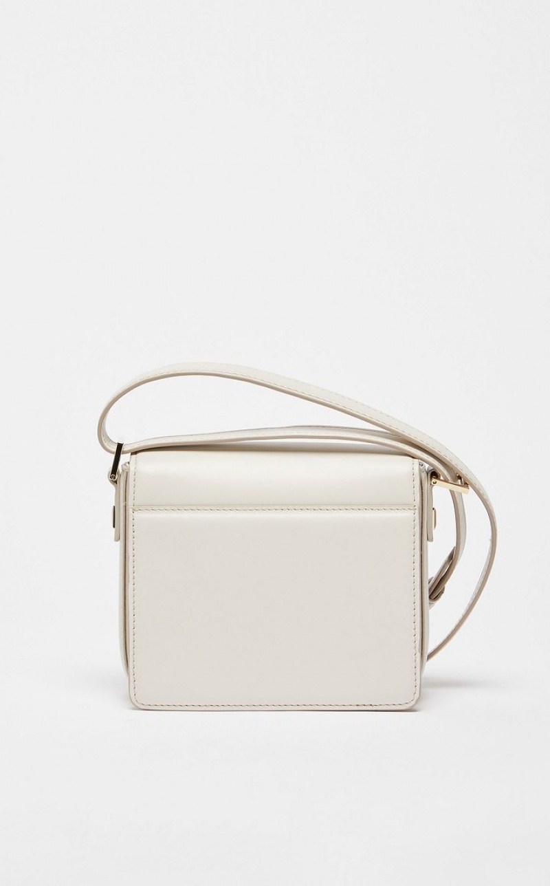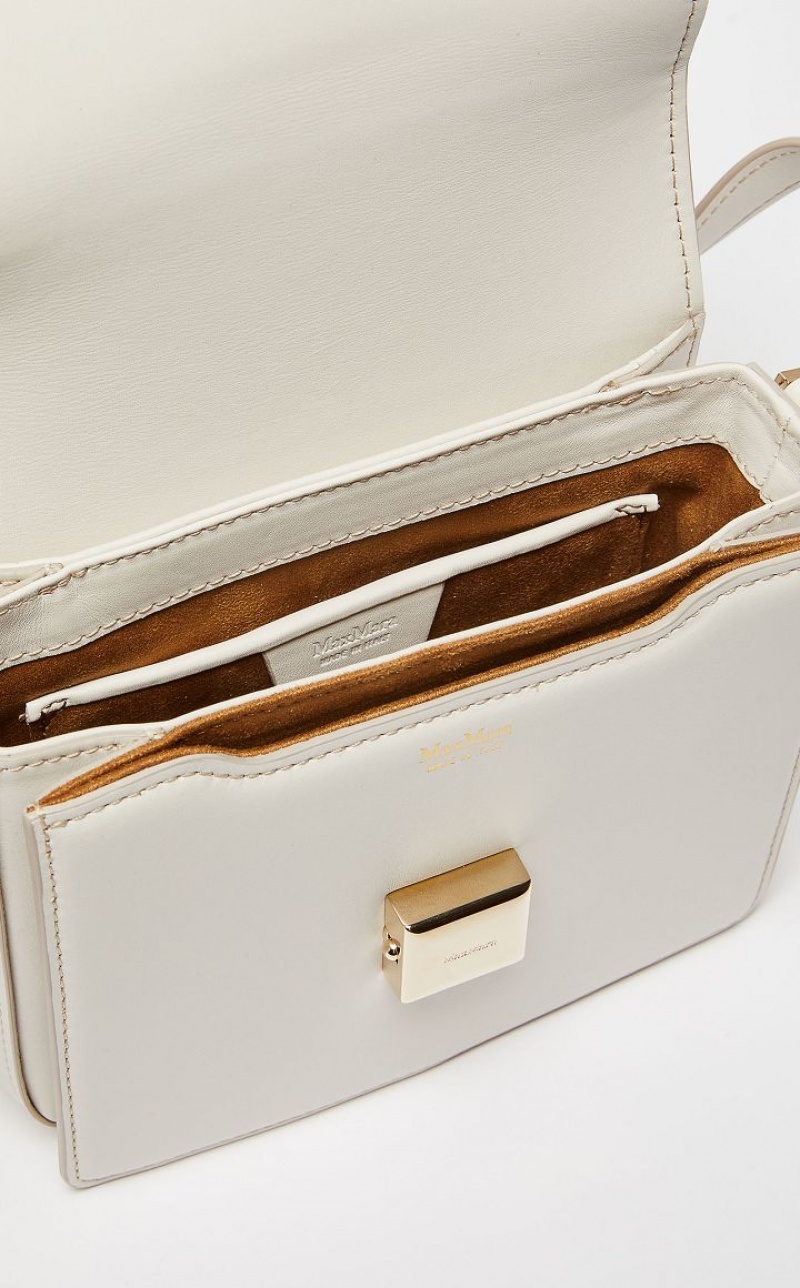 Small MM bag in smooth matte calfskin. The distinctive square shaped design, square models and geometric metal clasp are reminiscent of the Max Mara headquarters’ architecture. The camel coloured suede effect interior is divided into two gusseted compartments with a piped pocket. Complete with an adjustable shoulder strap for on the shoulder or crossbody wear. Button fastening. Size: 18 x 9 x 18 cm.