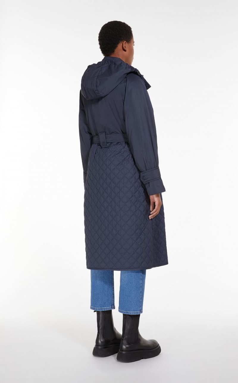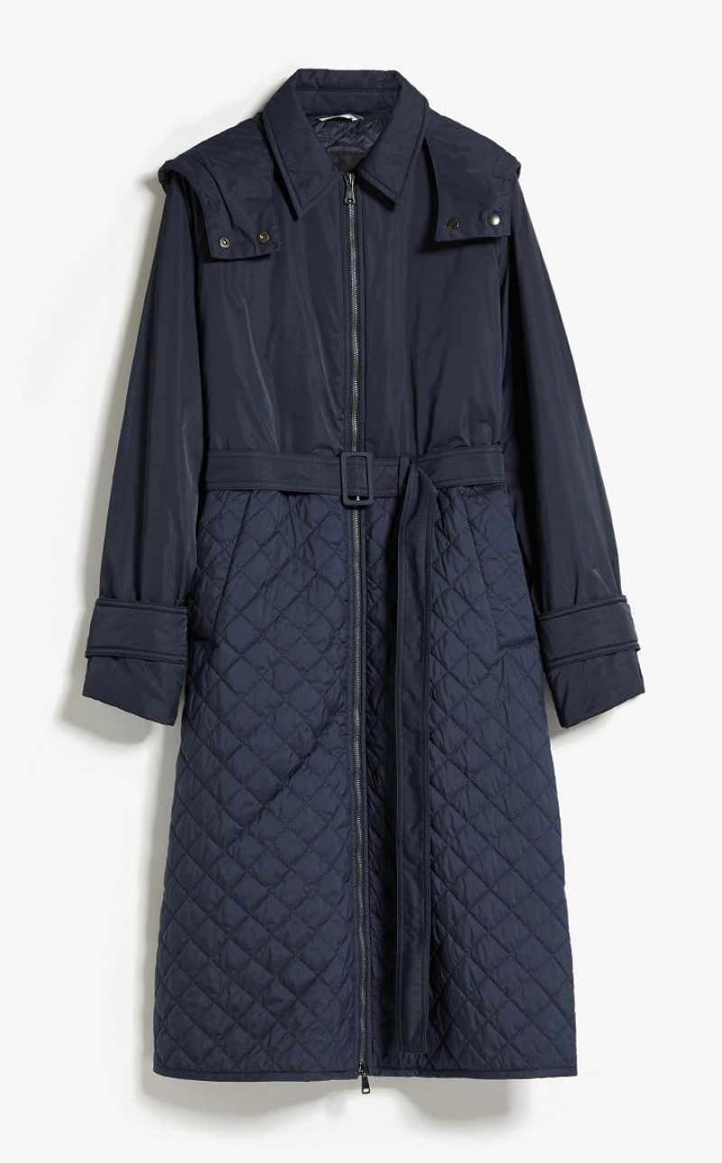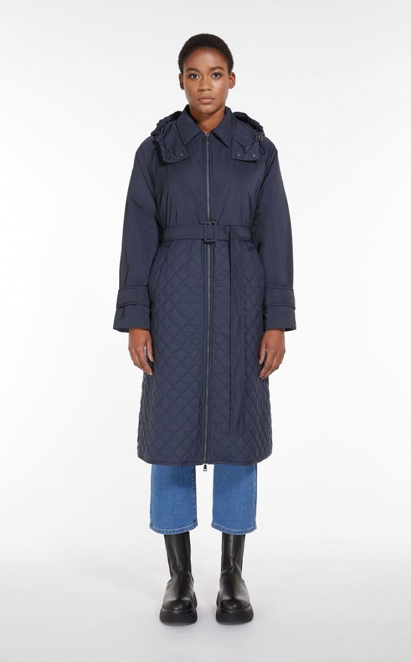 Padded midi-length coat in showerproof fabric, featuring a quilted design with small diamonds on the lower part of the garment. Features a removable hood, shirt-style collar, raglan sleeves with adjustable tabs and slanted pockets on the sides. Fastening with exposed zip and matching belt to emphasise the waistline.