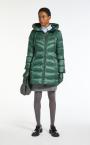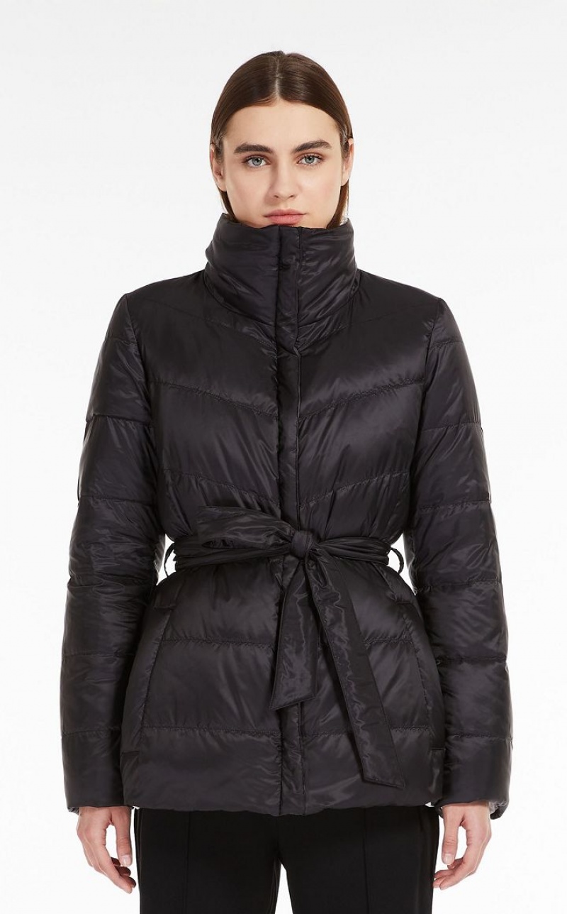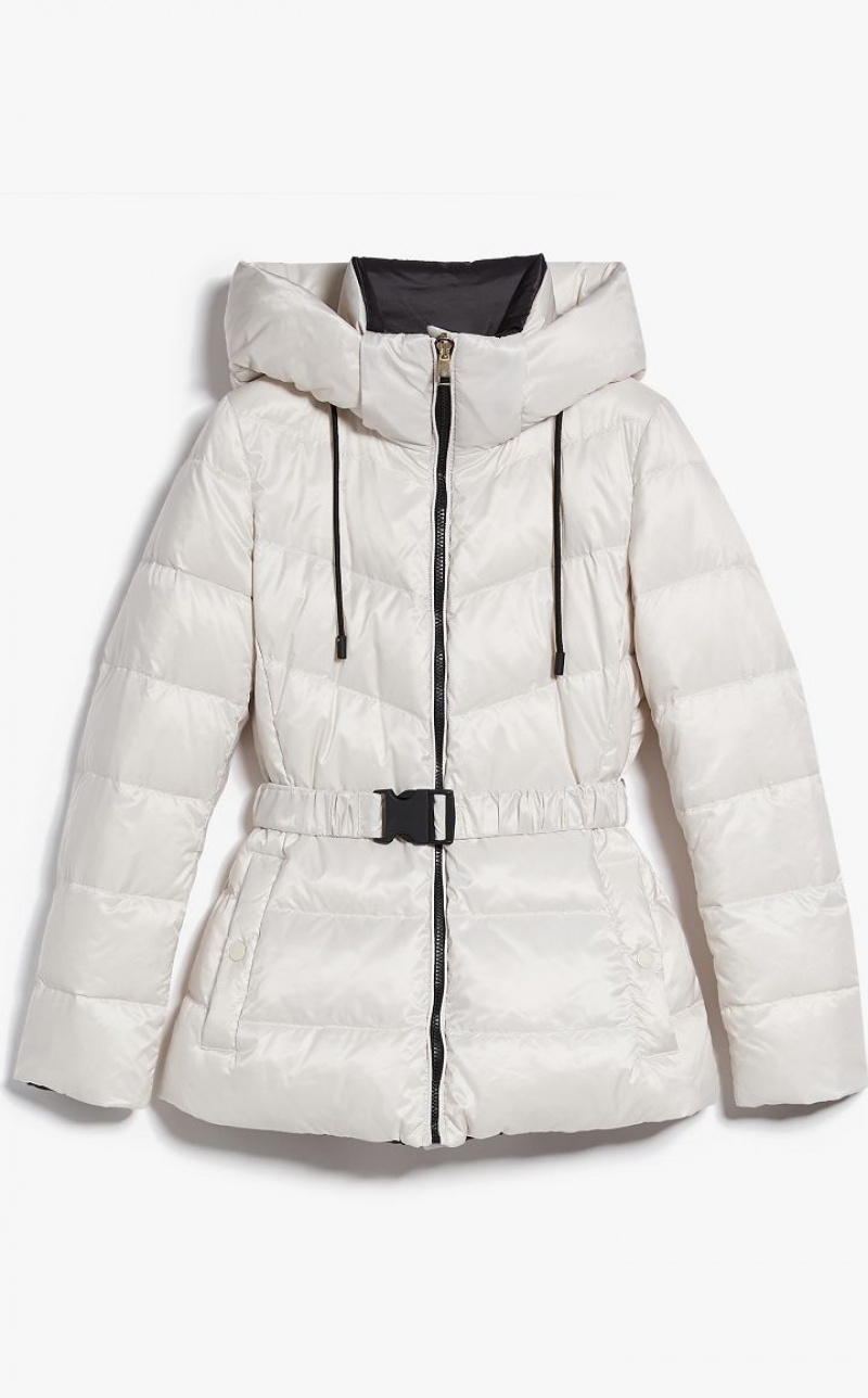 Reversible down jacket in water repellent canvas featuring 80 g goose down padding. Removable hood embellished collar, long sleeves, press stud fastening welt pockets and an elasticated waist belt, complete with a side release buckle. The garment comes with a second smooth fabric belt. Concealed zip fastening. Length: 70 cm.