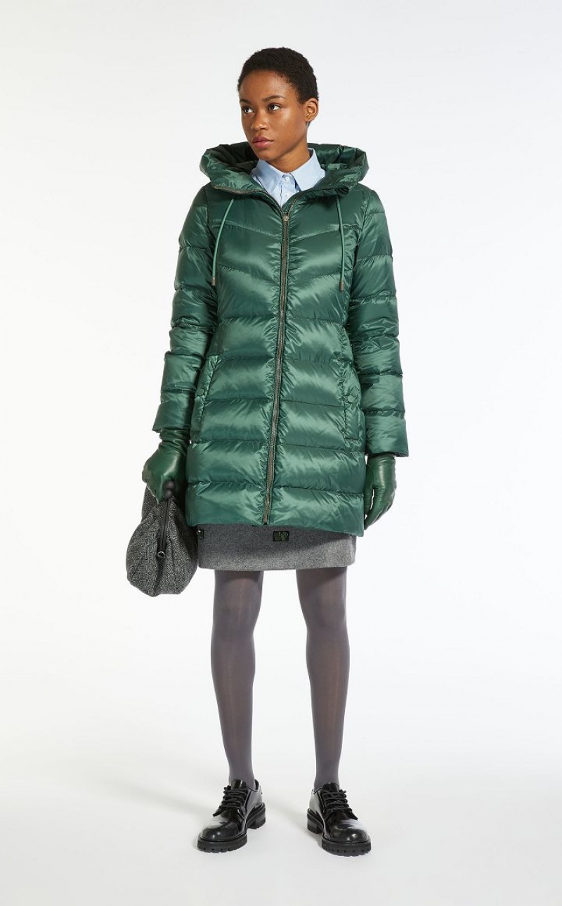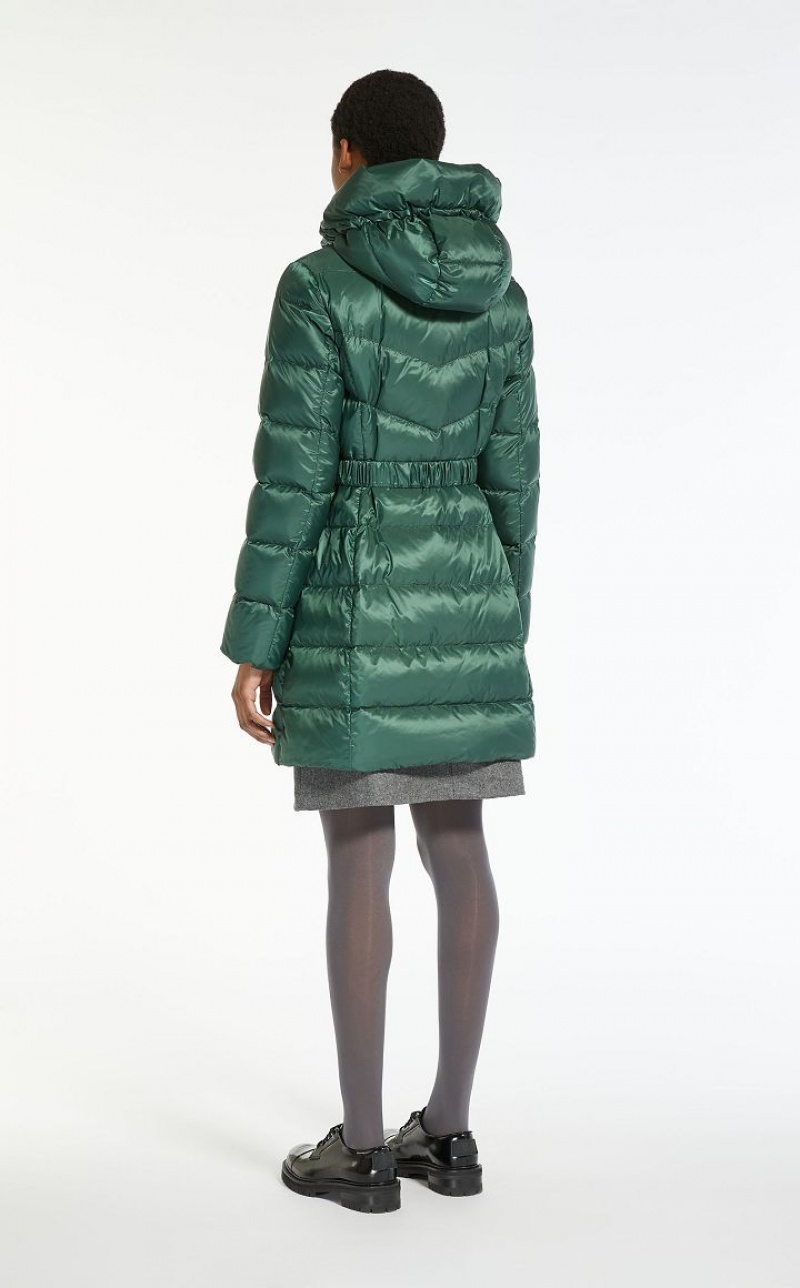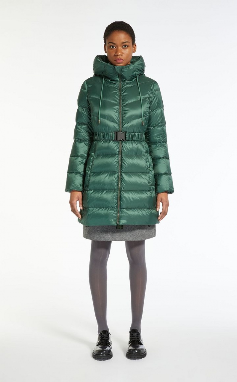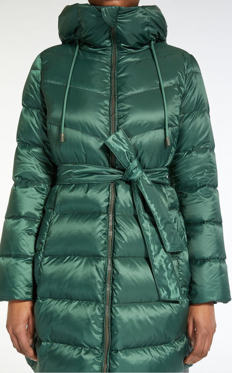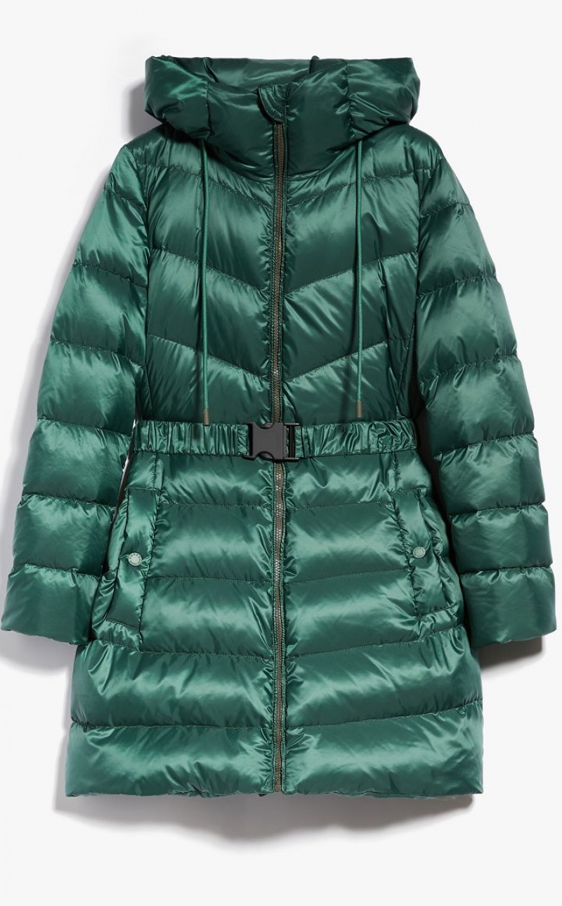 Water repellent canvas down jacket featuring 80 g goose down padding and topstitching detail. Drawstring adjustable hood, knit storm cuff embellished long sleeves, welt pockets and an elasticated belt, complete with a side release buckle. The garment also comes with a second matching belt. Press stud fastening.