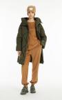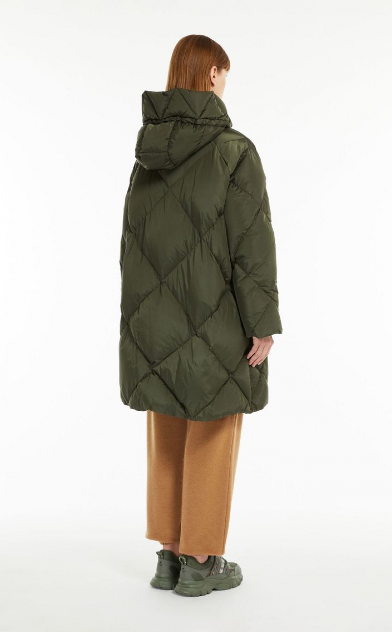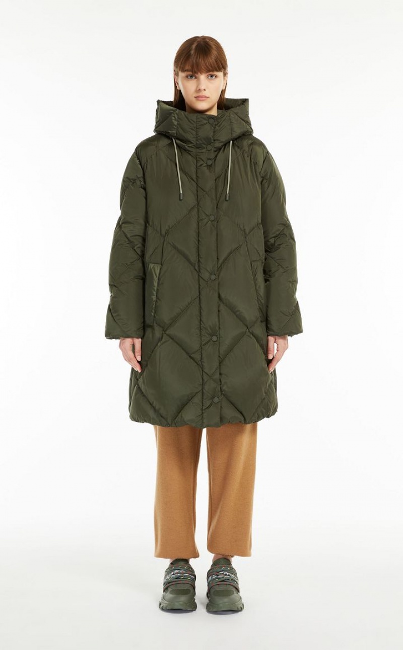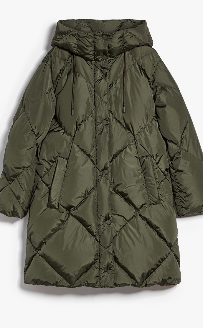 Quilted down jacket in water repellent taffeta fabric featuring 100 g goose down padding. Adjustable hood embellished collar, long sleeves and welt pockets. Zip and press stud fastening. Length: 95 cm.