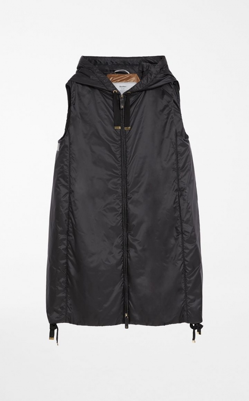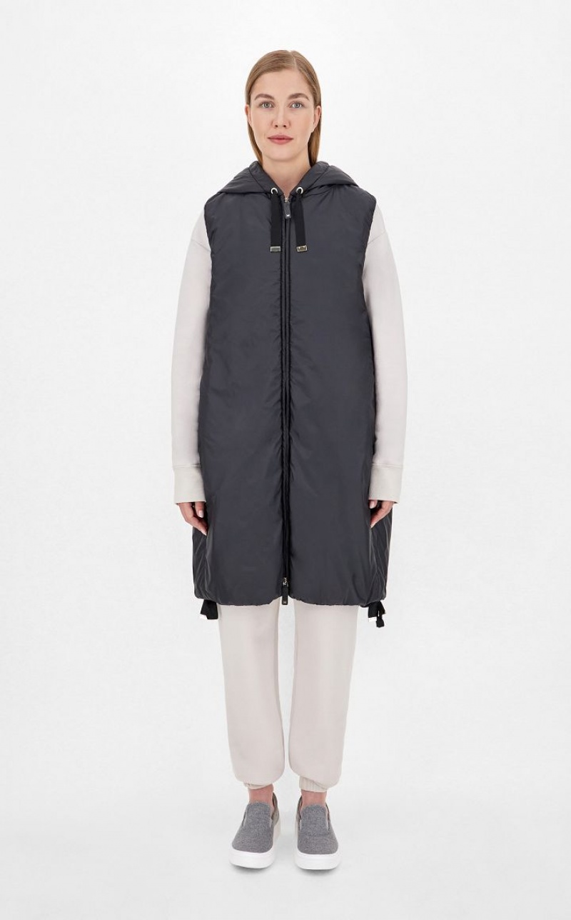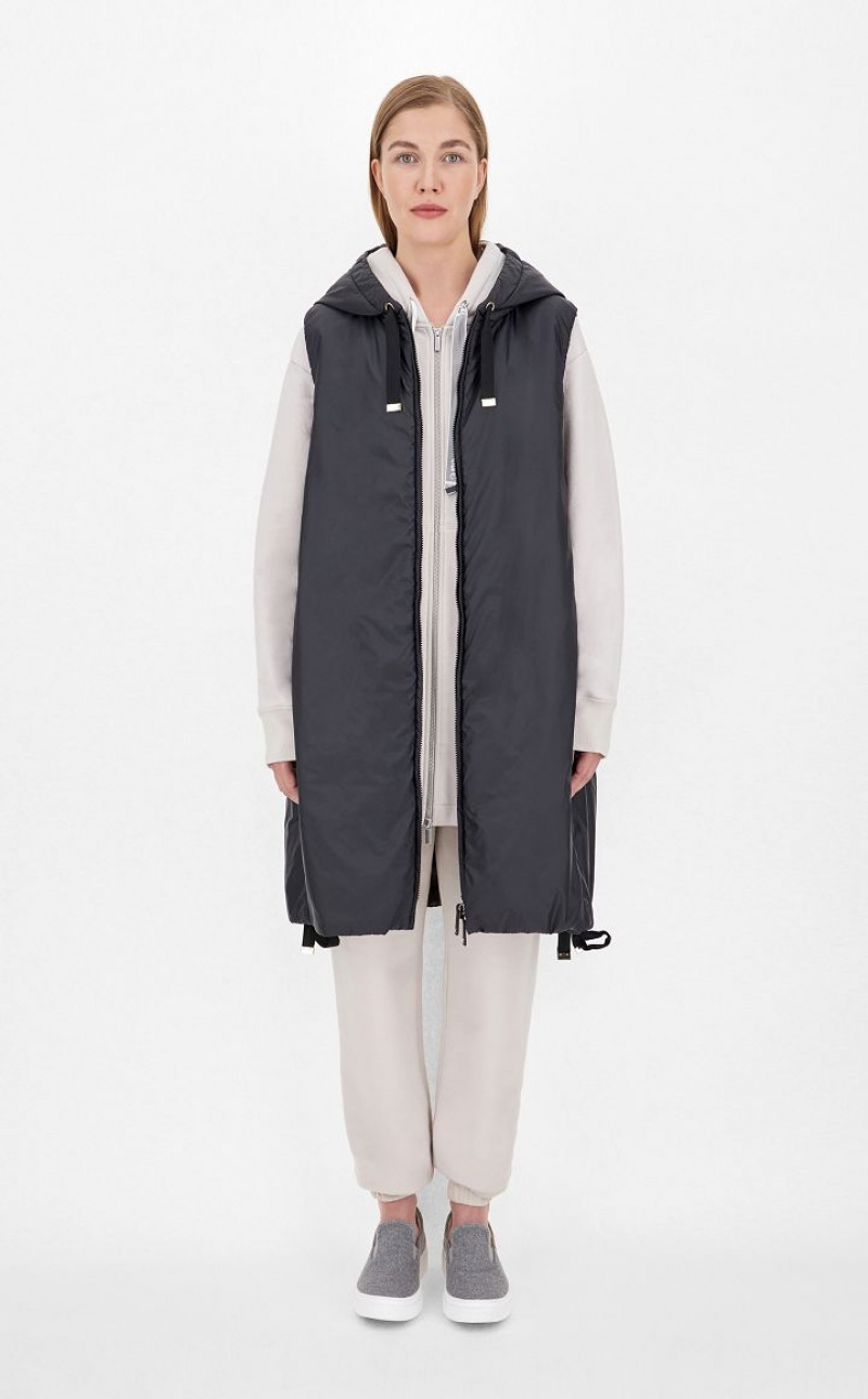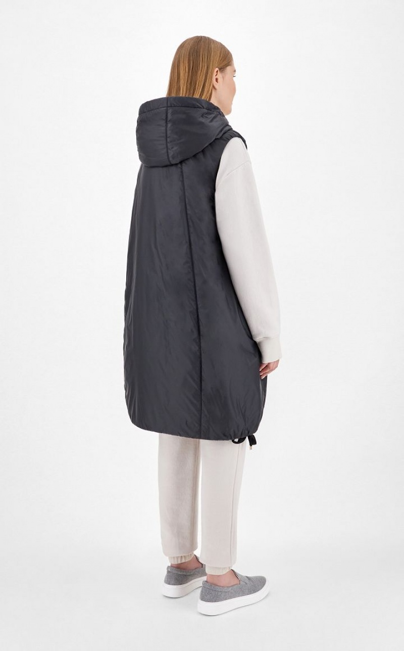 Midi gilet in water-resistant technical fabric with drawstring hood and inseam side pockets. Finished with drawstring hem and zip fastening. This style features Cameluxe padding: a new frontier for upcycling processes that involves recovering leftover pure camel cut-offs from the production of our legendary coats. The fabrics are reused to create a special padding capable of maintaining the same thermal insulation properties as virgin materials, without the need for further consumption of raw materials.