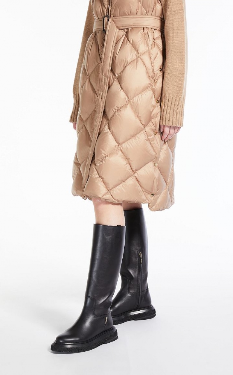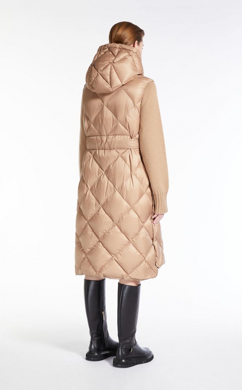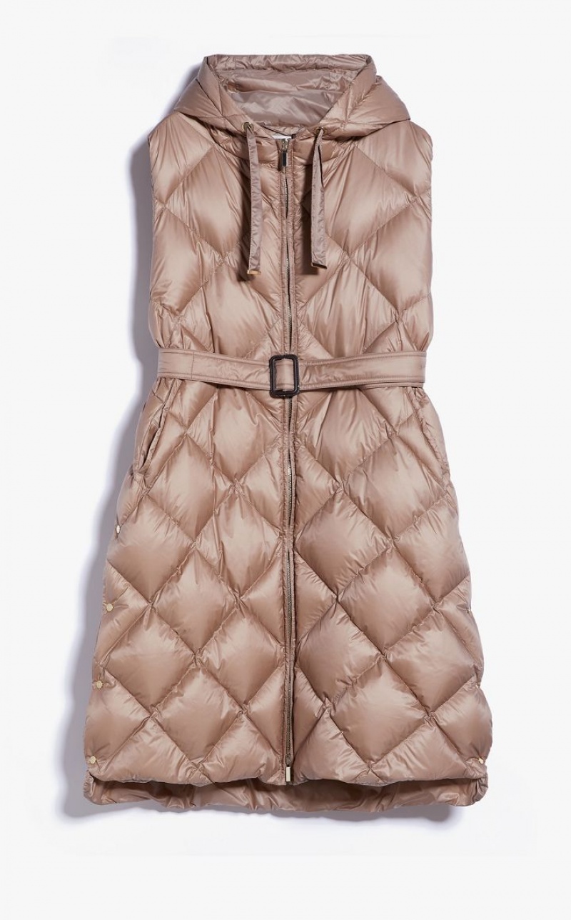 Midi goose down gilet made of water-resistant, iridescent technical fabric, with an all-over diamond-quilted motif, drawstring hood and welt pockets. Featuring a martingale at the back of the waist, side slits with visible metal snap-buttons and a matching fabric belt with a buckle. This model can be customised with accessories from The Cube collection. Accessories sold separately. Length: 106 cm.