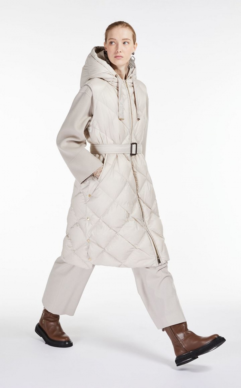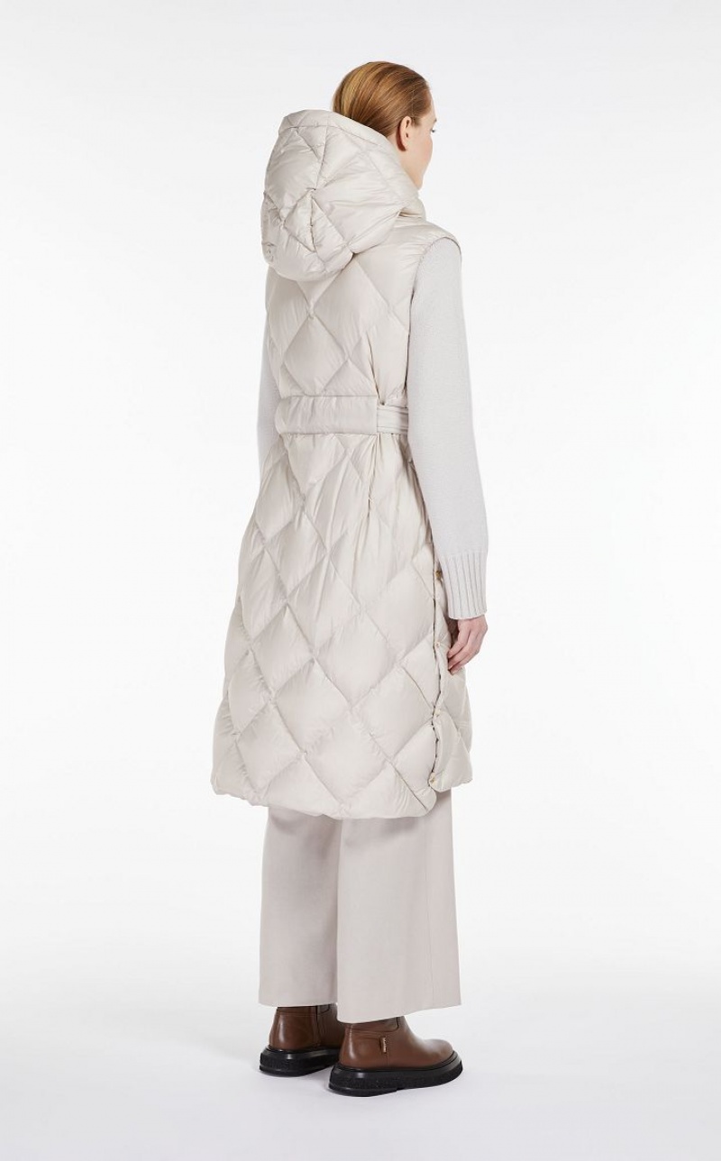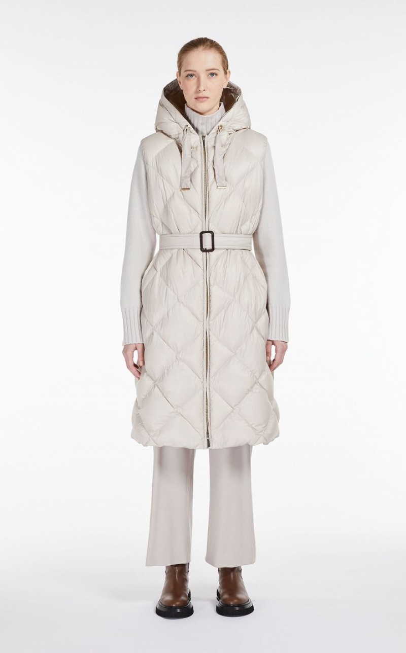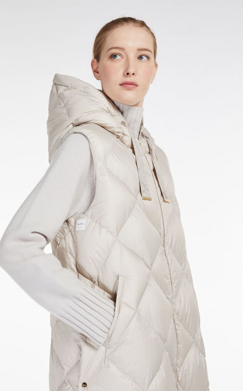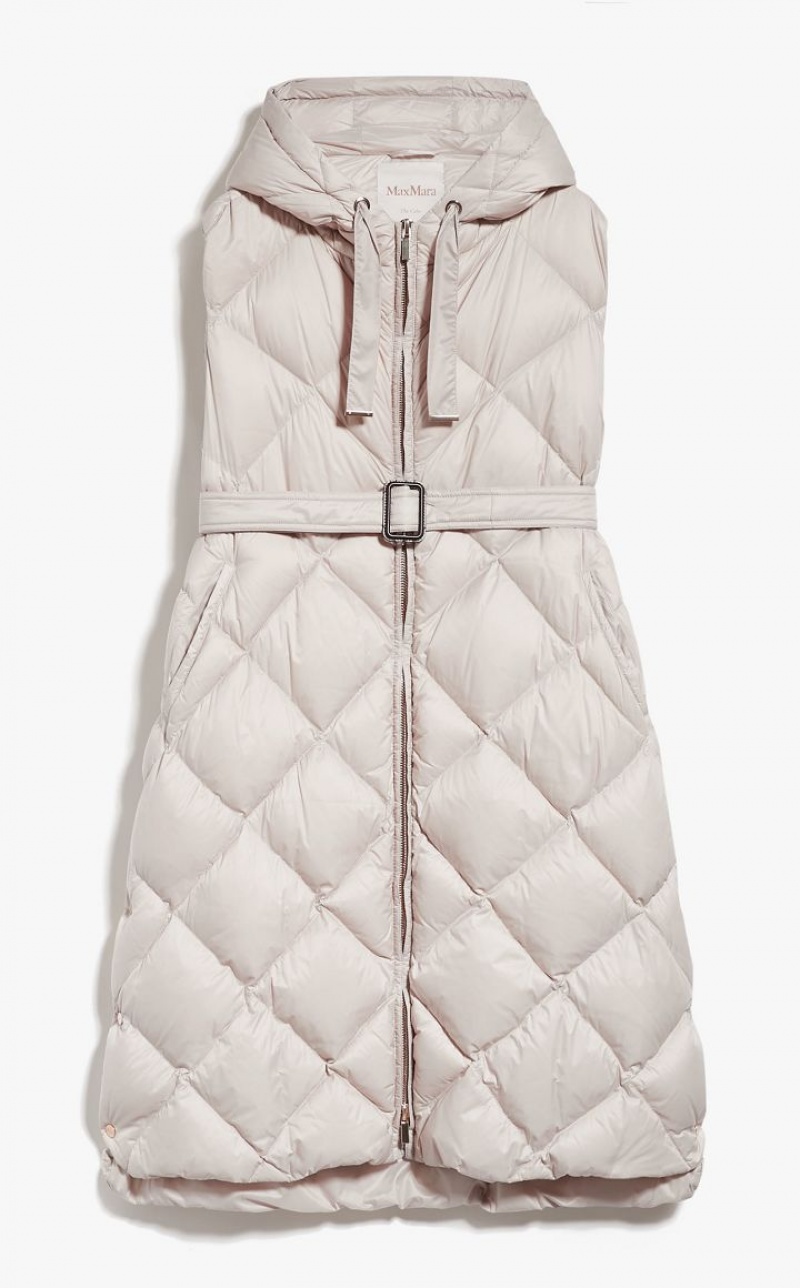 Midi goose down gilet made of water-resistant, iridescent technical fabric, with an all-over diamond-quilted motif, drawstring hood and welt pockets. Featuring a martingale at the back of the waist, side slits with visible metal snap-buttons and a matching fabric belt with a buckle. This model can be customised with accessories from The Cube collection. Accessories sold separately. Length: 106 cm.