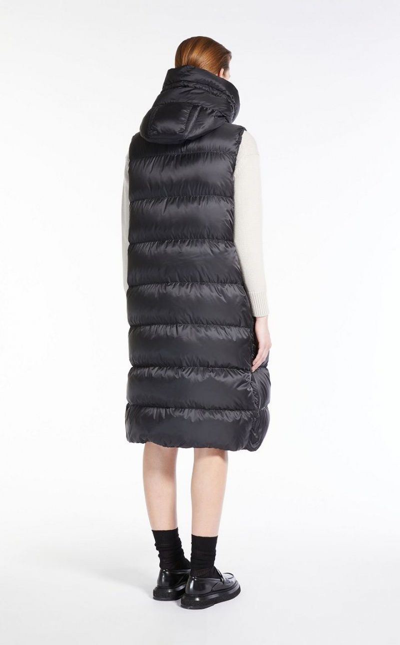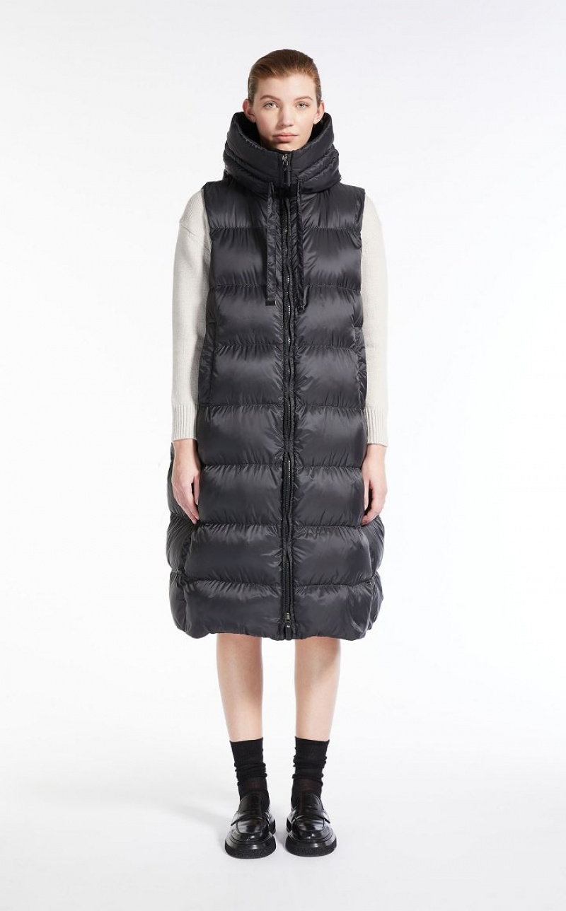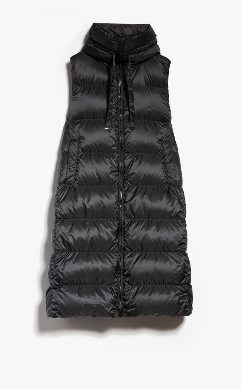 Long gilet with hood made of water-resistant Upcycling technical canvas, padded with goose down, finished with a drawstring hood, horizontal quilted pattern and welt pockets. Zip fastening and leather slider. Length: 106 cm.