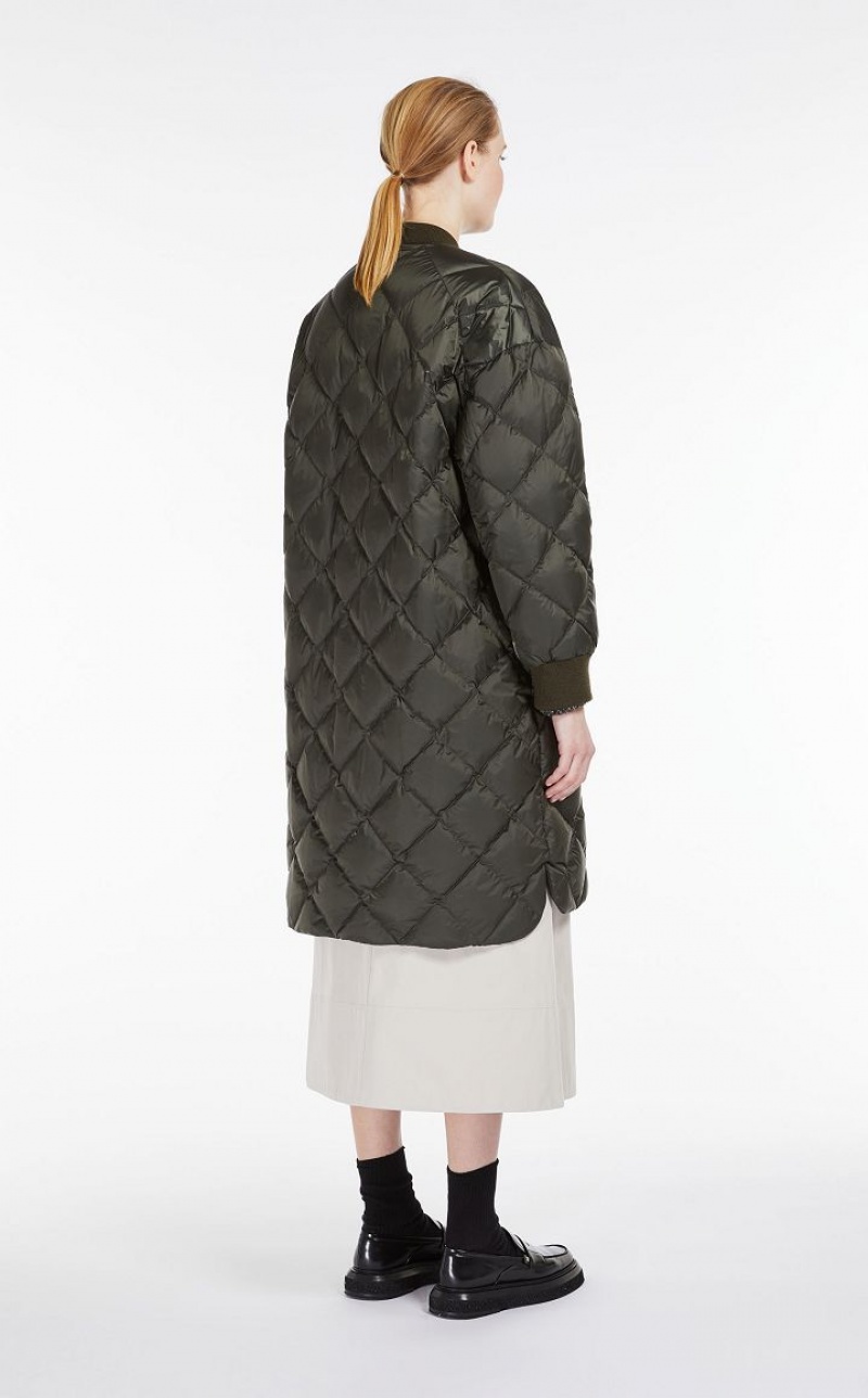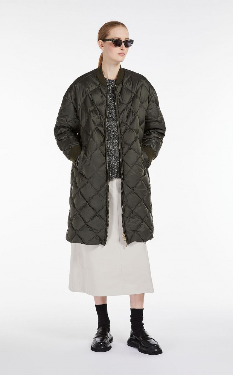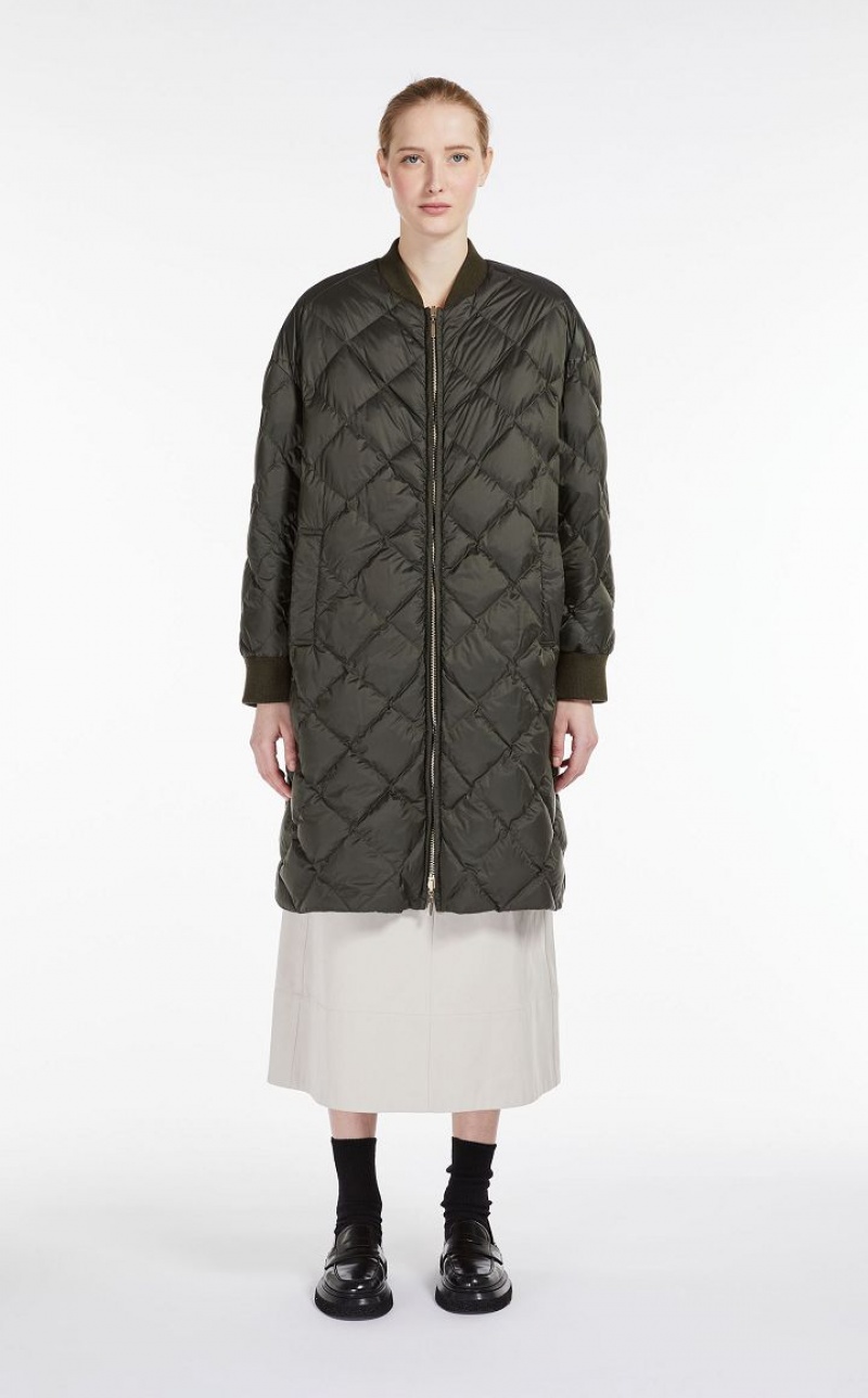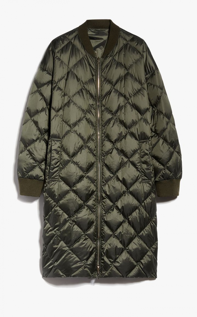 Long reversible bomber jacket in water-resistant technical canvas, padded with goose down, with a diamond-quilted motif on one side and smooth on the inside. The style features a rib-knit collar and cuffs and welt pockets on the sides. Visible metal zip fastening. Length: 106 cm.