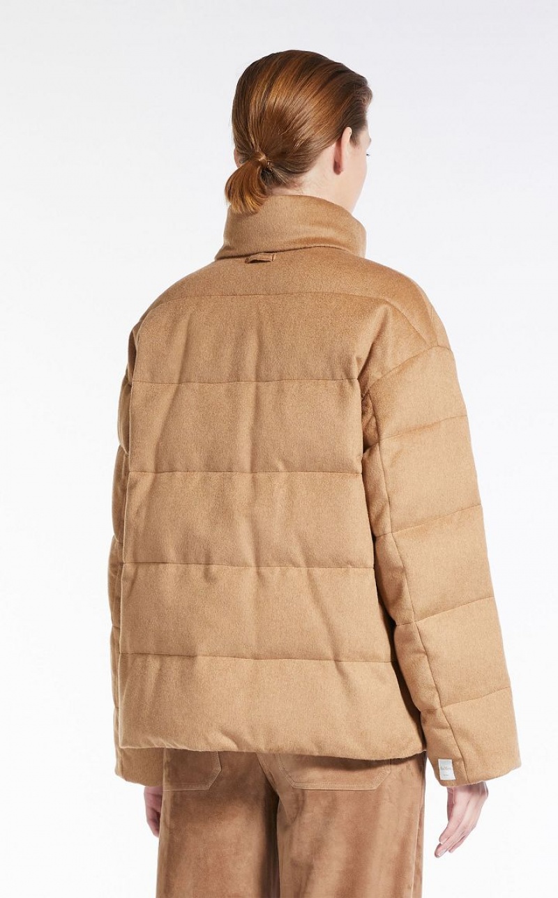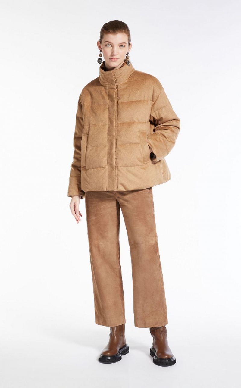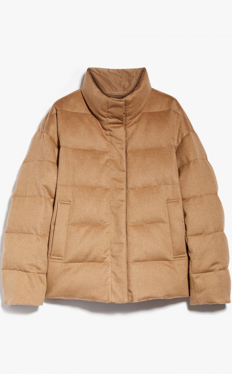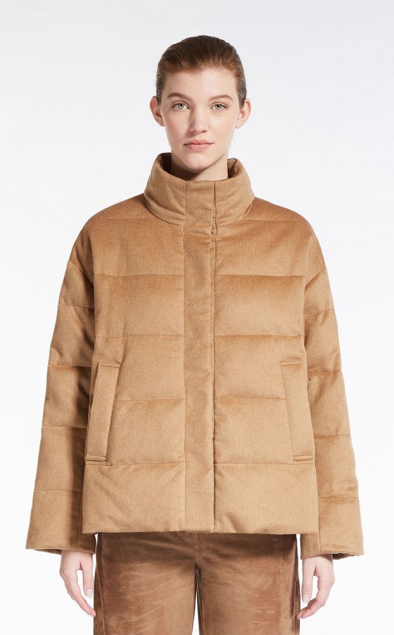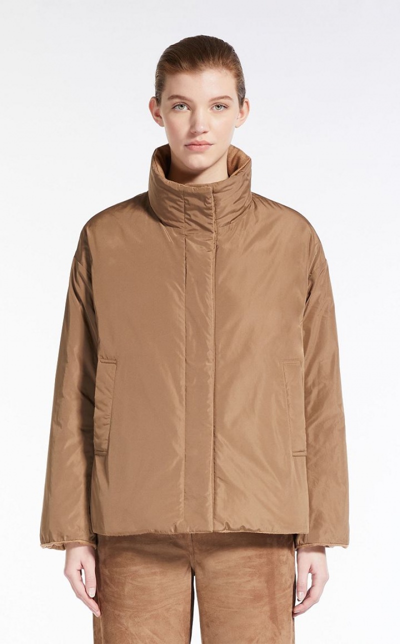 Reversible short down jacket in lightweight pure camel fabric featuring goose down padding, a high neck and welt pockets. The garment boasts horizontal quilting on one side and smooth water-repellent technical taffeta fabric on the other. Concealed press-stud fastening. Length: 65 cm.
