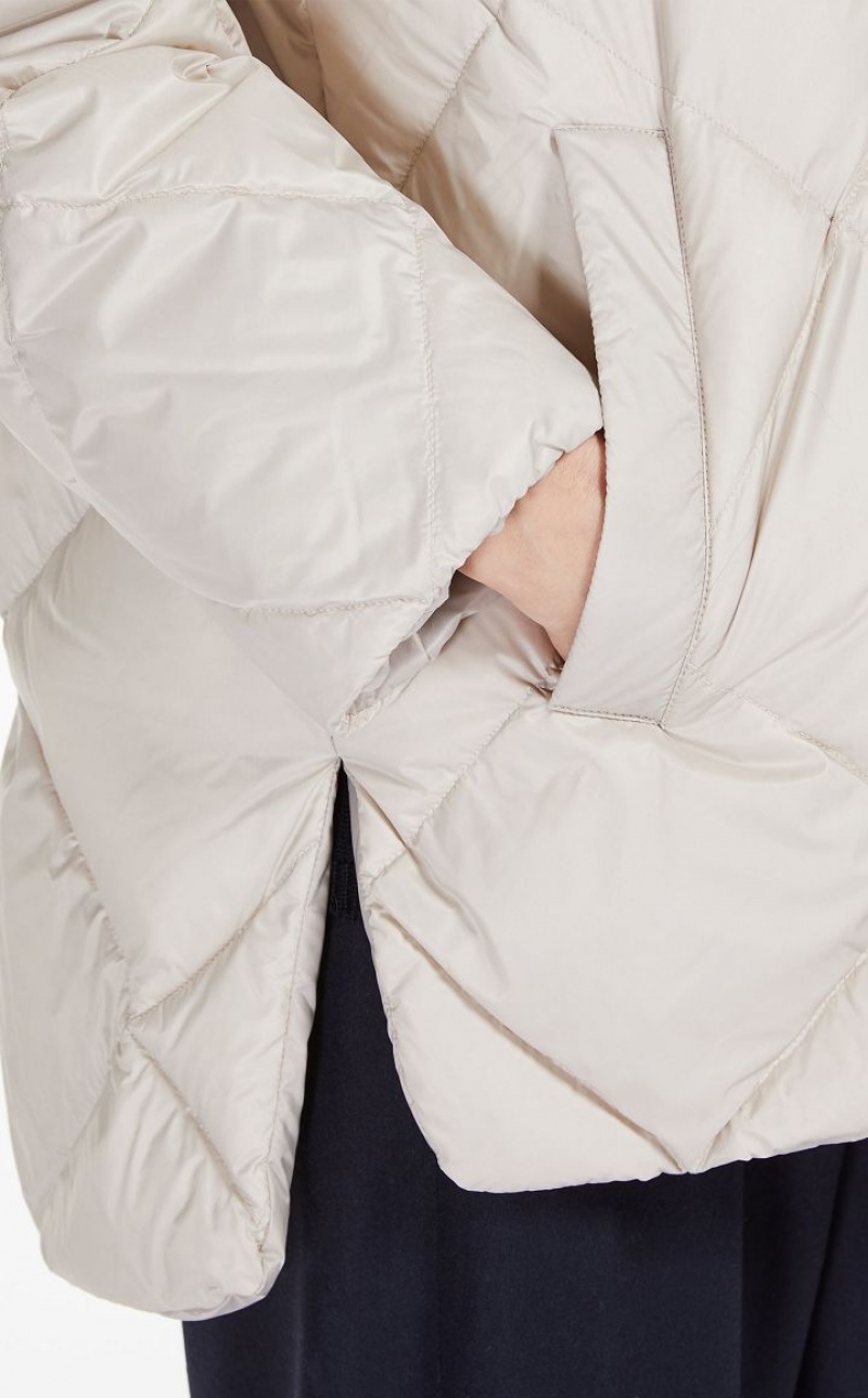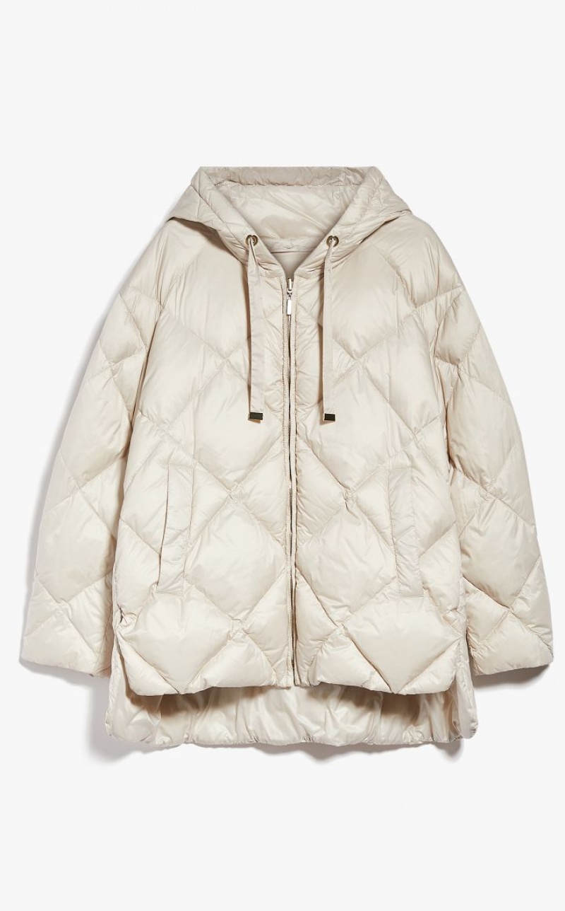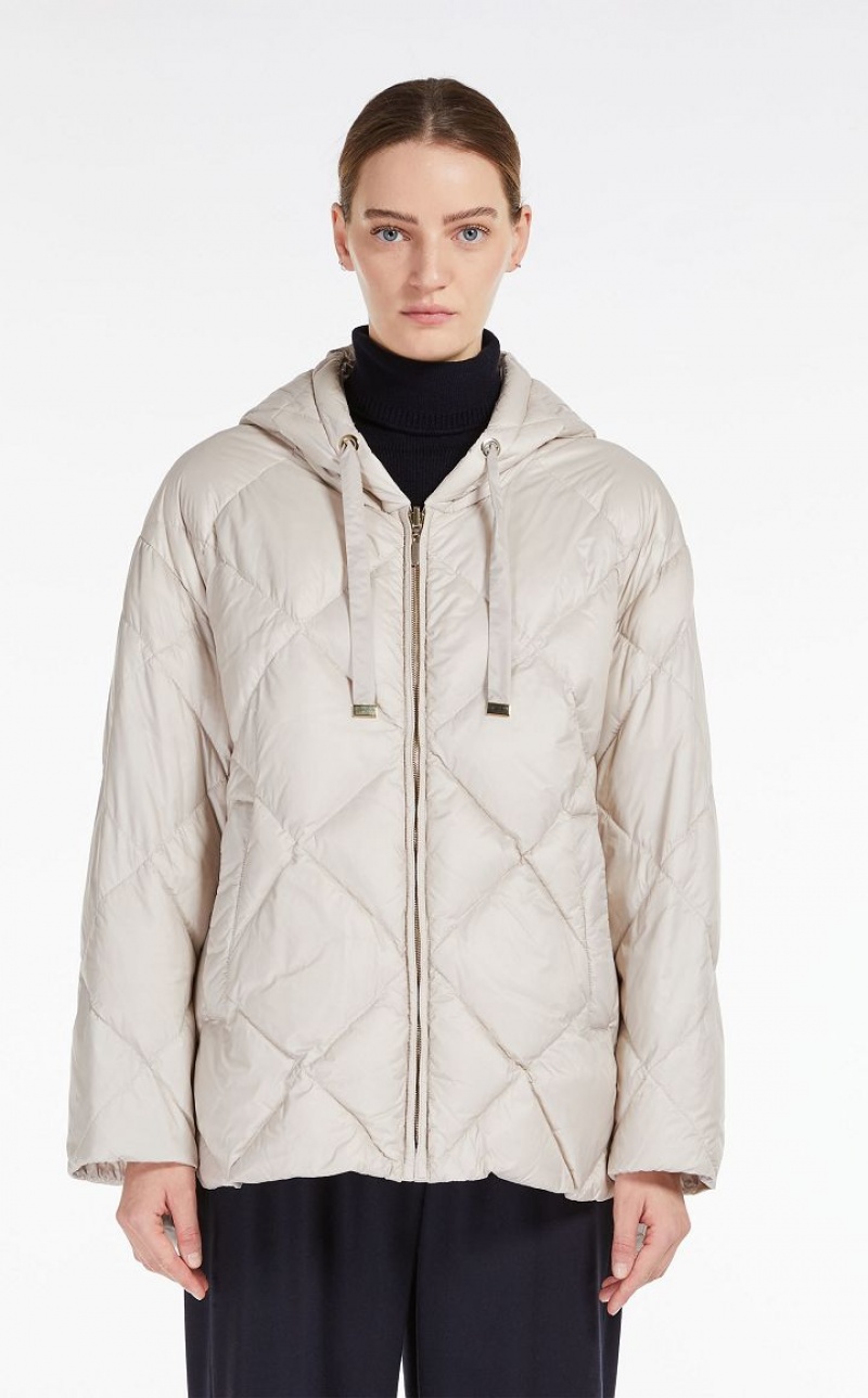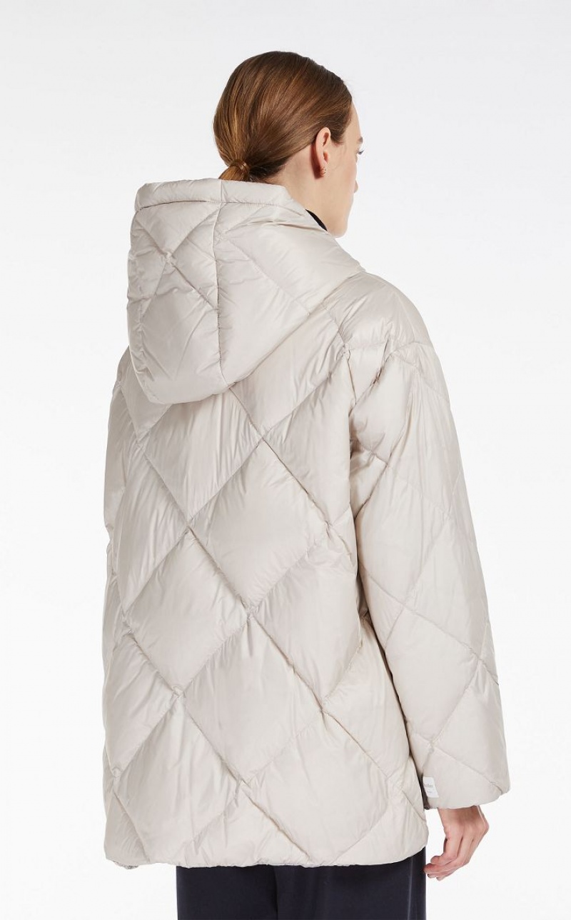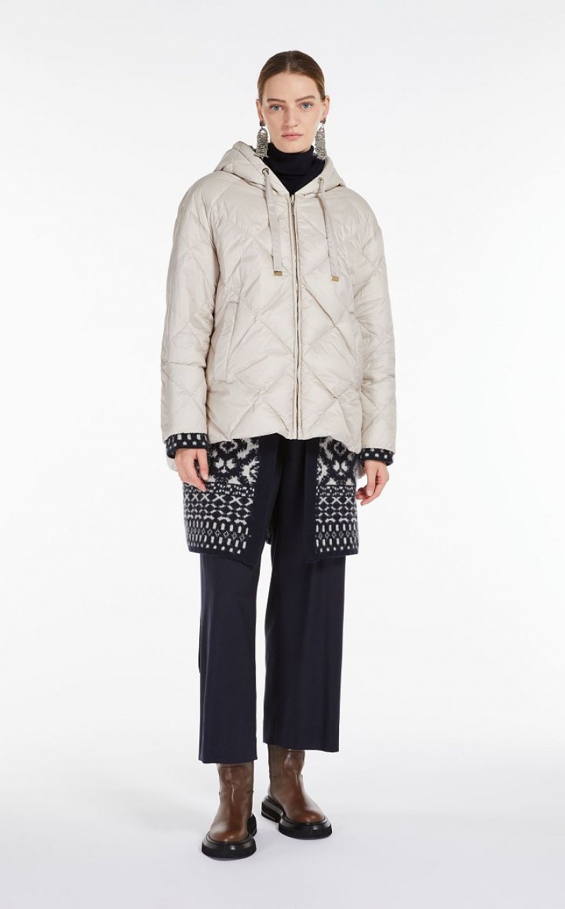 Short goose down reversible jacket made of water-resistant, iridescent technical canvas with a drawstring hood and welt pockets. One side is customised with a diamond-quilted pattern, the other is in smooth technical canvas. Asymmetrical hem, slightly longer at the back, with small side slits. Metal zip fastening. Length: 75 cm.