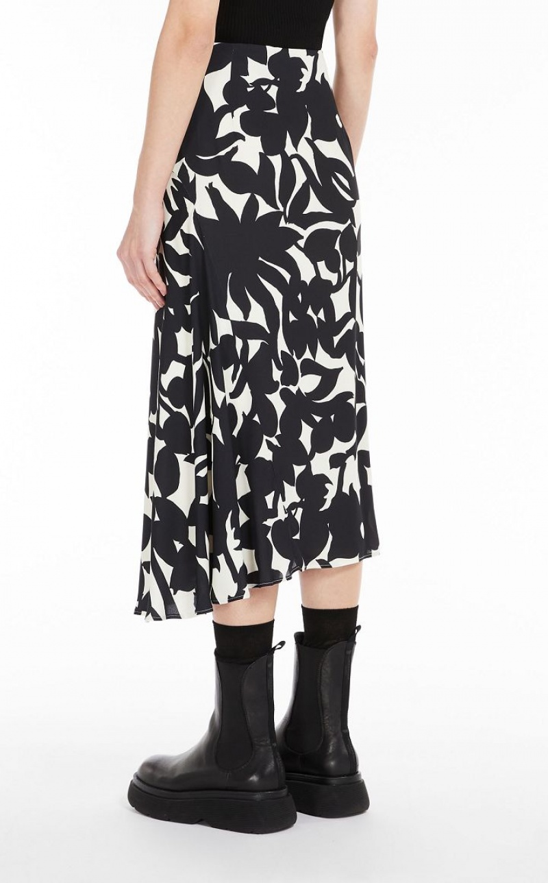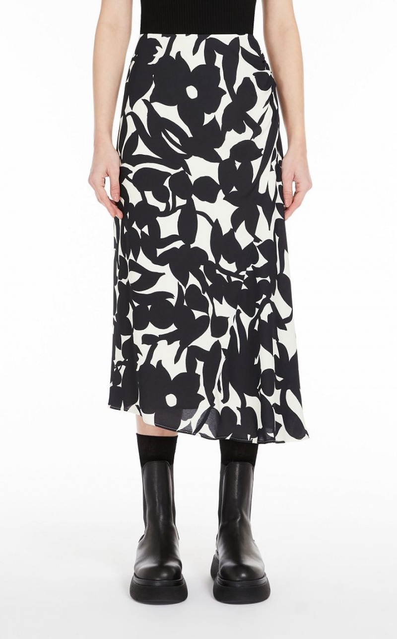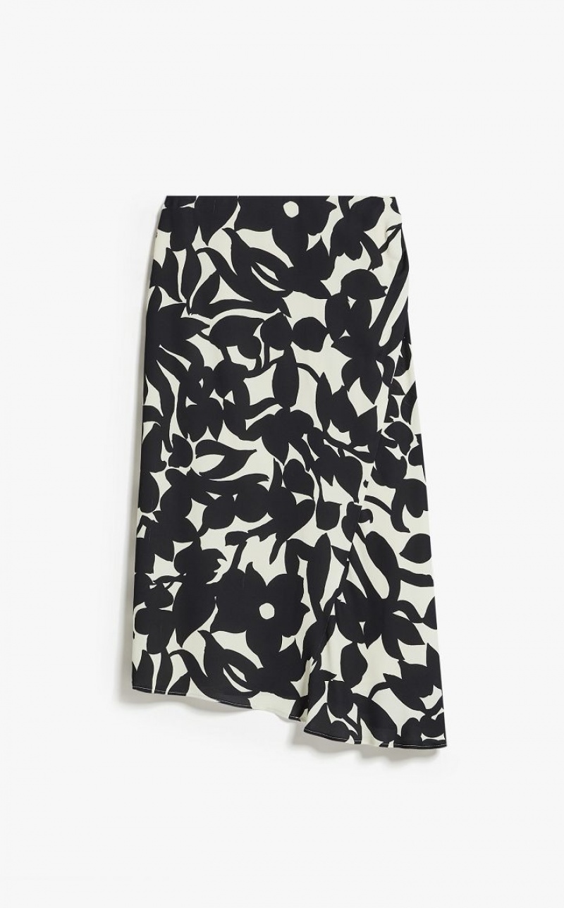 Long skirt with asymmetrical hem in elegant double viscose georgette, with all-over print motif. Lined style with a draped silhouette, enriched with gathering on the hip and a side panel. Side zip fastening. Length: 78 cm.