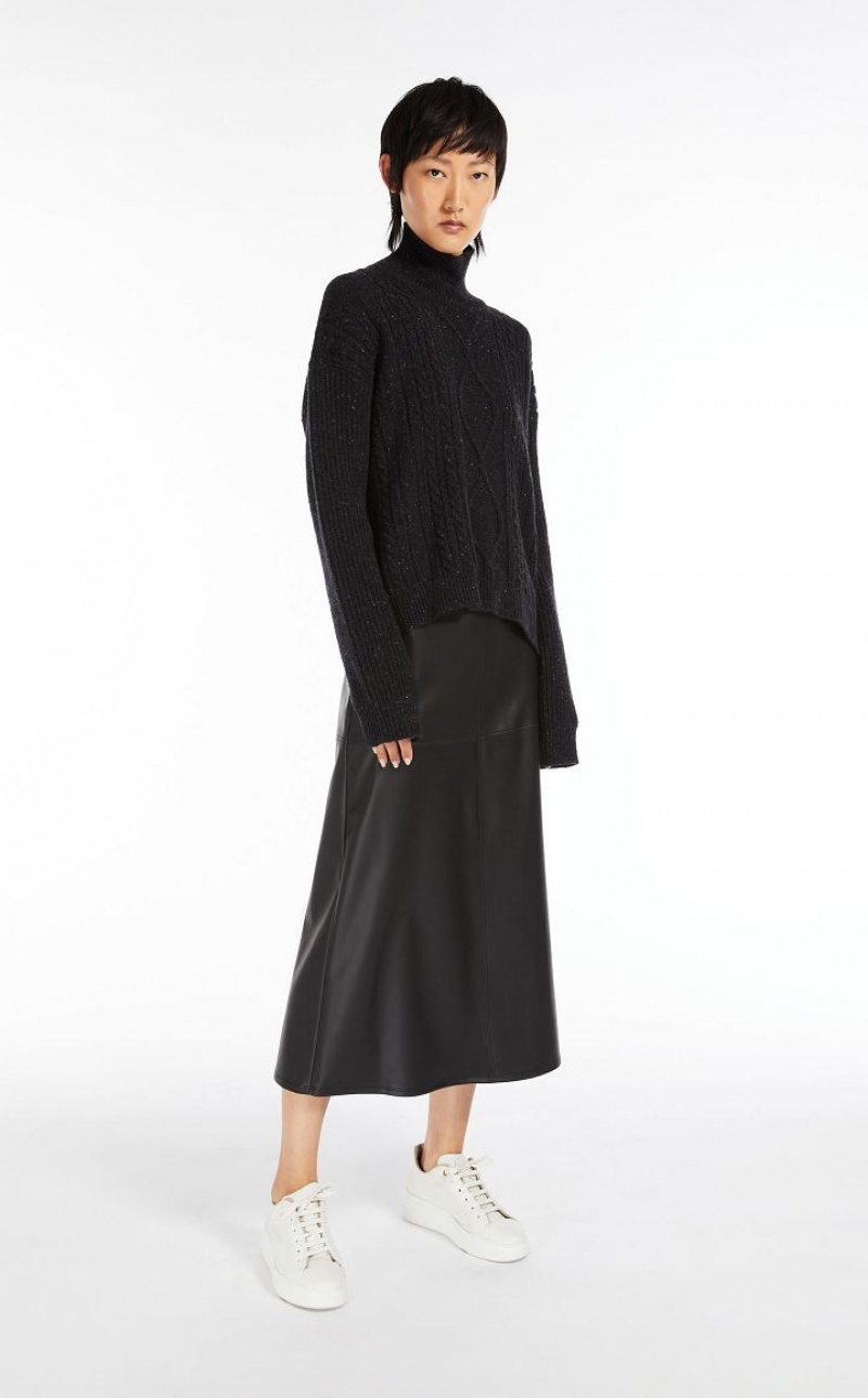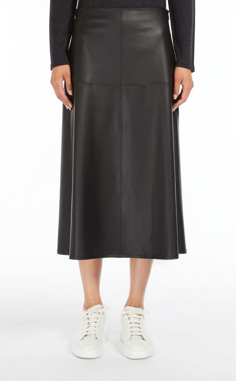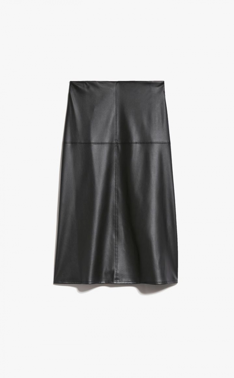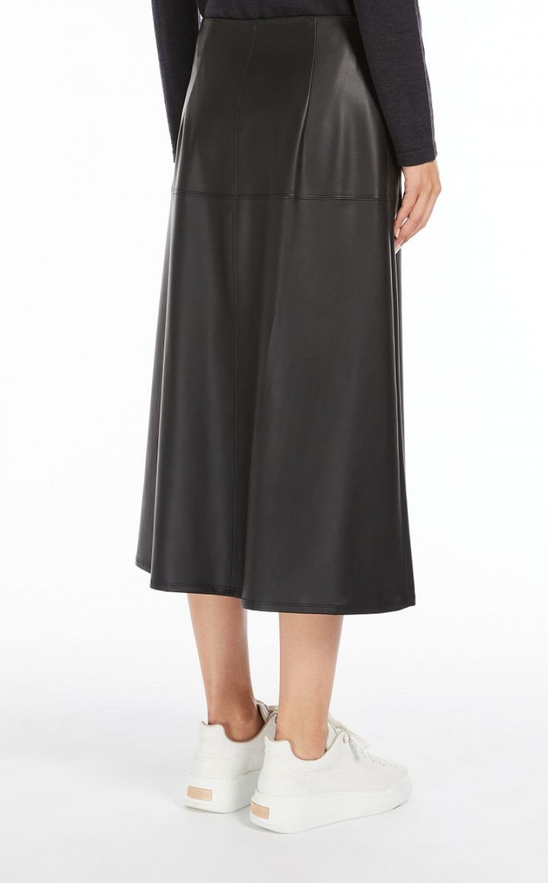 Midi skirt in coated jersey, featuring a high-waisted silhouette with a flared line. Side zip fastening. Length: 80 cm.