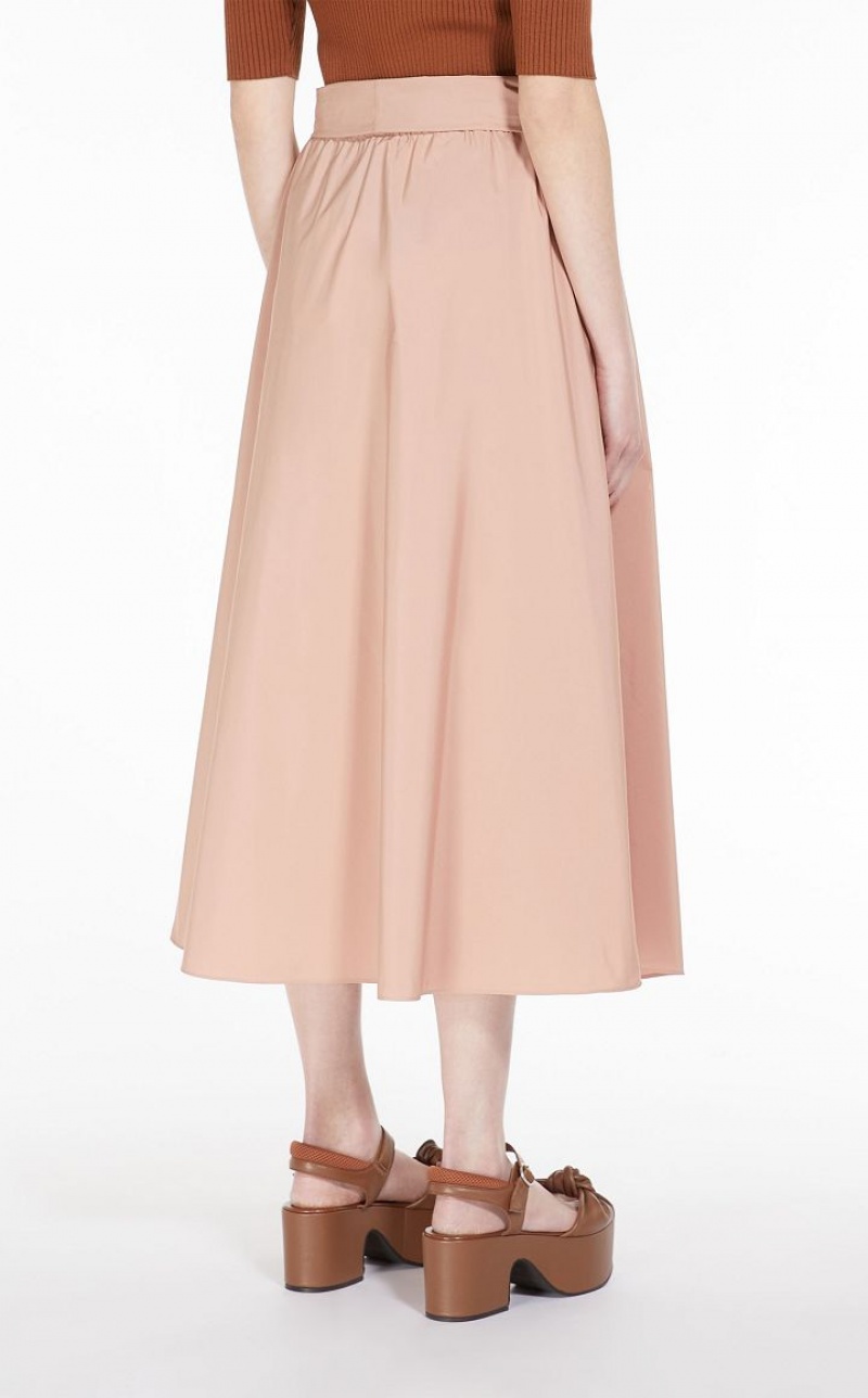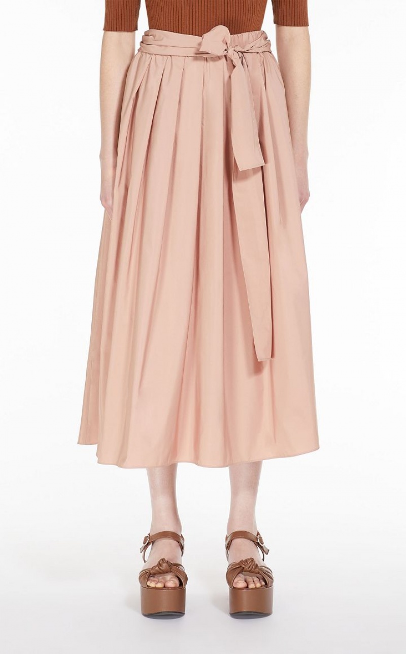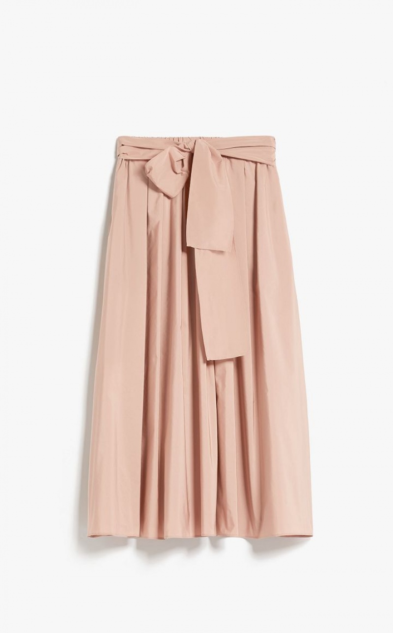 Long, full skirt in lightweight taffeta, with pleating on the front and an elasticated waist for a comfortable fit. This style is trimmed with side pockets and a coordinating sash that ties on the side to accentuate the waist. Side fastening with zip. Length: 85 cm.
