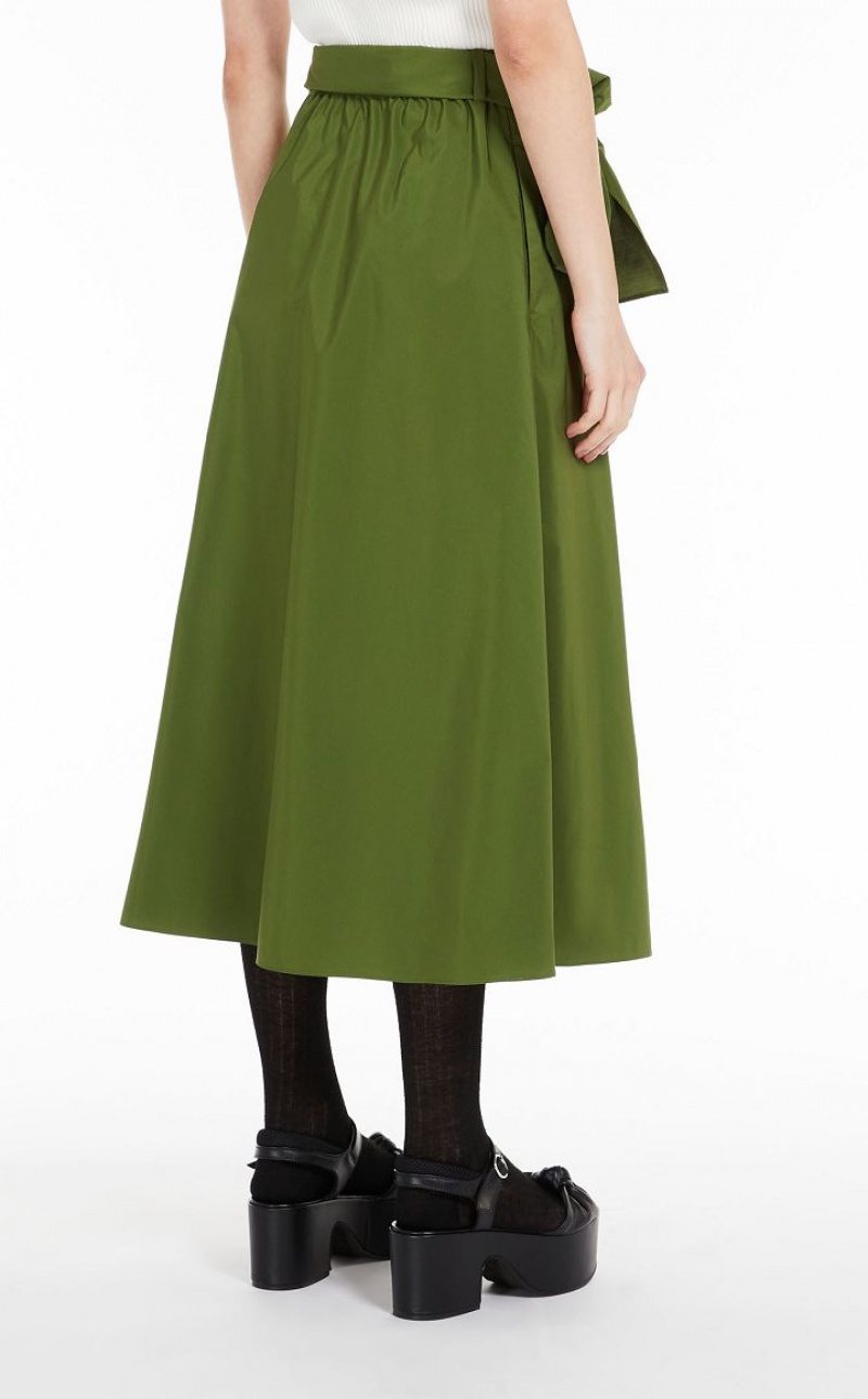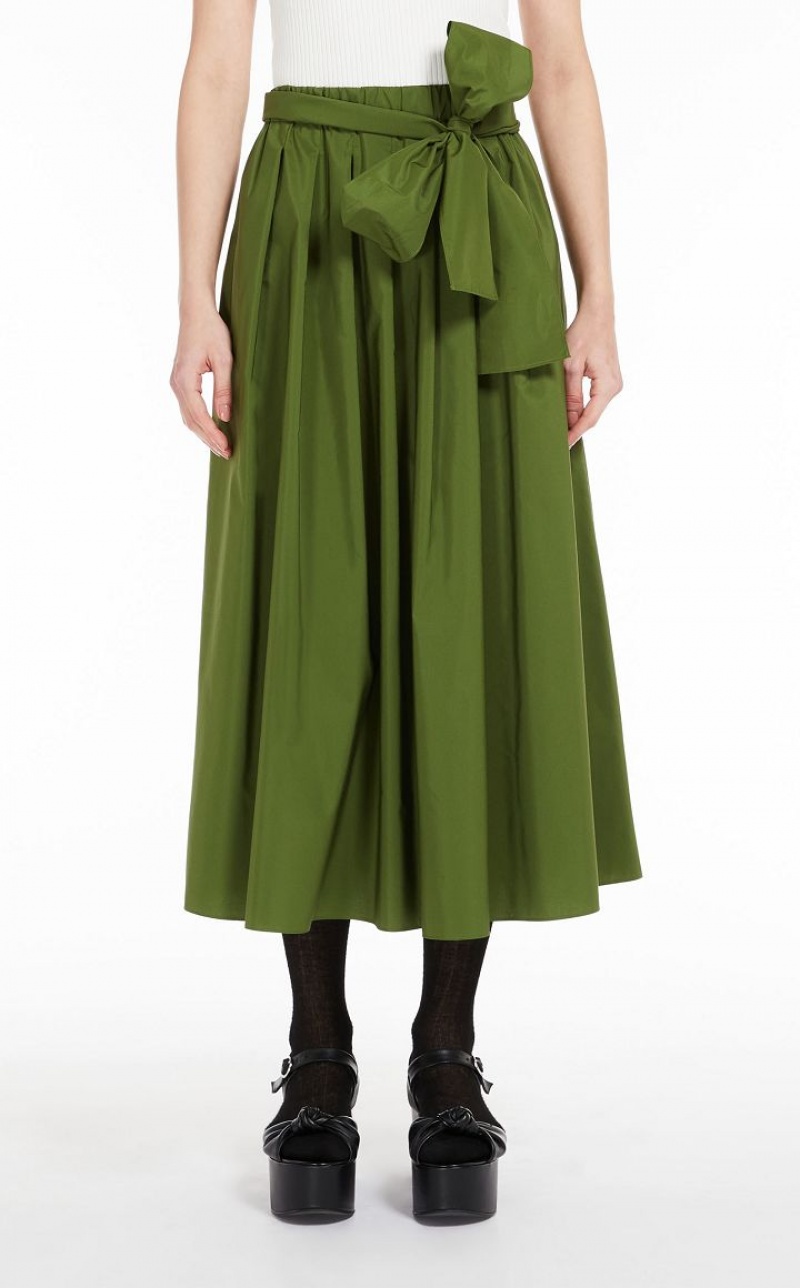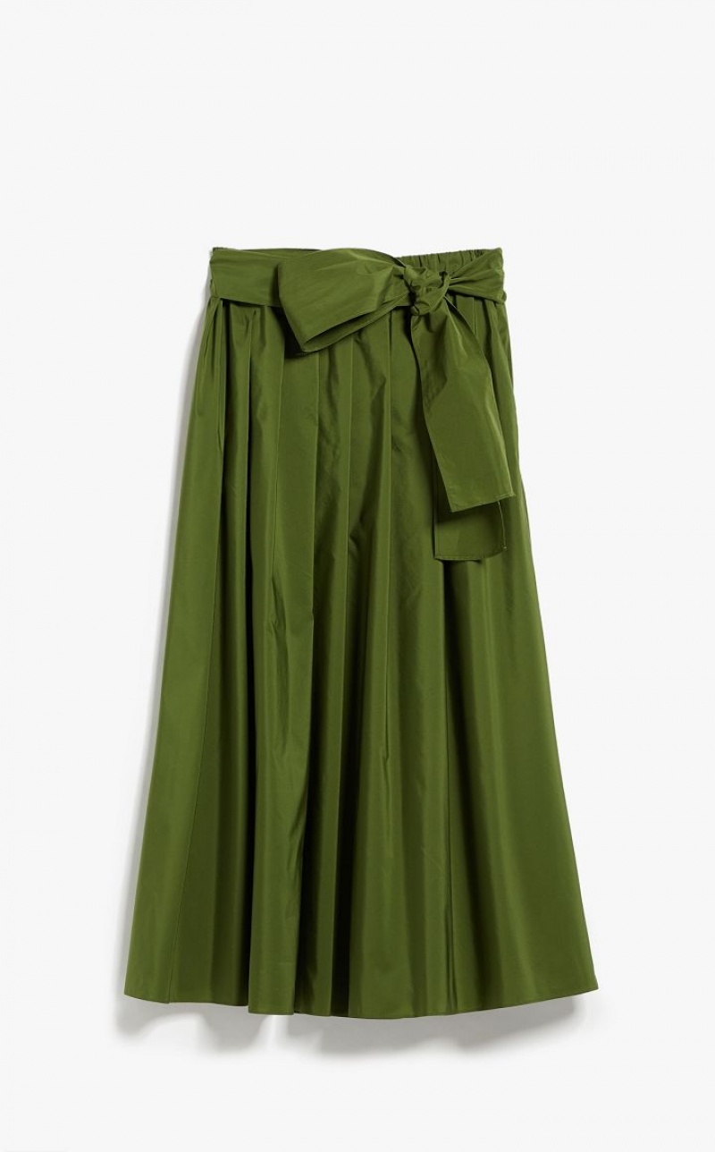Long, full skirt in lightweight taffeta, with pleating on the front and an elasticated waist for a comfortable fit. This style is trimmed with side pockets and a coordinating sash that ties on the side to accentuate the waist. Side fastening with zip. Length: 85 cm.
