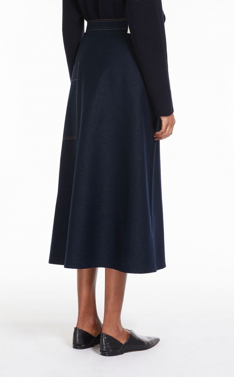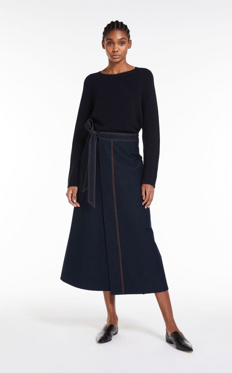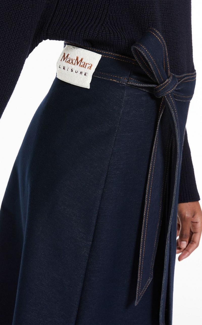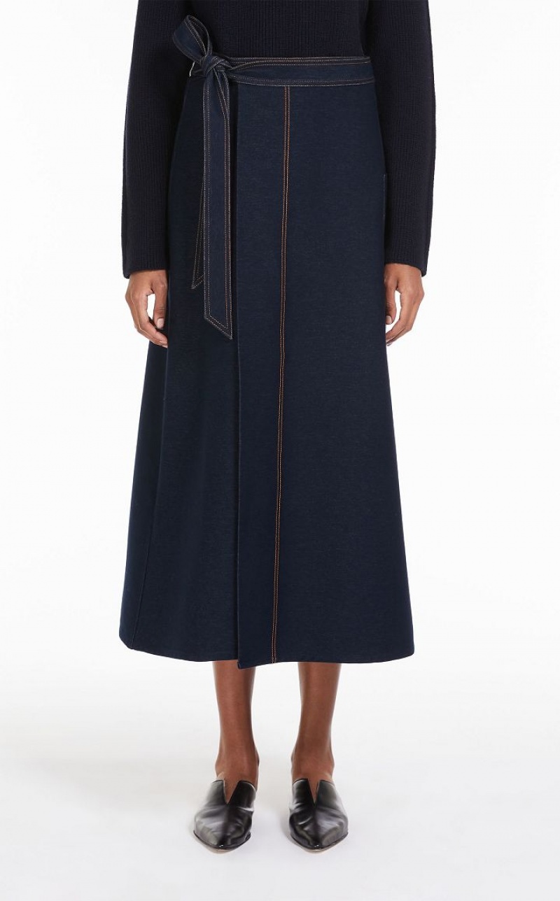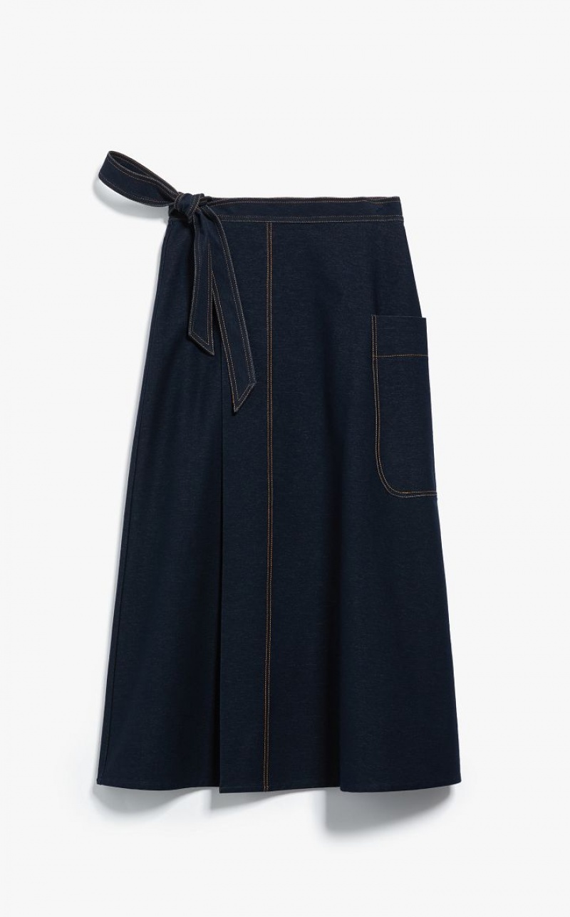 Jersey denim wrap skirt with a flared fit and a pocket on the left side. Embellished with contrasting topstitching. Fastening with a ribbon at the waist that ties on the side and internal button. Length: 90 cm