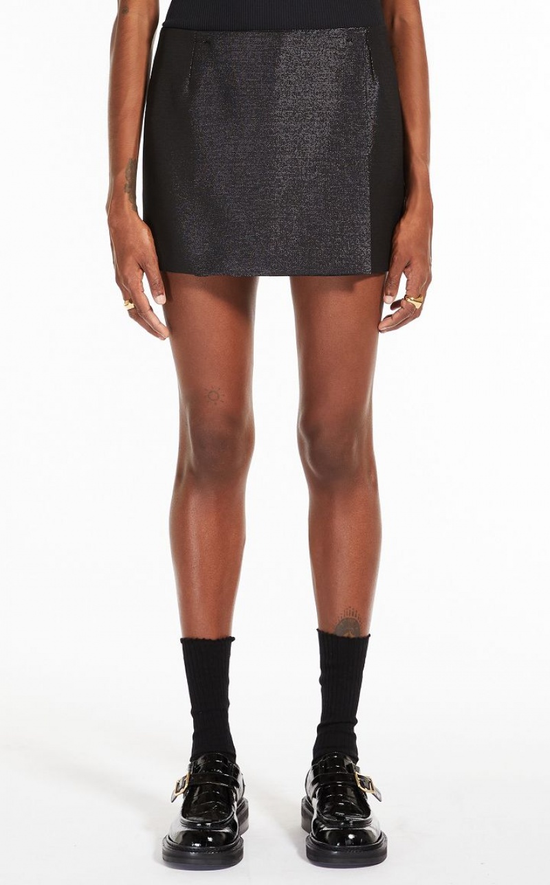 Wrap-around low-waisted miniskirt. For look of stylish simplicity, the skirt is designed without a waistband but with darts that contour the figure. Made of wool-blend basketweave fabric with a metallic effect and glistening finish, it opens on the side with concealed metal buttons.