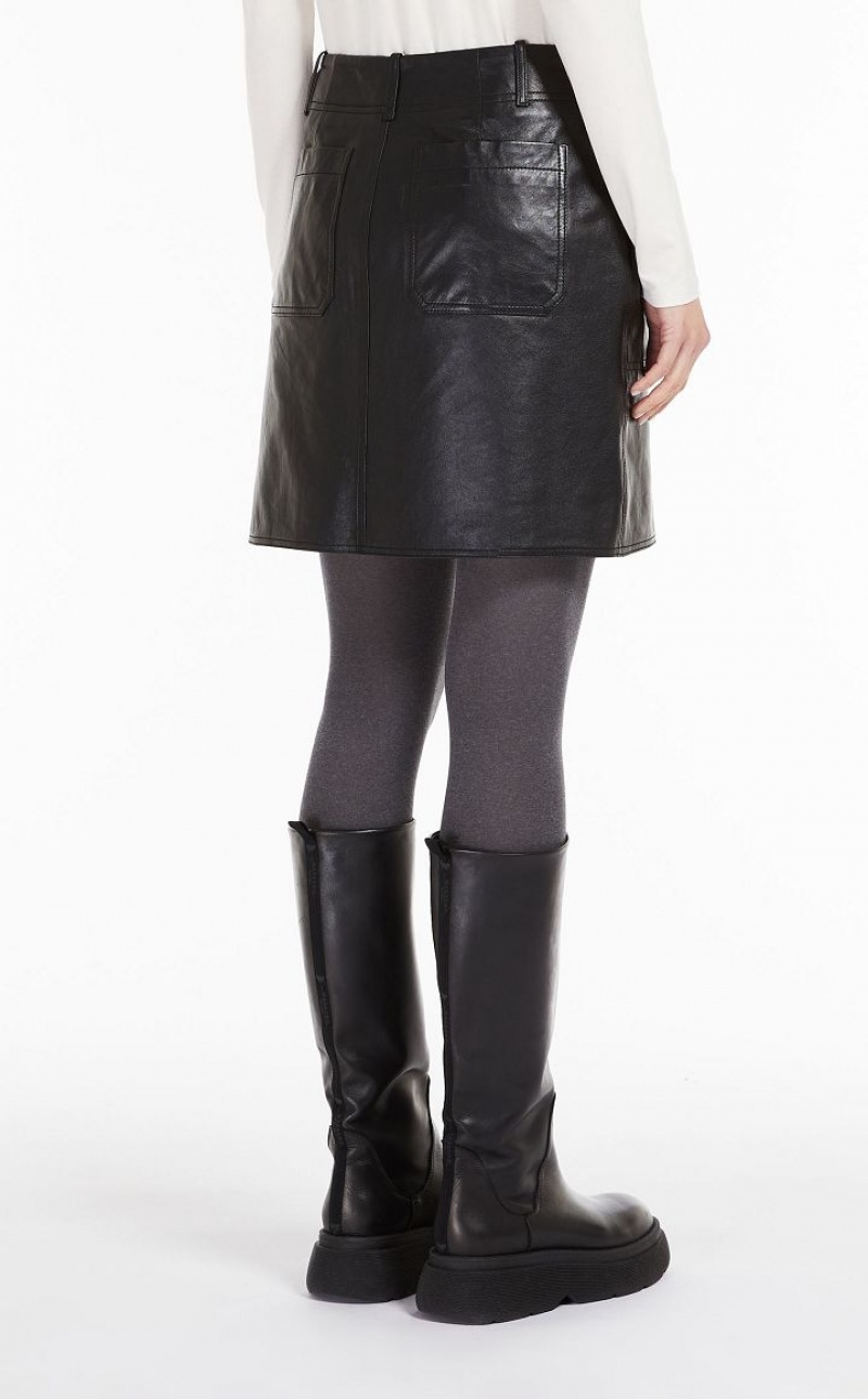 Nappa leather mini skirt featuring topstitched belt loop detail, slant front pockets and patch rear pockets. Zip and button fastening. Slight A line fit. Length: 48 cm. Lined interior.