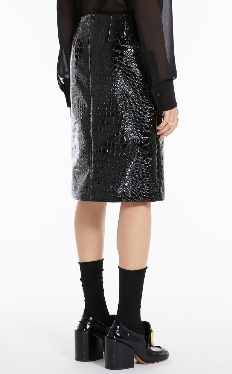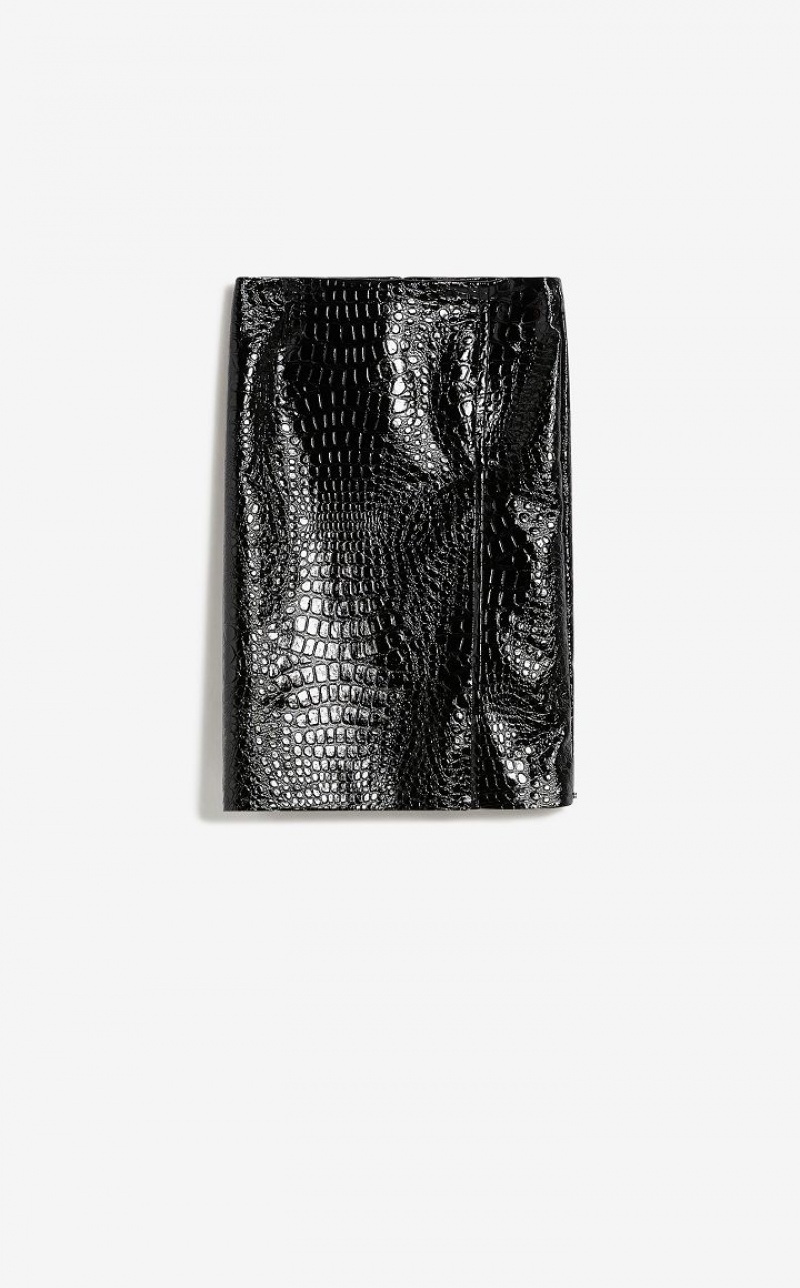 Straight pencil skirt without a waistband but with a deep overlapped slit on the side. Made of a cotton blend fabric with an all-over crocodile-embossed motif. Concealed zip fastening on the back. Lined.