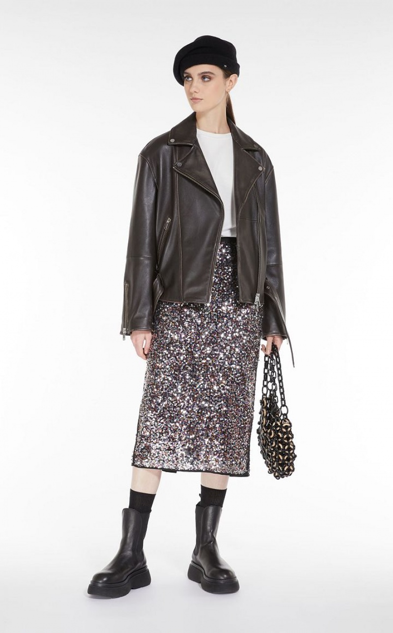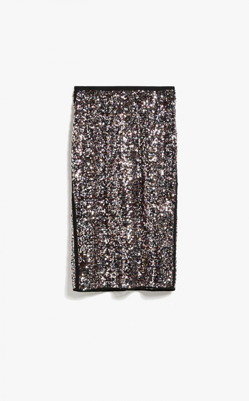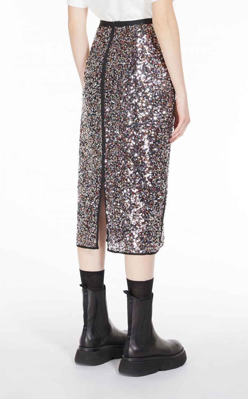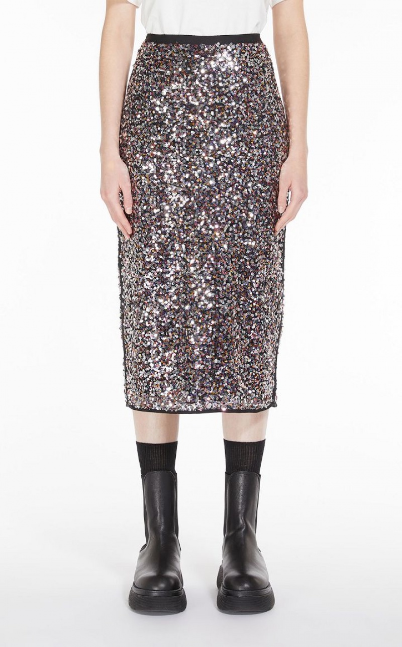 Midi-length pencil skirt in soft tulle jersey. This style is embellished with micro-sequins embroidered all over which add sparkle and movement with the movement of the body. Lined. Length: 77 cm.