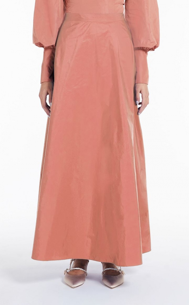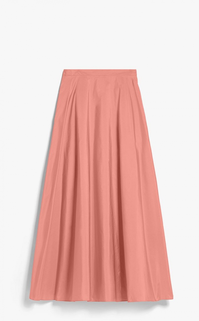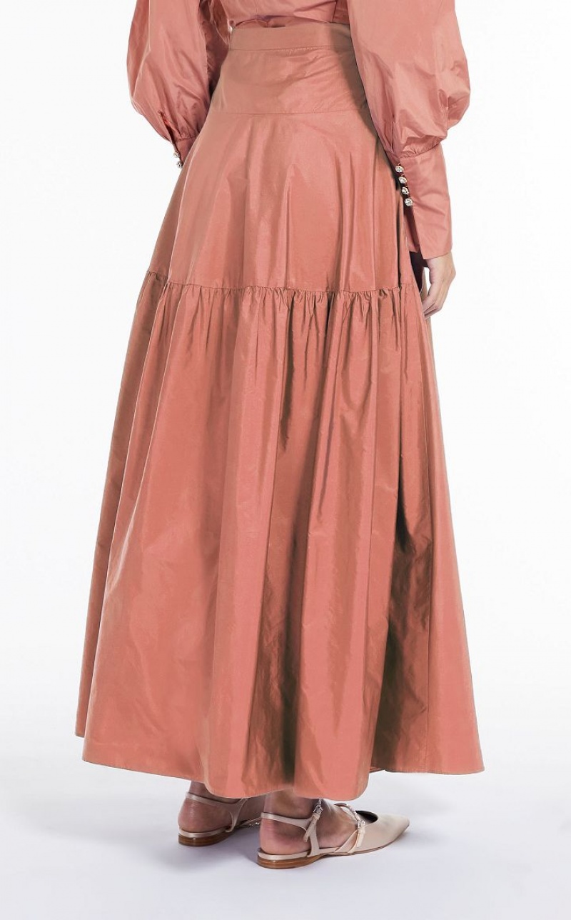 Long, high-waisted skirt made of exquisite silk-blend taffeta, with inset side pockets and waist band. The wide volume is accentuated by a gathered flounce motif on the back. Side zip fastening. Length: 100 cm.