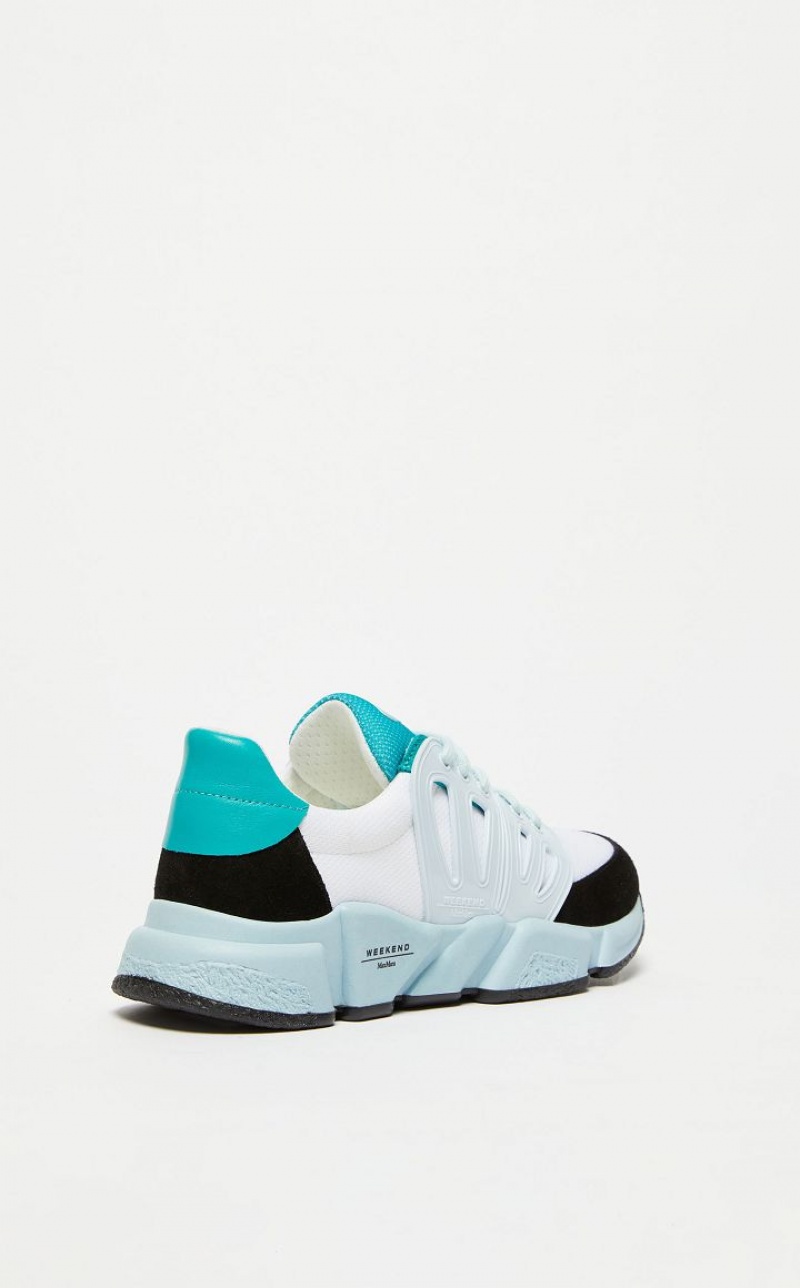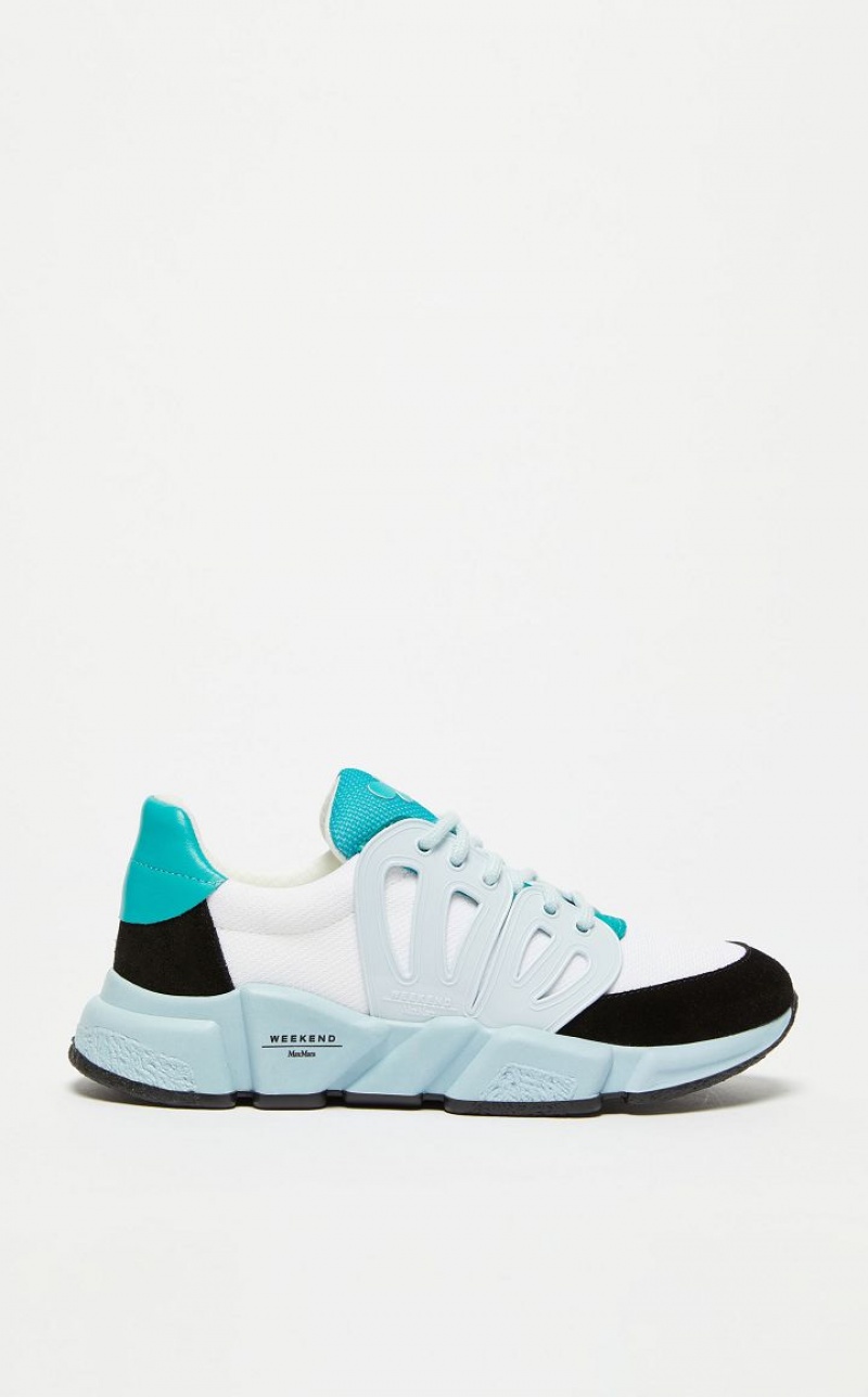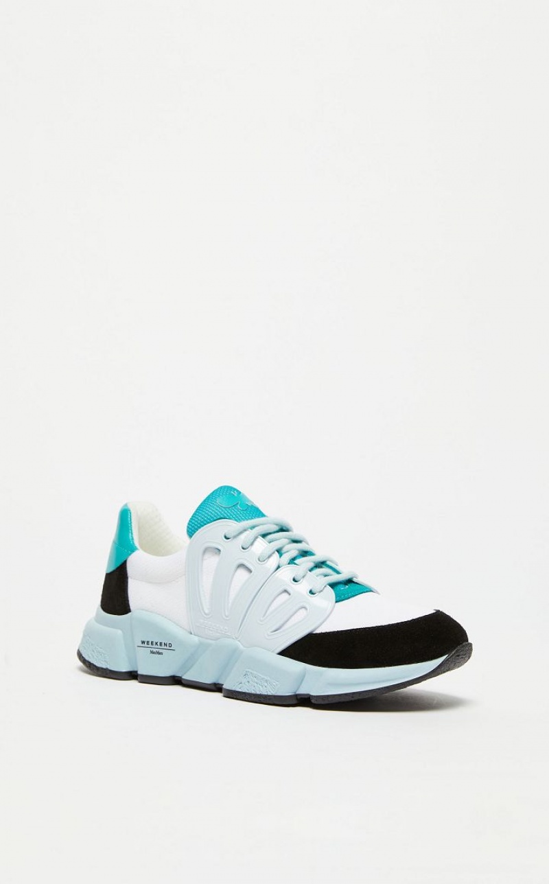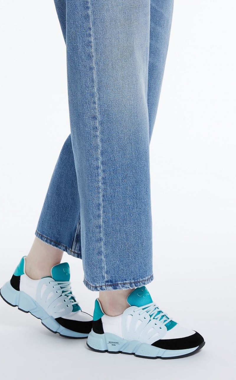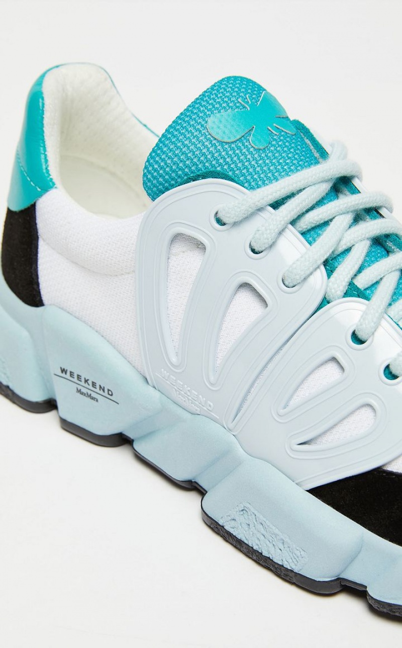 Low top lace up running shoes featuring an upper in technical fabric with colour block effect rubber and suede inserts. The model is personalised with side lace loops in butterfly shaped rubber and butterfly logo in rubber on the tongue. High shaped sole in rubber.