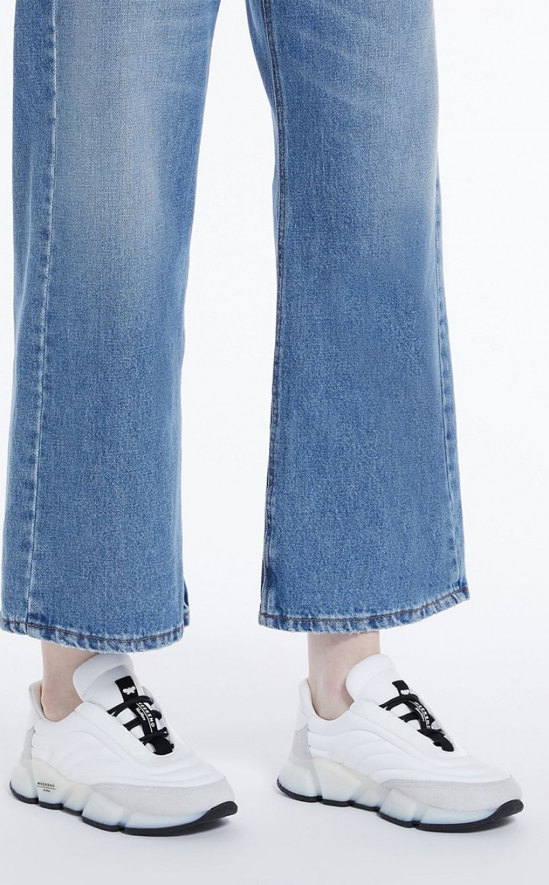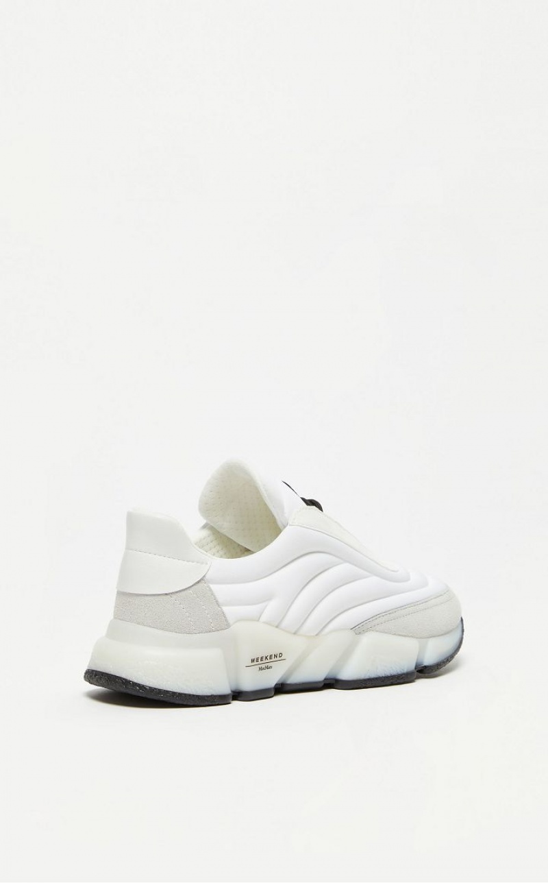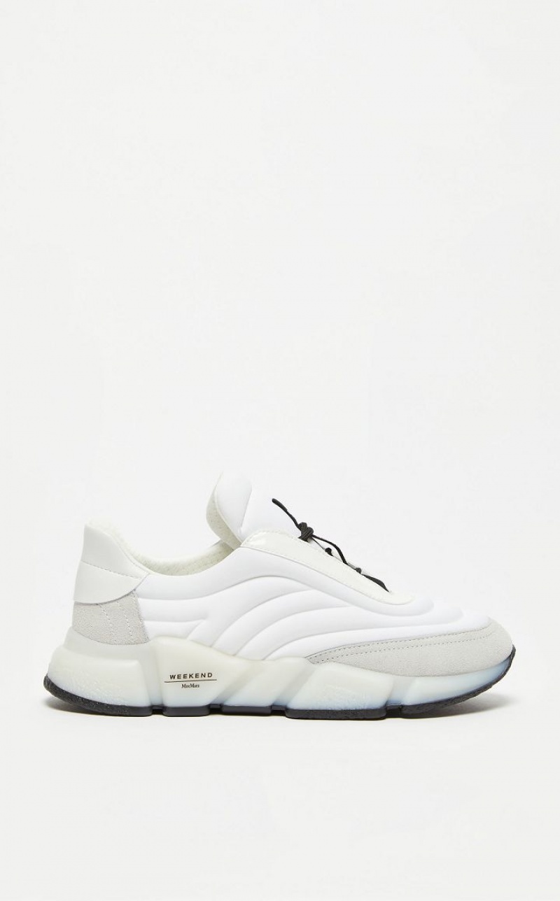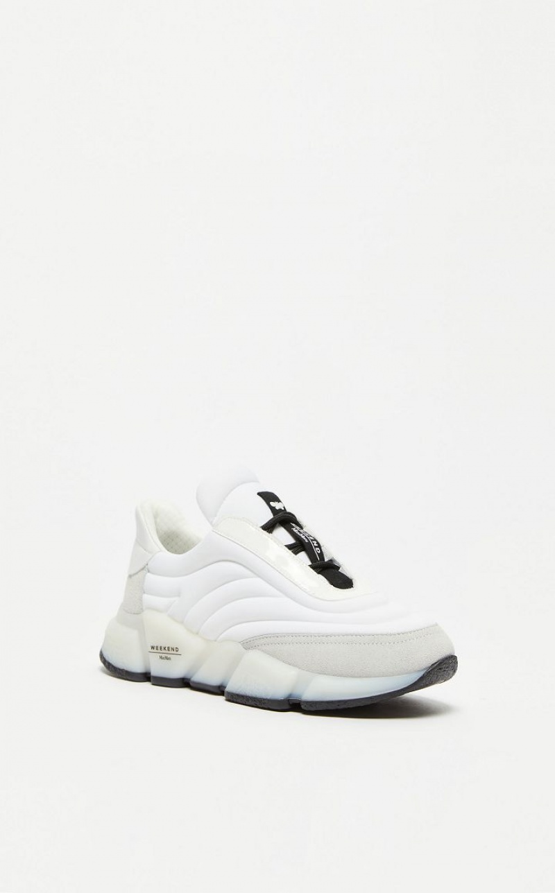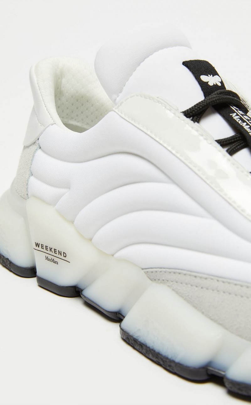 Low top lace up running shoes made of nylon woven at high frequency, finished with patent leather, leather and suede details. High shaped sole in white rubber with contrasting outsole.
