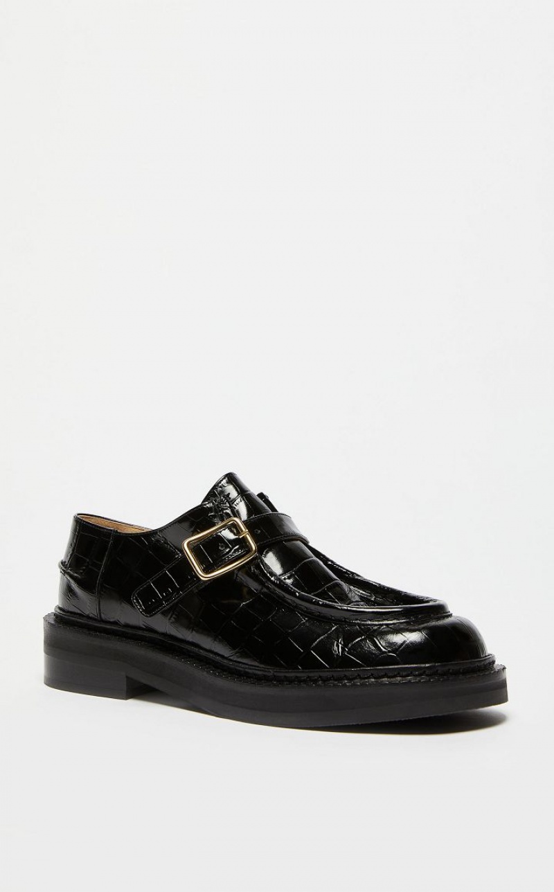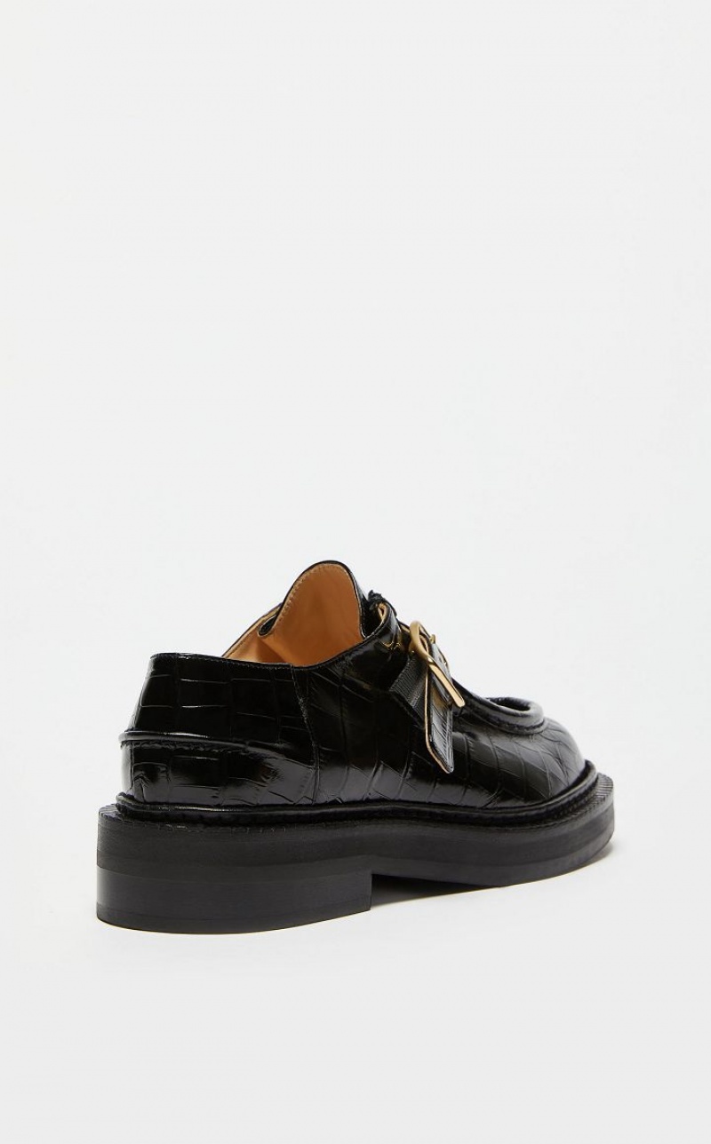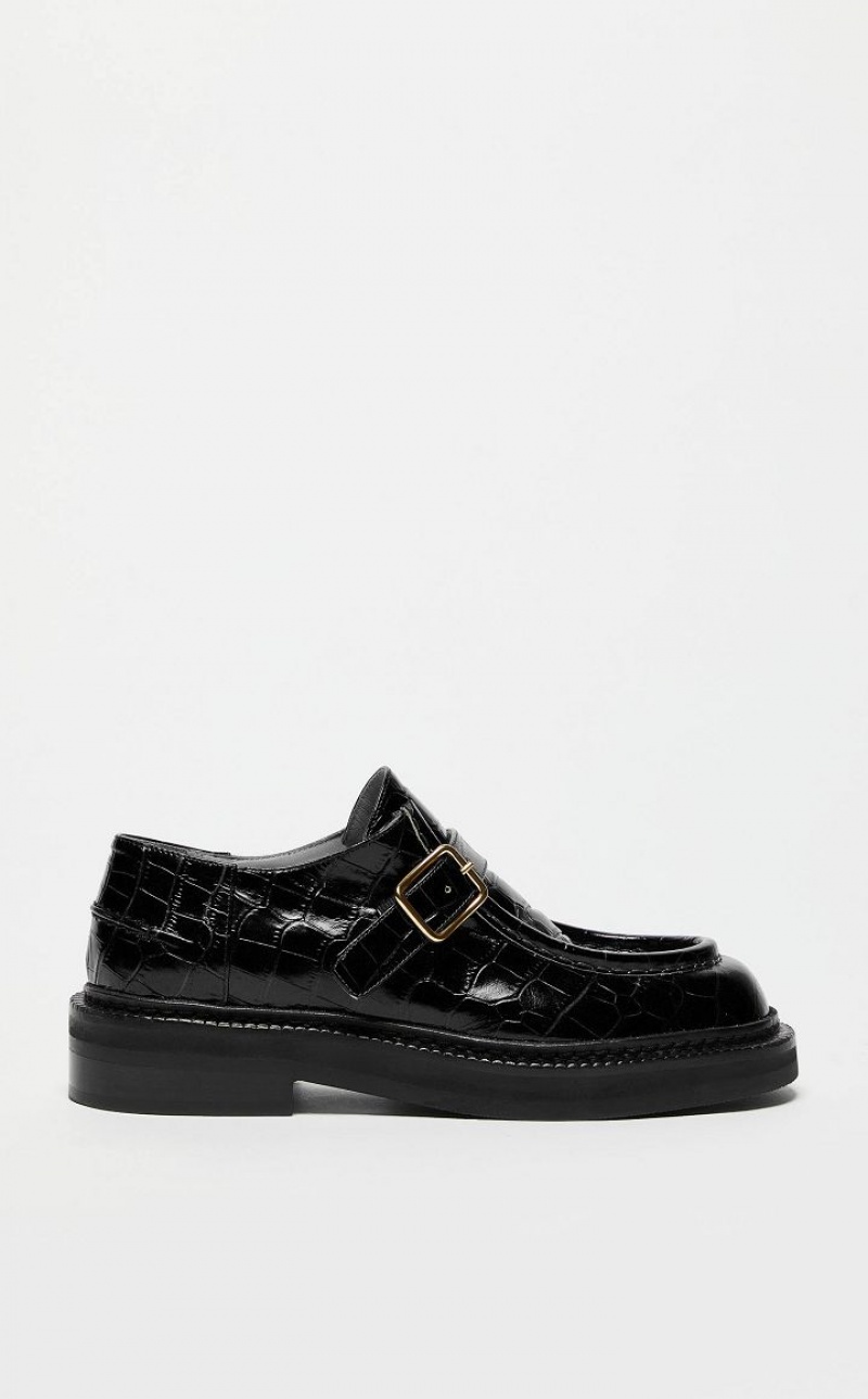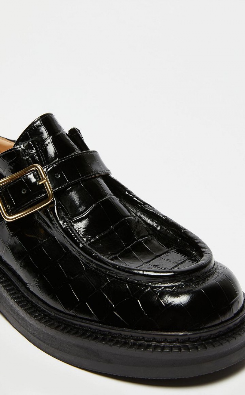 Flat loafers made of crocodile-embossed calfskin. Rounded toe design, with a stitched shoe apron and adjustable strap with a brass-effect metal buckle on the instep. Ultra-light 2 cm-high rubber sole with leather welt.
