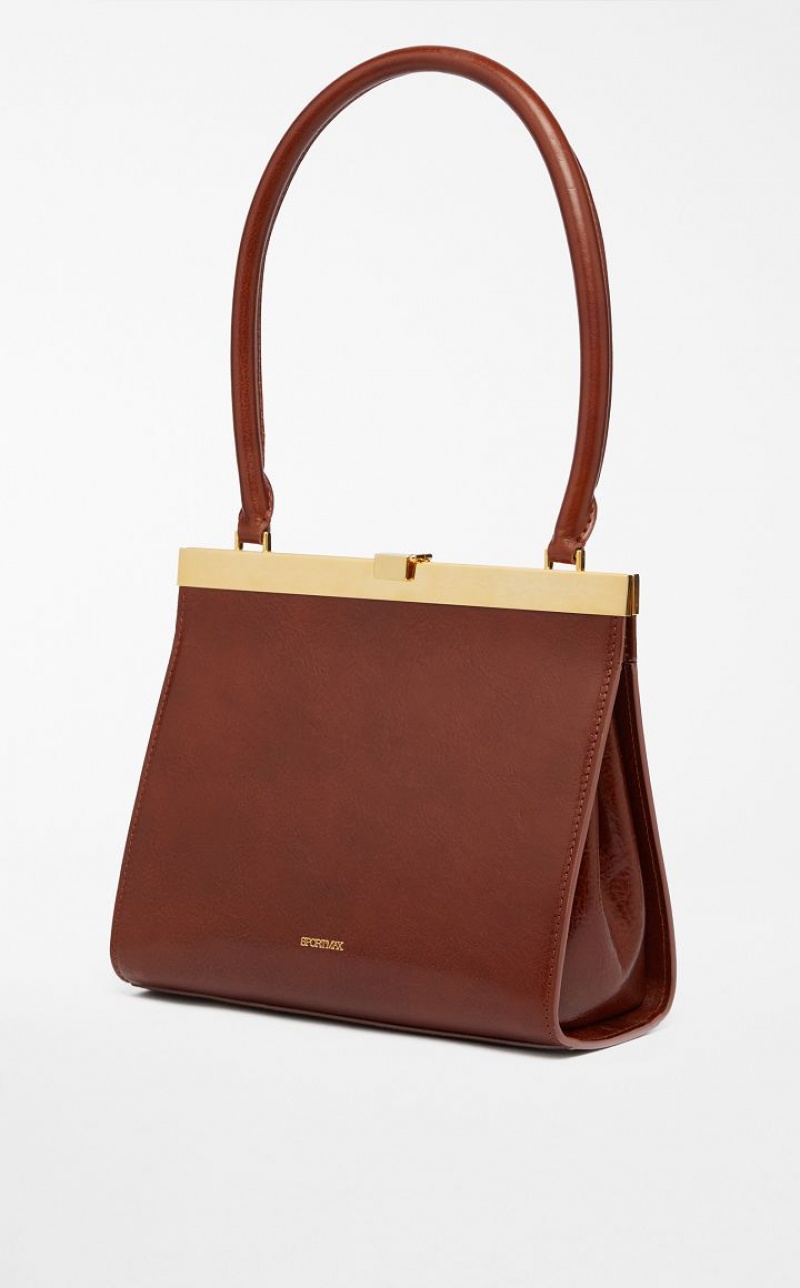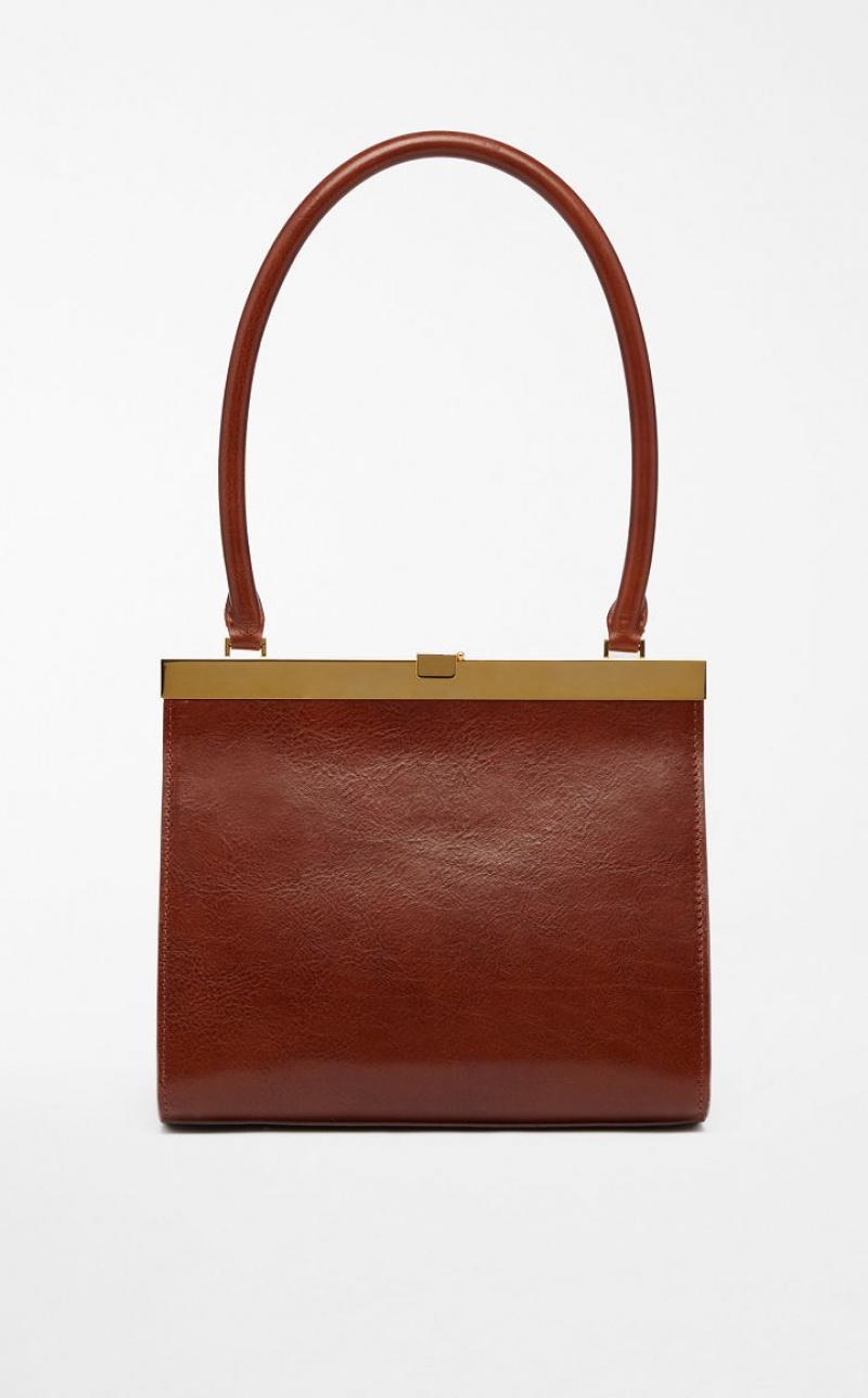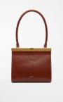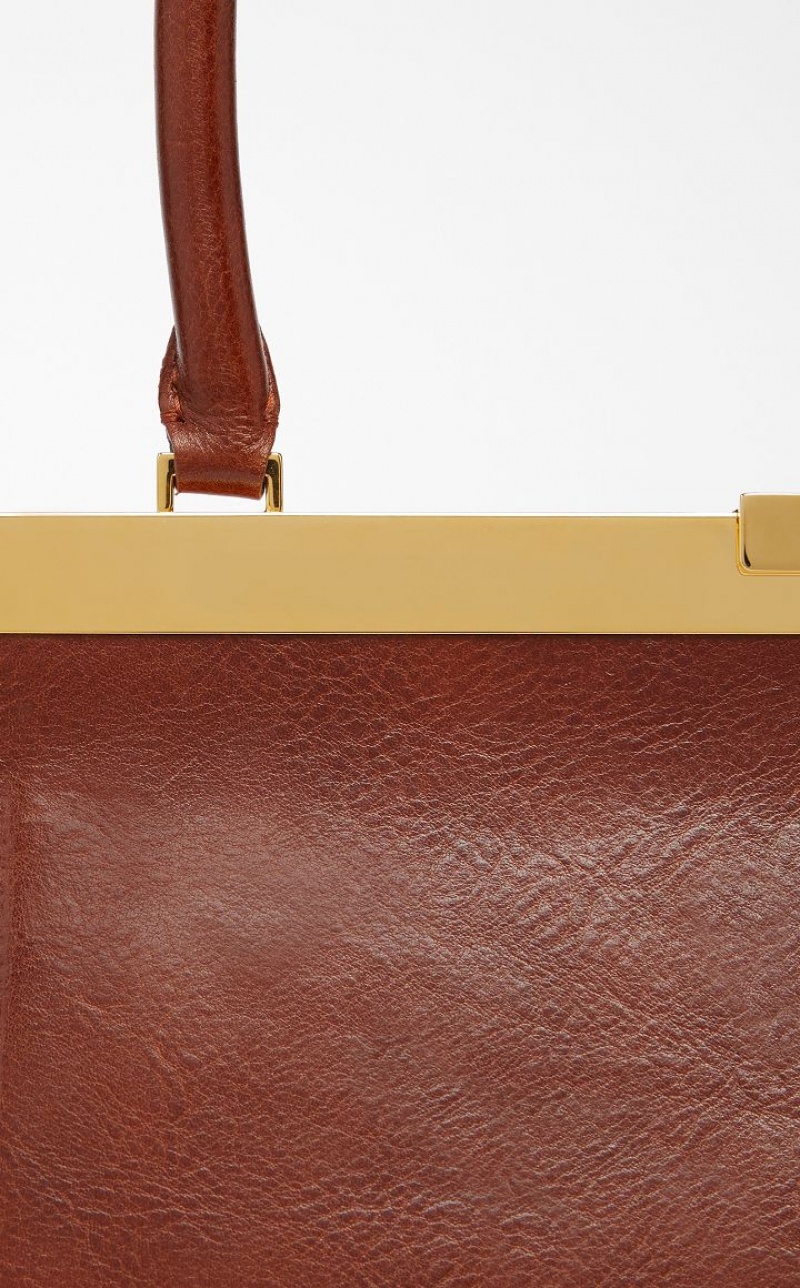 Medium Lizzie Bag made of vegetable-tanned leather. The opening is defined by a shiny gold-coloured frame in galvanised metal, while the interior is lined and divided into two compartments with a central zipped pocket. Can be carried by hand or worn on the shoulder thanks to the tubular handle. Hand-lacquered ribs and golden logo on the front. Measurements: 27 x 11 x 22.5 cm.