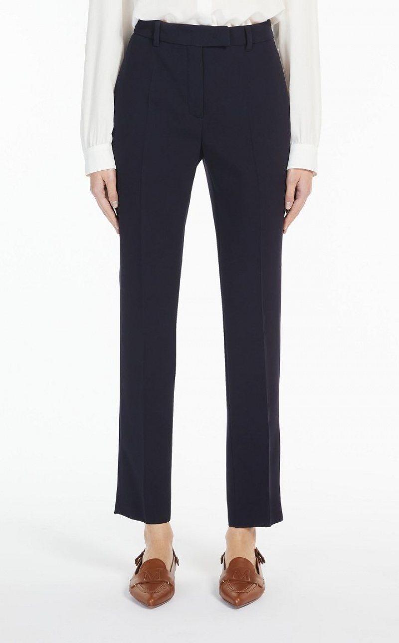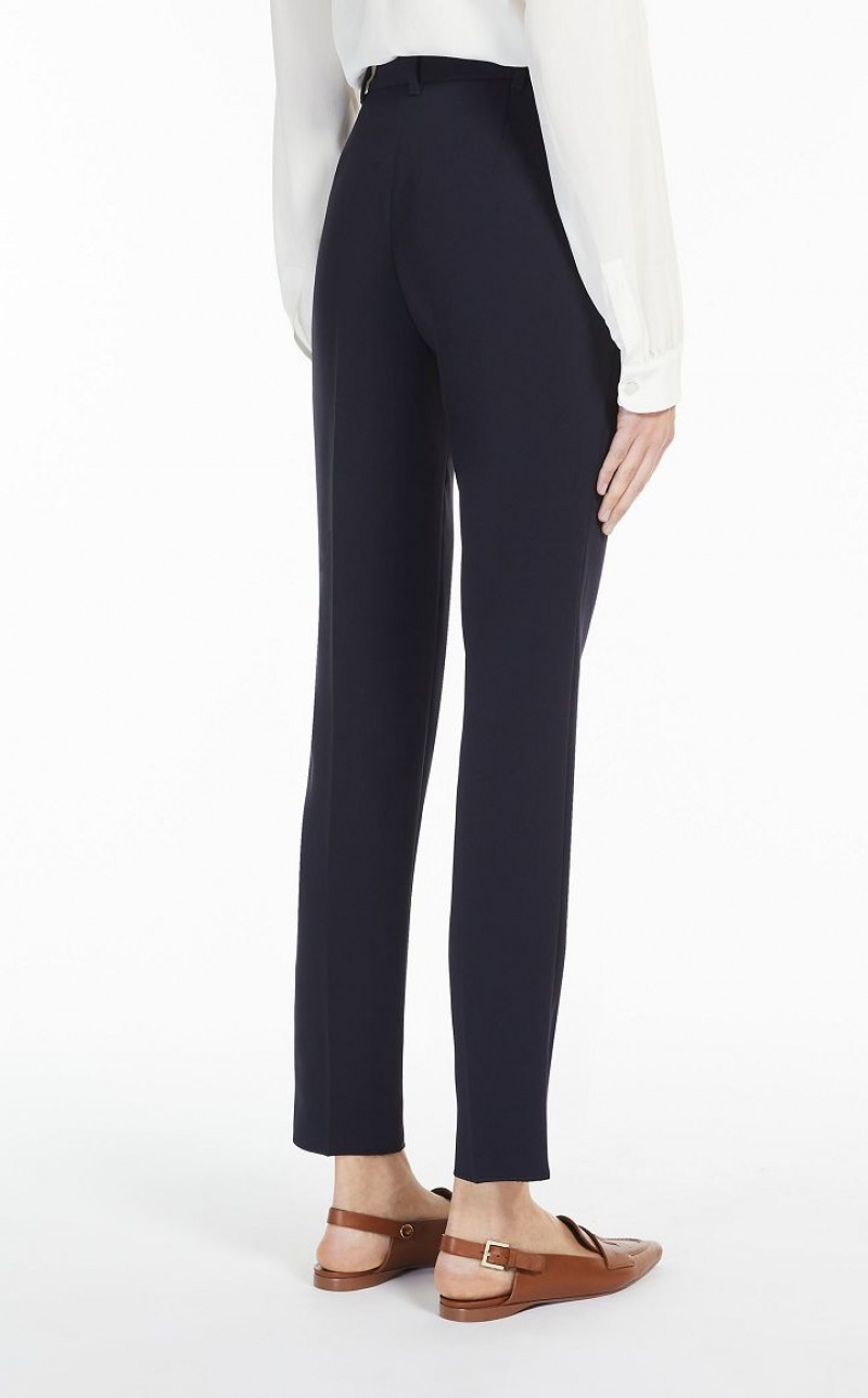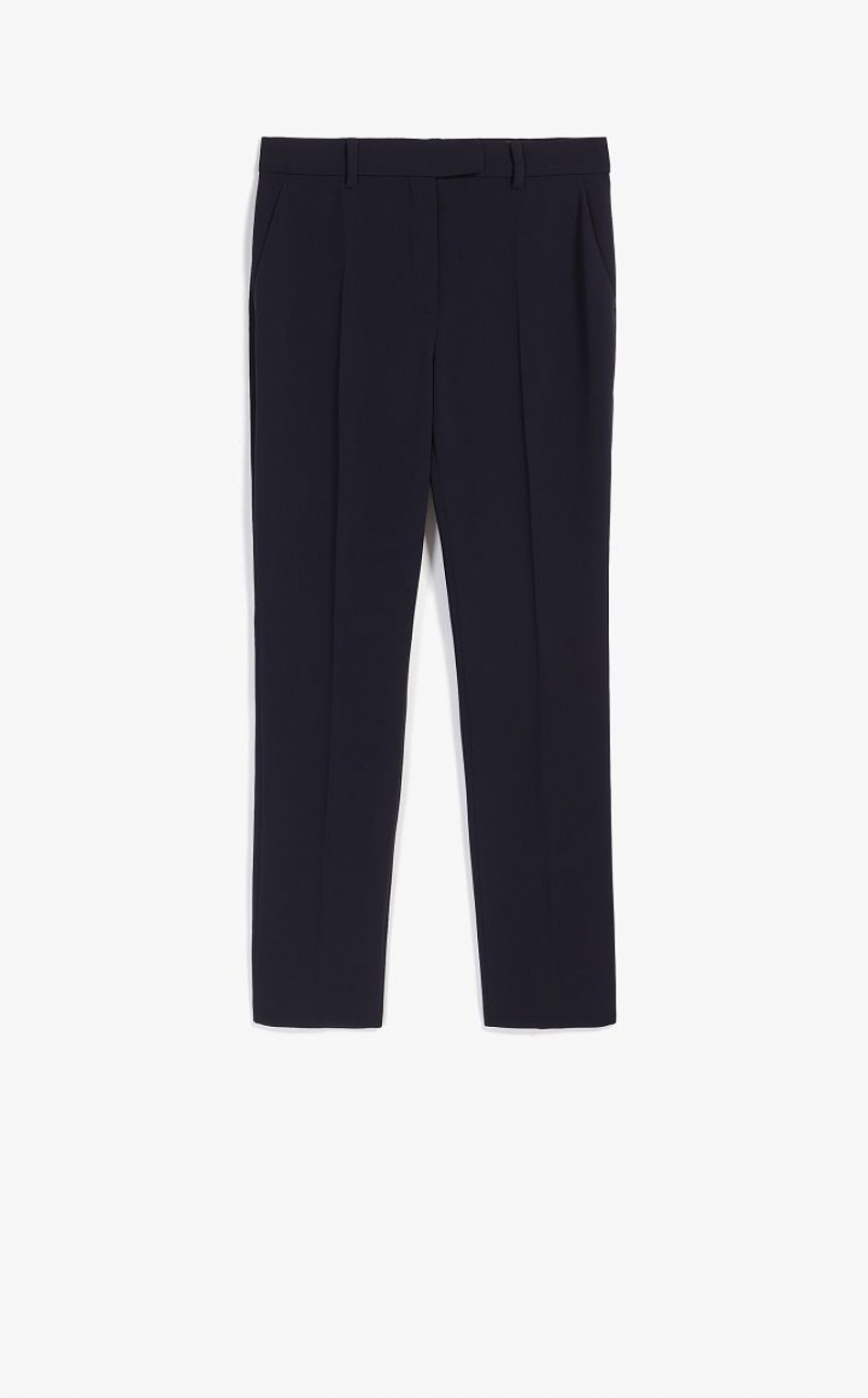 Fluid fabric cigarette trousers featuring a boyfriend-style continuous waistband and hook-and-bar fastening. Pressed pleat detail and slant pockets.