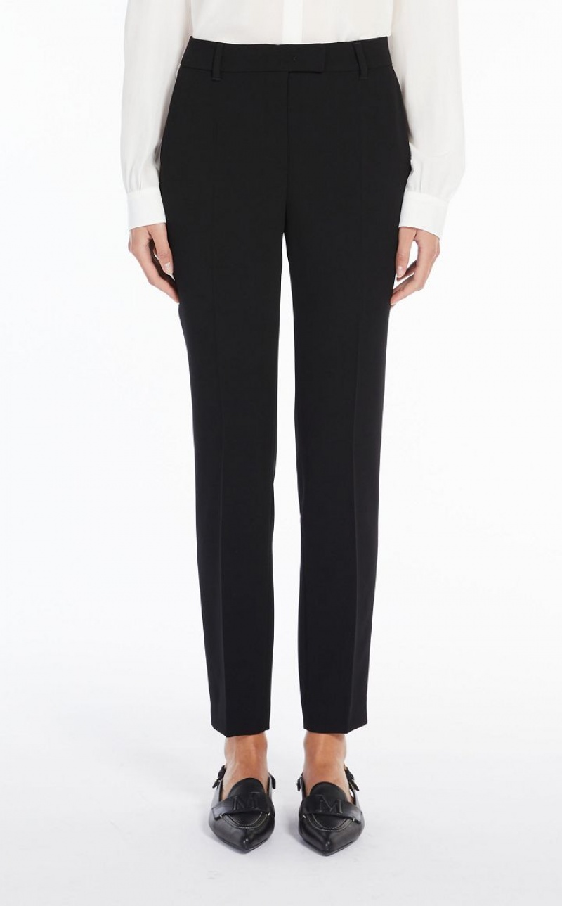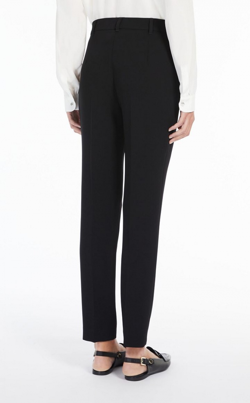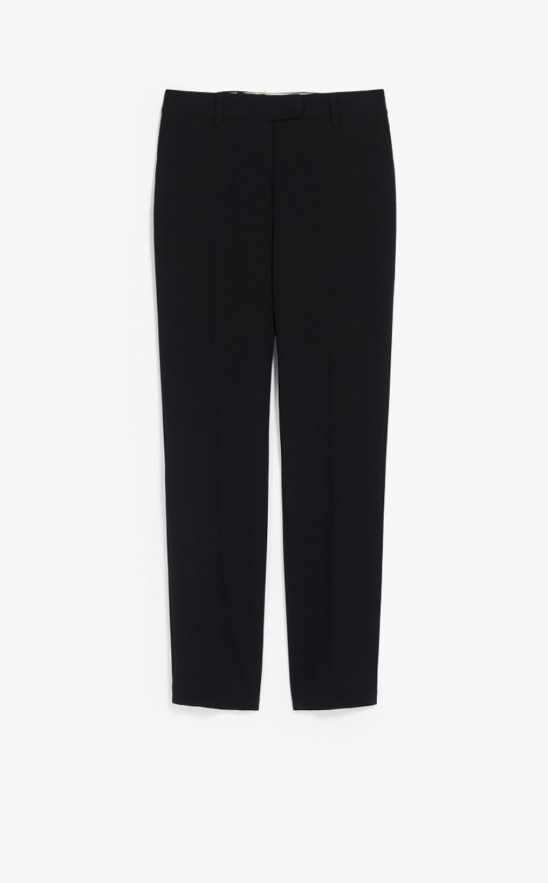 Fluid fabric cigarette trousers featuring a boyfriend-style continuous waistband and hook-and-bar fastening. Pressed pleat detail and slant pockets.