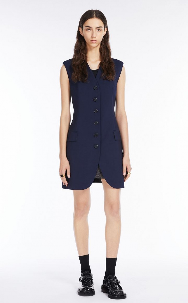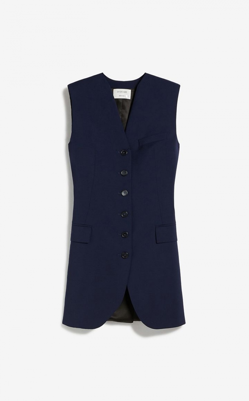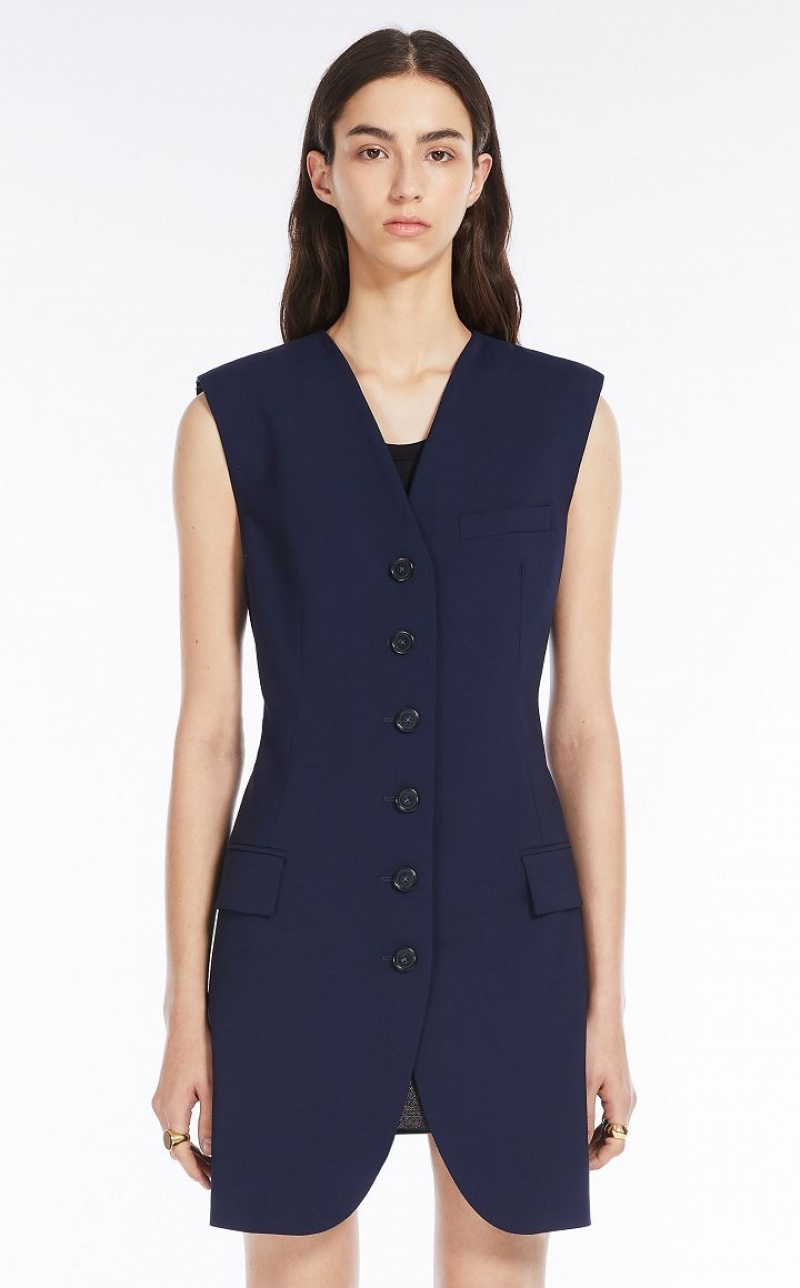 Long waistcoat made of a natural stretch pure-wool plain-weave fabric on the front and viscose blend fabric on the back. The style is inspired by menswear classics, with tailored details such as the slanted breast pocket, flap pockets on the sides, and strap on the back with a buckle and metal eyelets. Darts enhance the fitted and feminine silhouette. Detail of lined shoulder straps visible above the shoulder. Above-the-knee length.