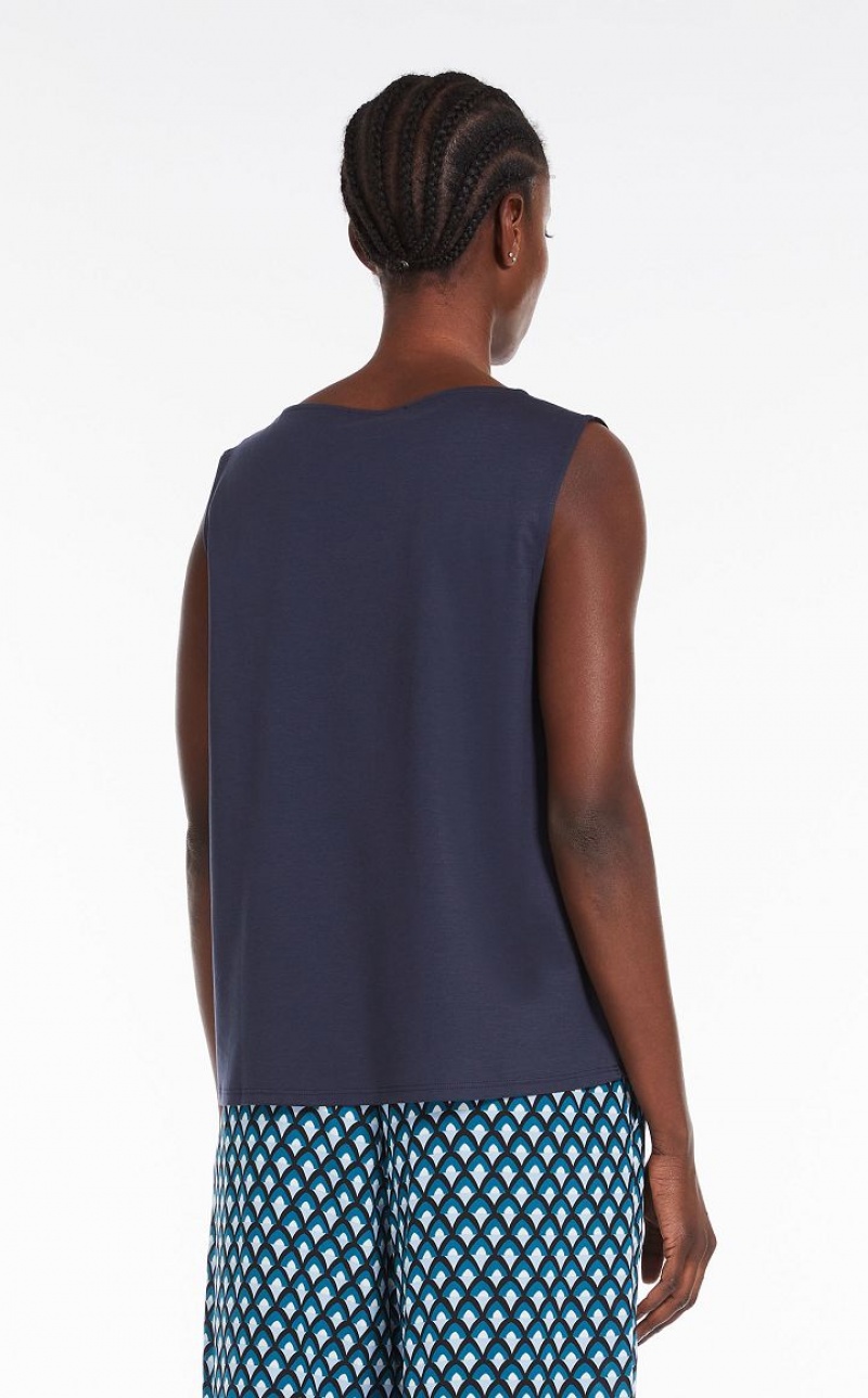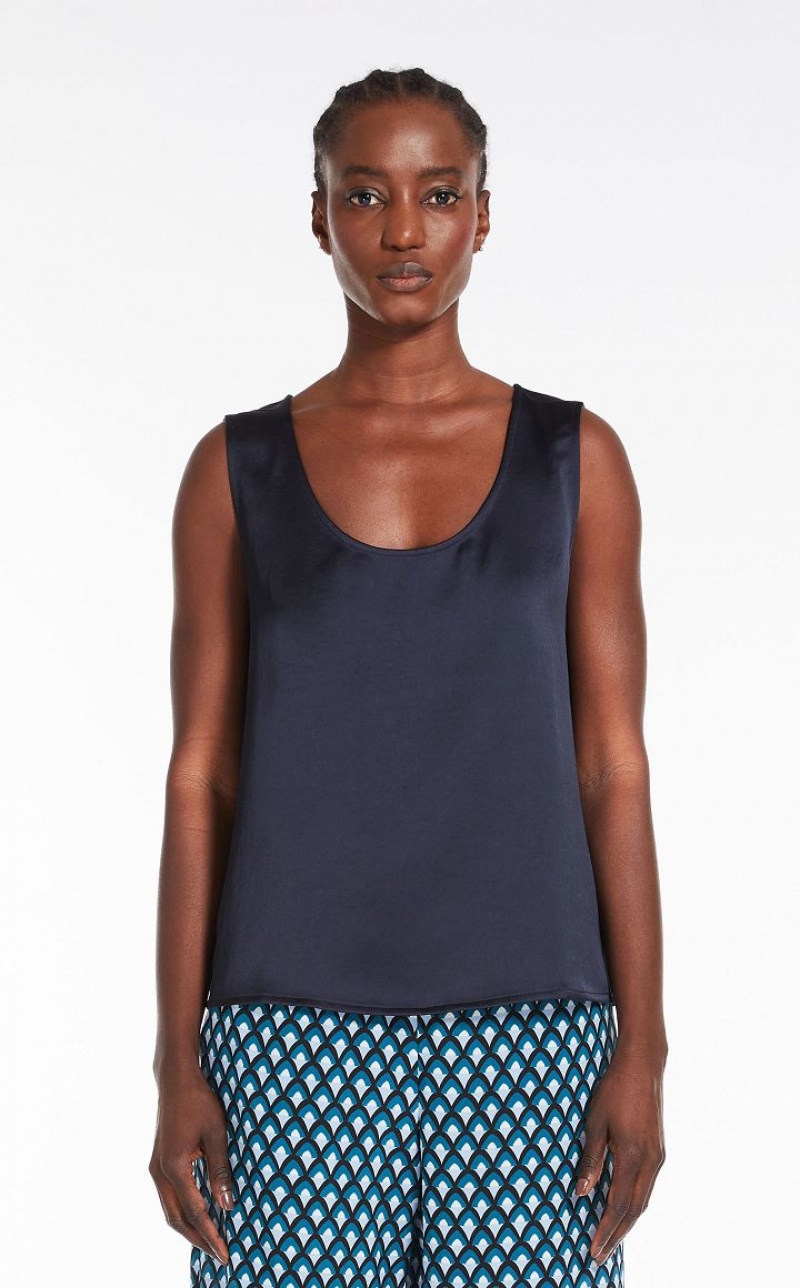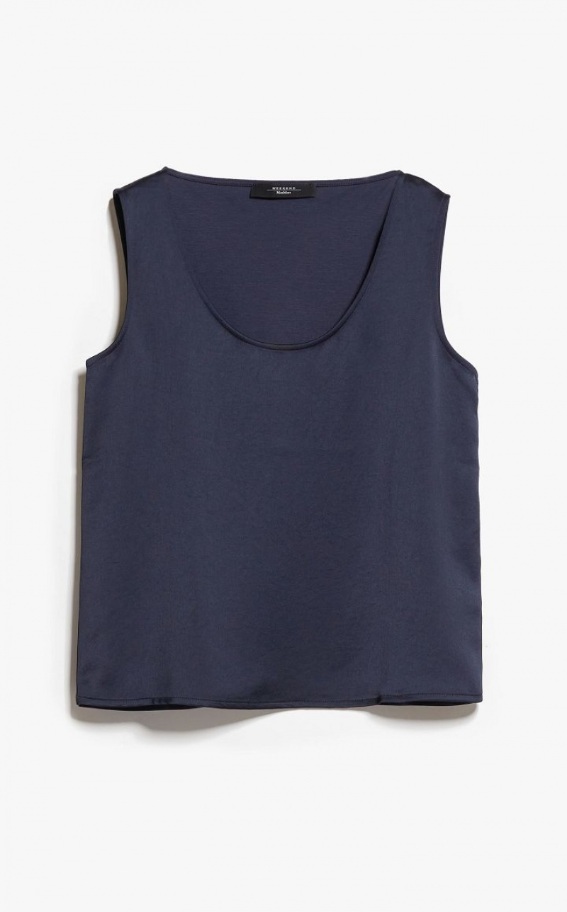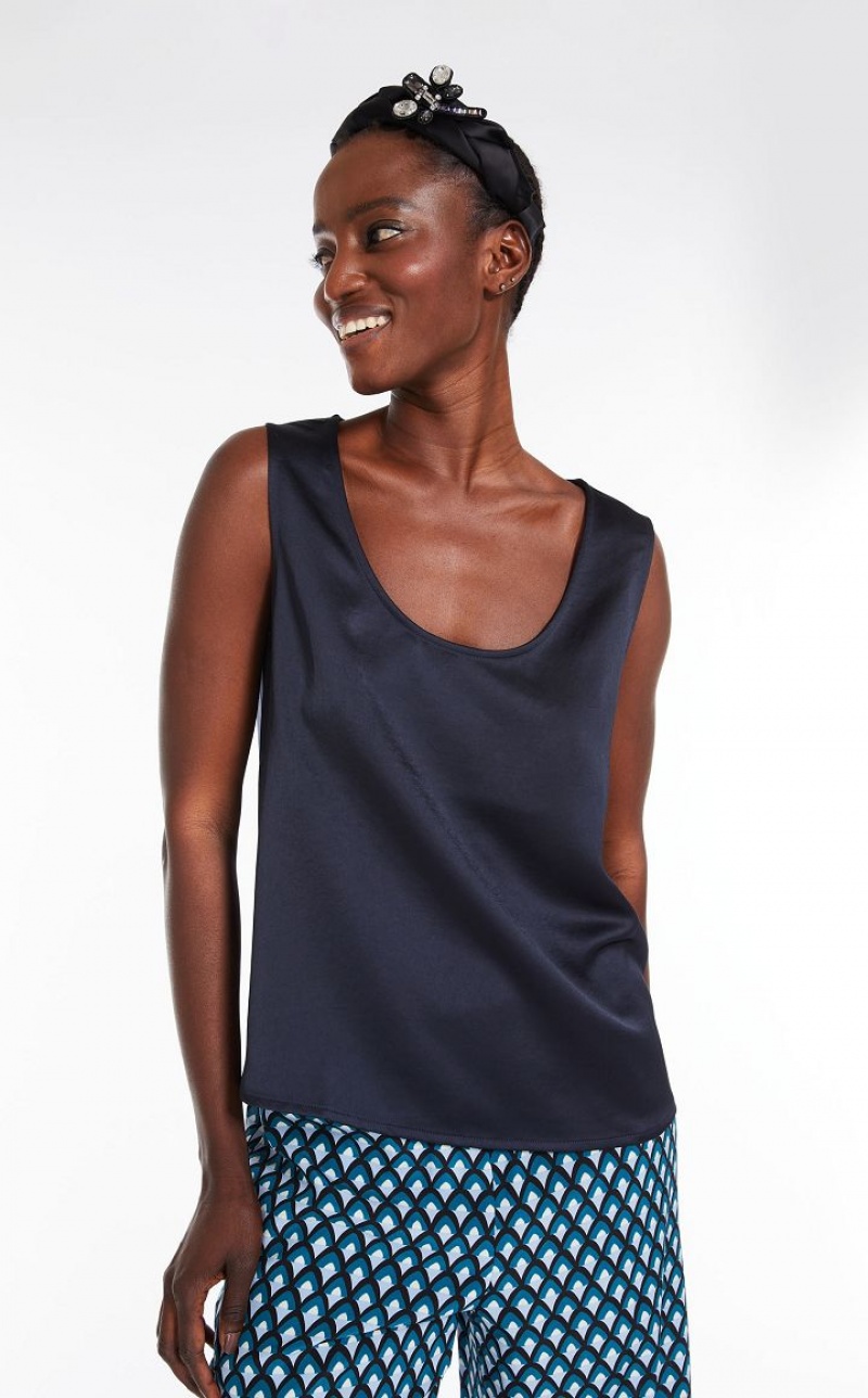 Sleeveless top with a straight, flowing line, in delicate washed technical satin on the front and soft modal cotton jersey on the back. Versatile and feminine style with wide shoulders and deep front neckline.