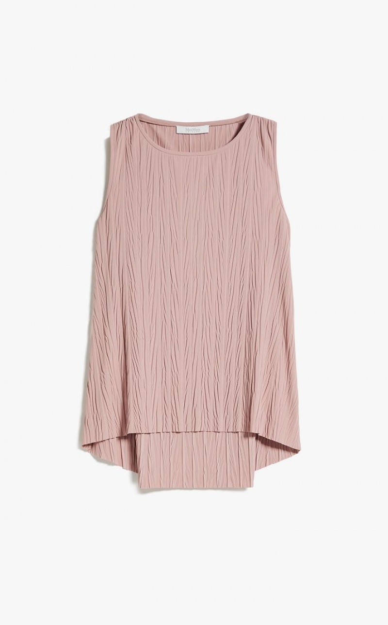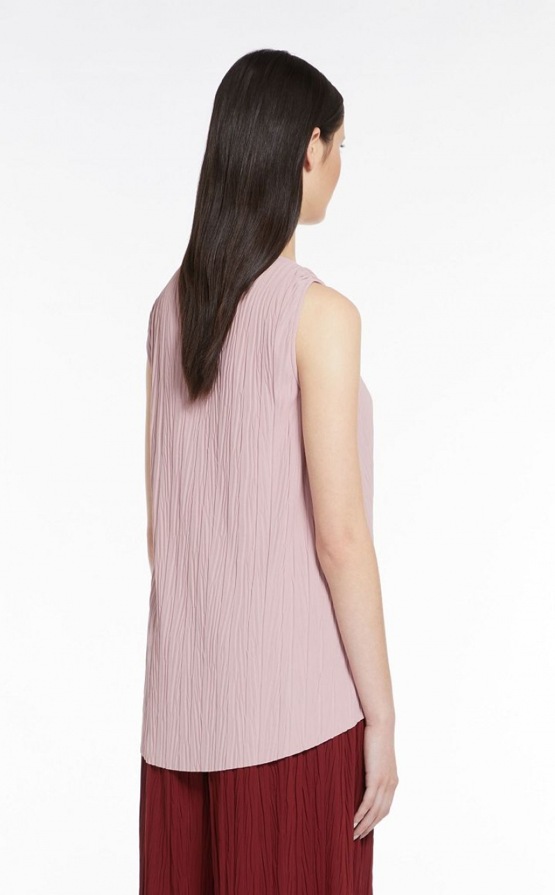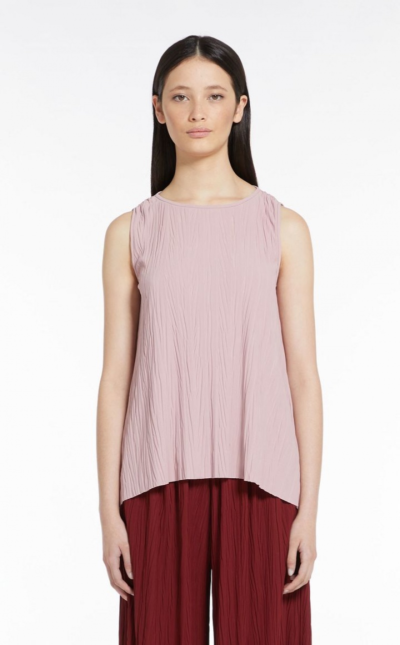 Sleeveless top in soft two way stretch jersey fabric featuring bark look vertical pleat detail. The model boasts an ultra feminine flared fit, in addition to a boat neckline and rounded asymmetrical high low hem.