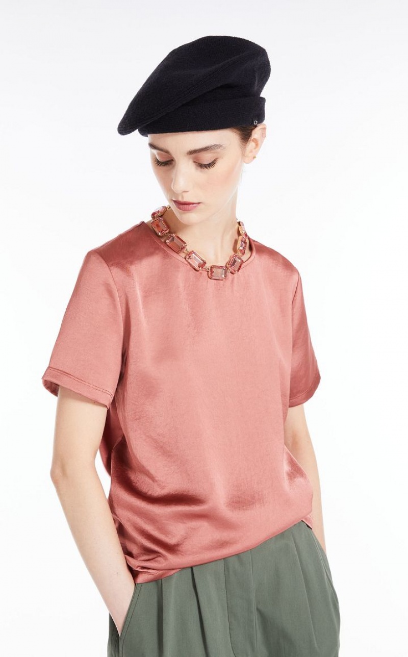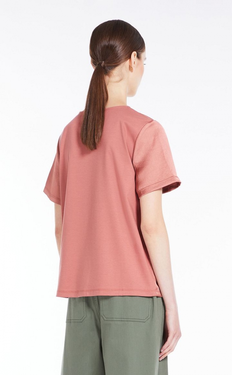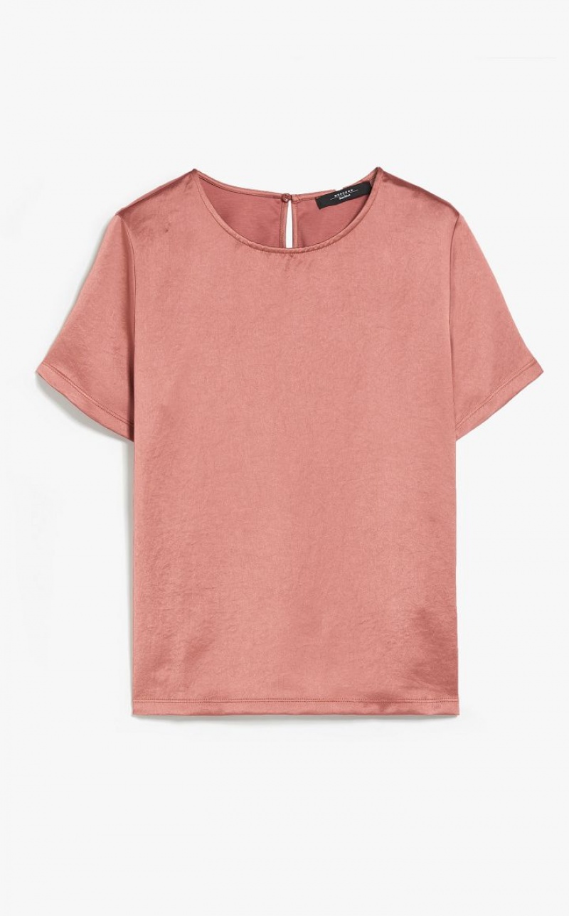 Fluid fit blouse in washed technical satin with insert in soft modal and cotton jersey on the back. Straight-cut style with round neck, short sleeves and teardrop closure on the back.