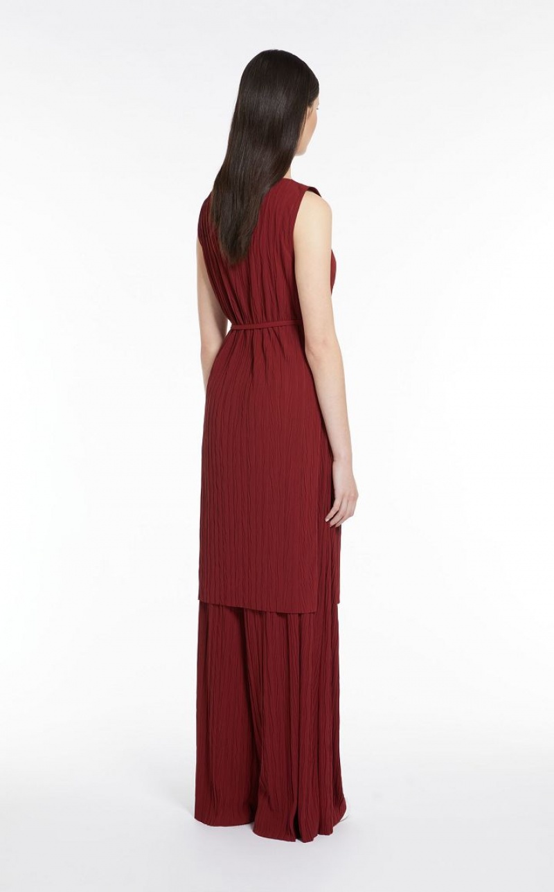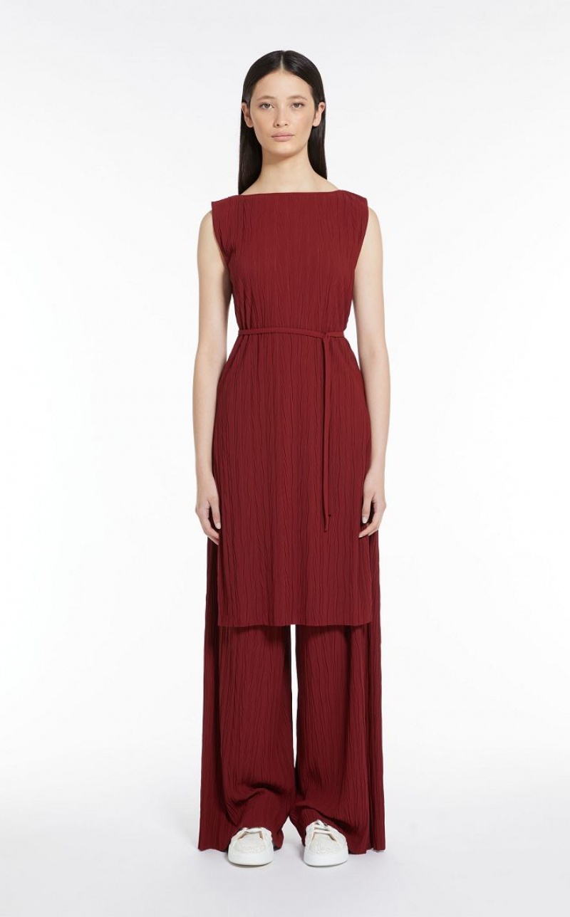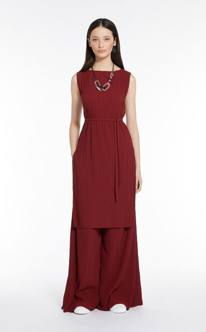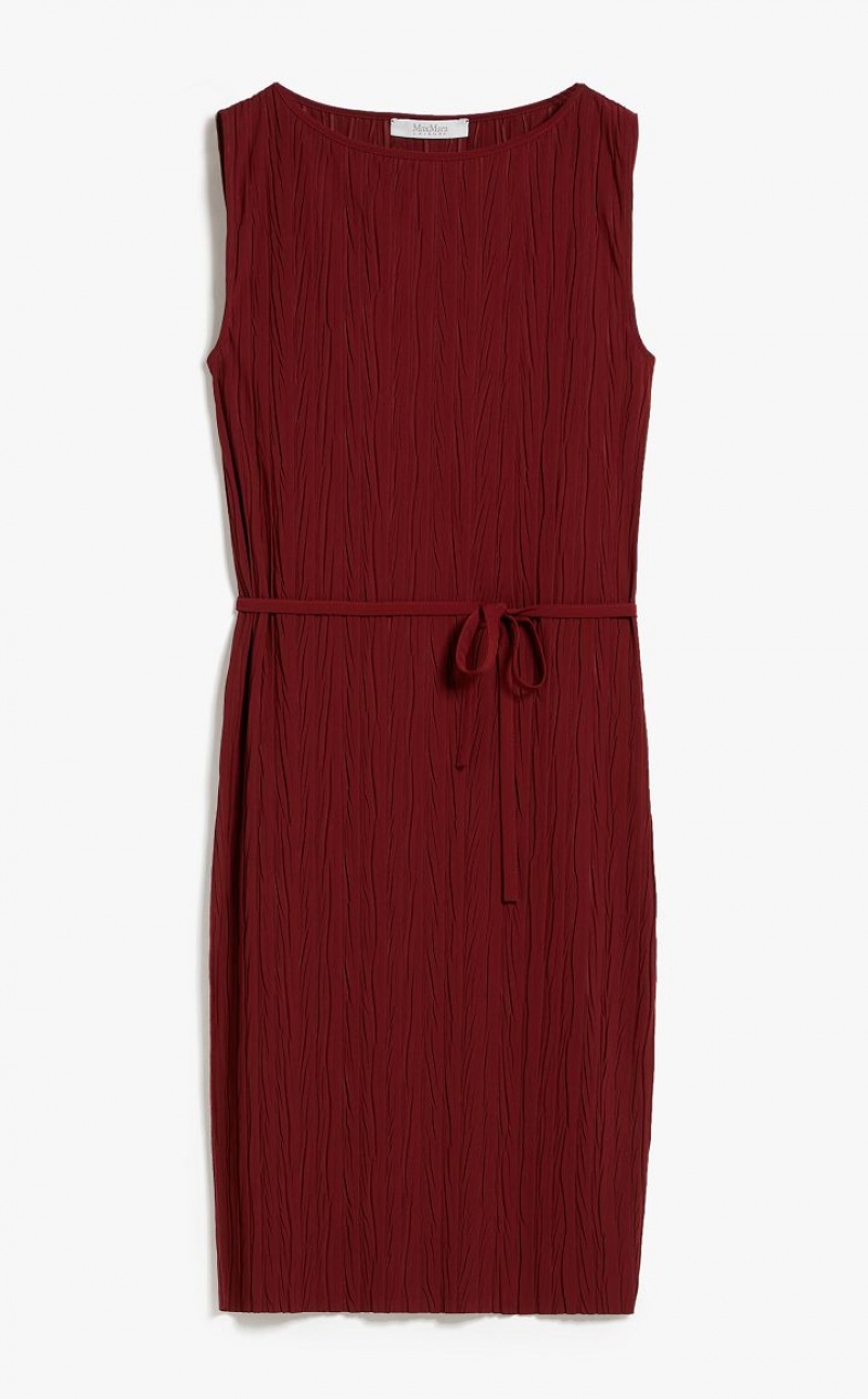 Long sleeveless tunic in soft two way stretch jersey fabric featuring bark-look vertical pleat detail. The straight fit model boasts deep side slits and a silhouette accentuating waist belt.