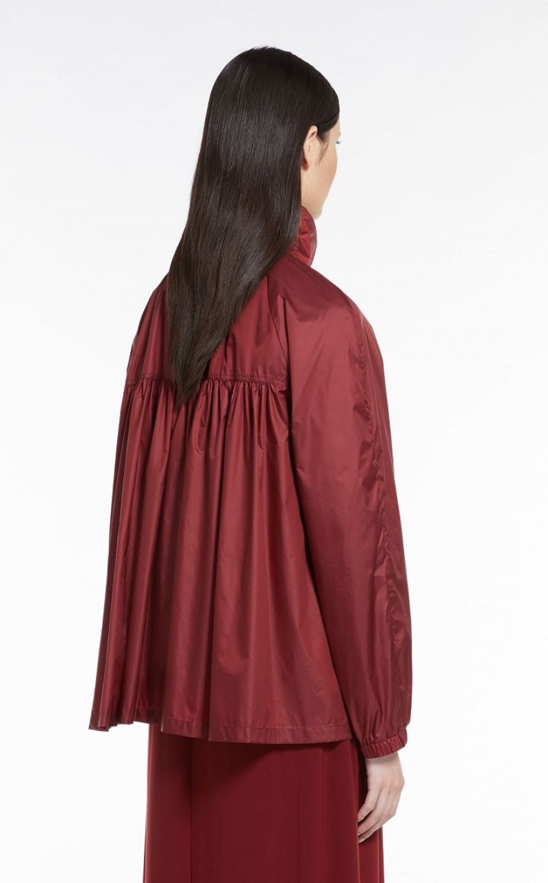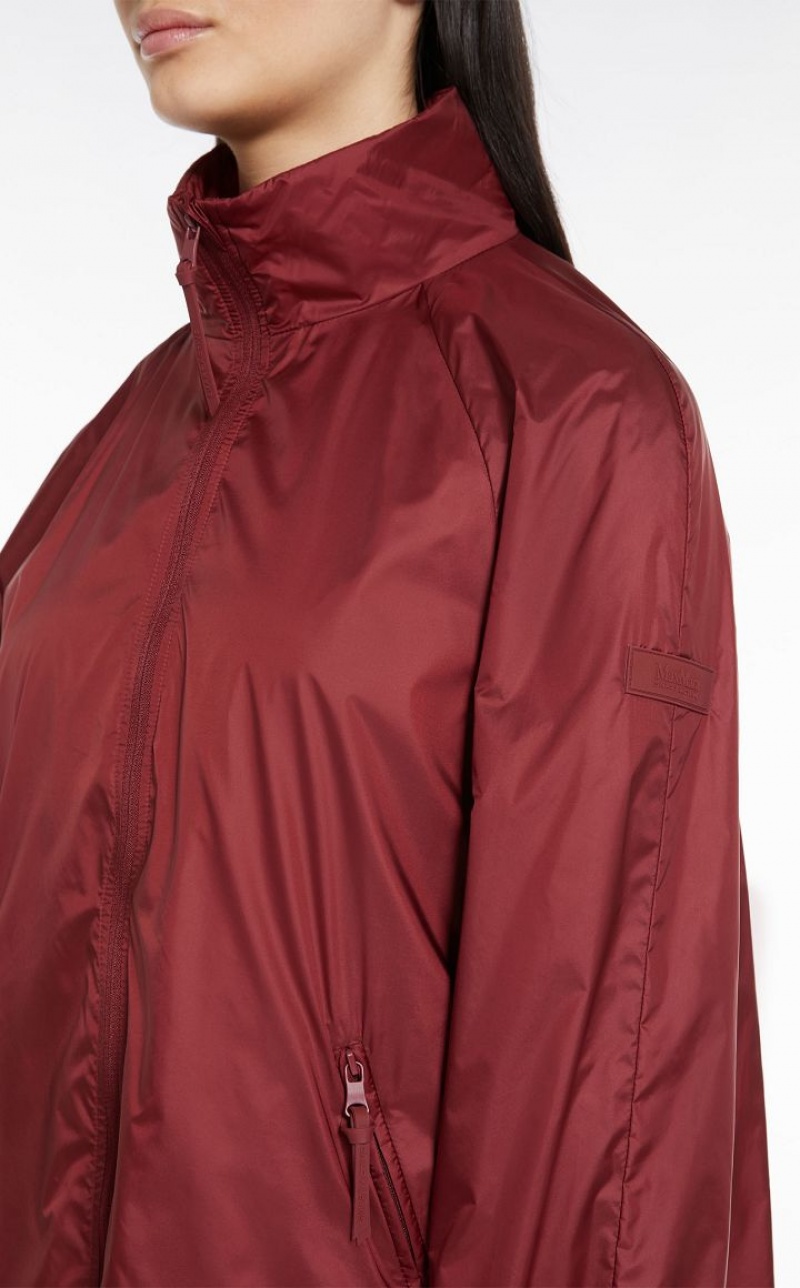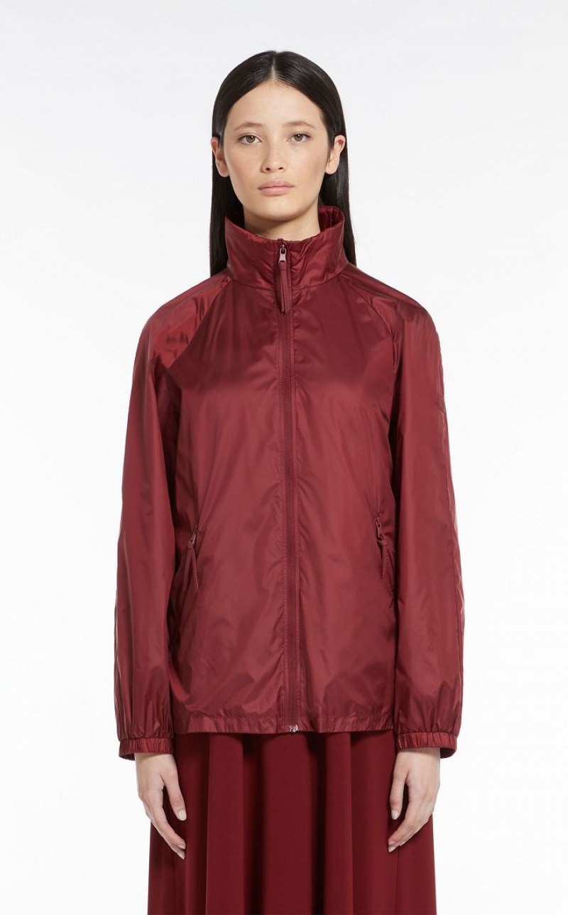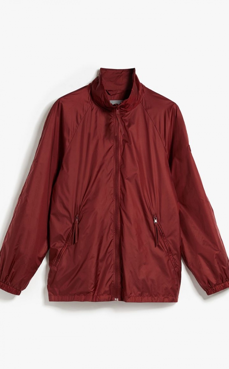 Water repellent nylon windbreaker. The A line model boasts a pleated insert on the back for a comfortable yet feminine fit. Elasticated cuff adorned long raglan sleeves. High neck. Embellished with a rear yoke and zipped diagonal pockets. Front zip fastening.