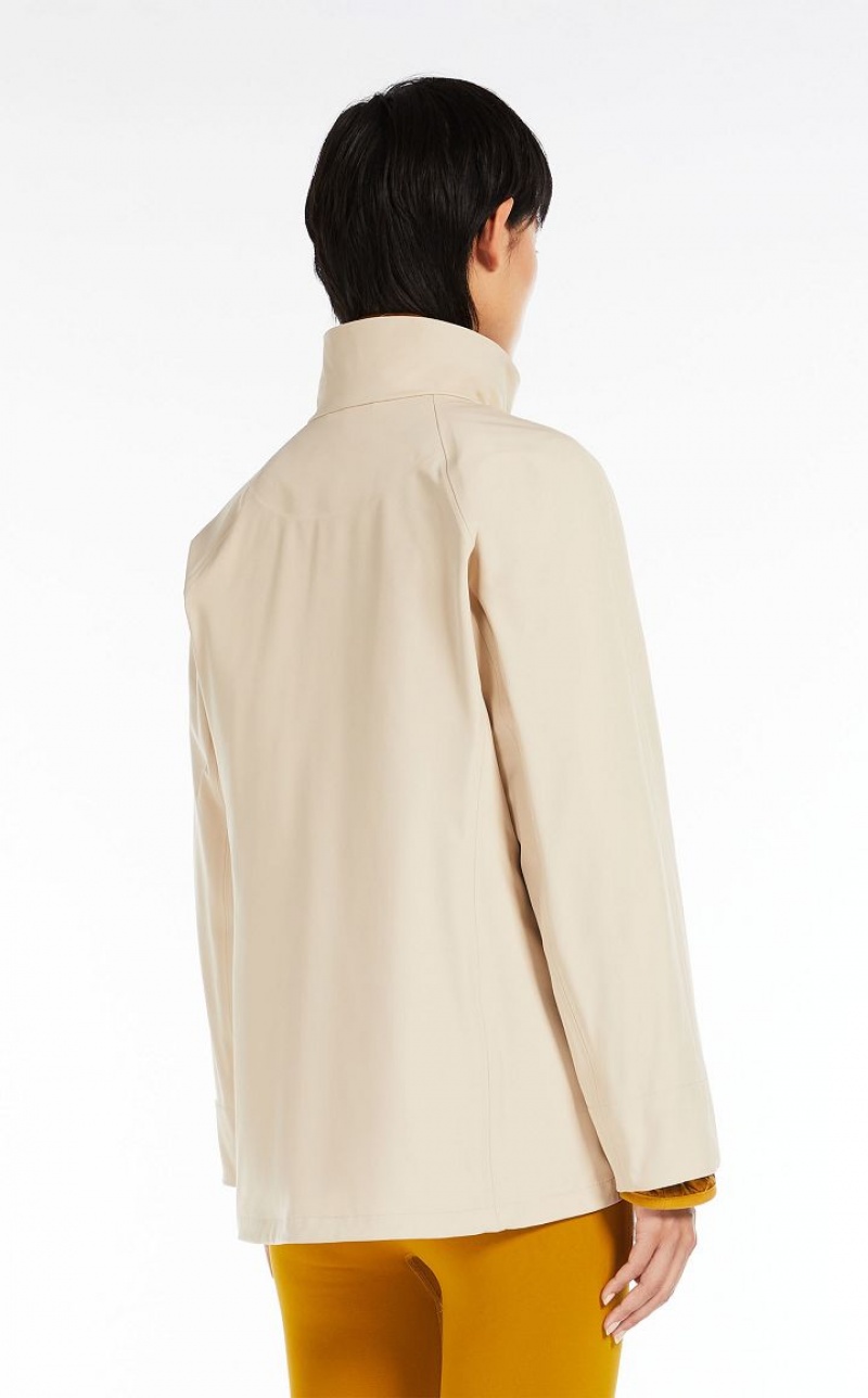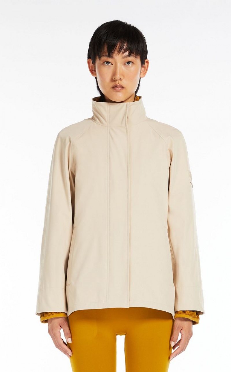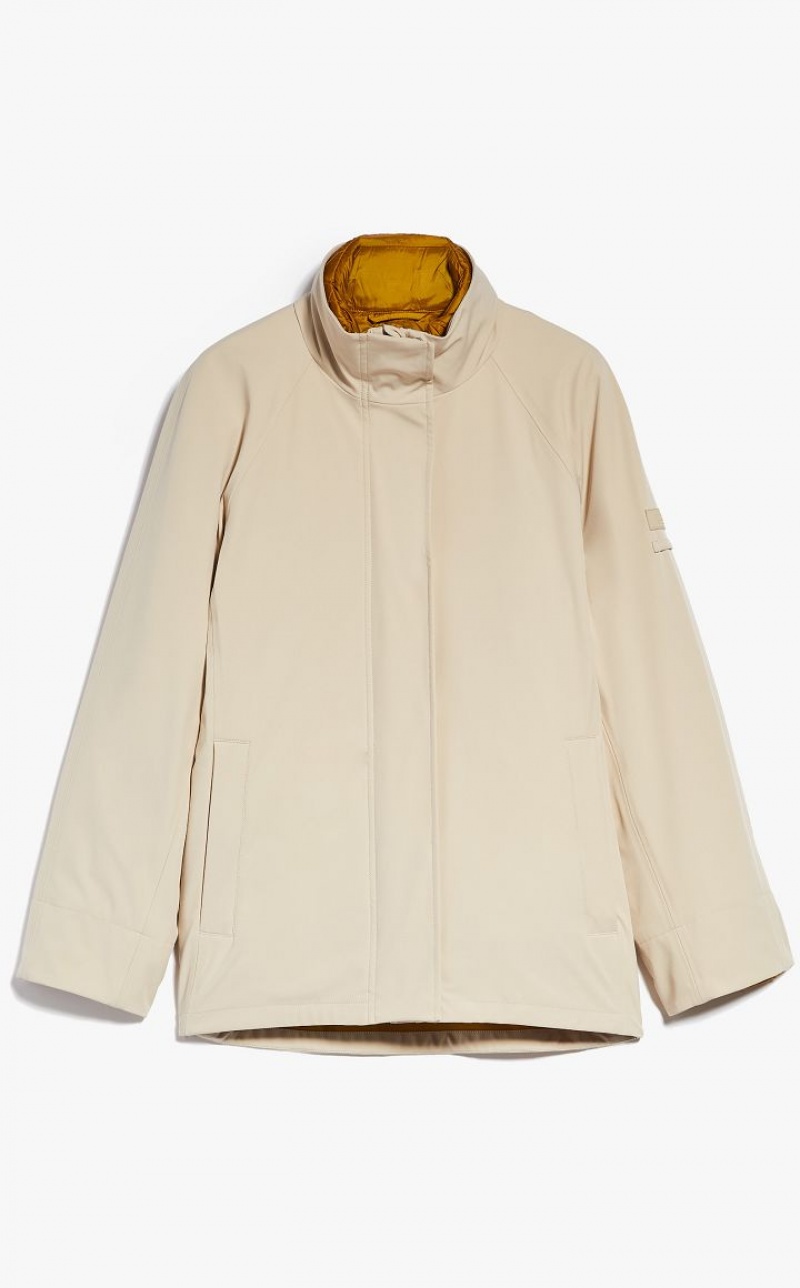Short waterproof jacket in high-performance 3-layer technical fabric: windproof, water-resistant and breathable. Slightly flared style with mandarin collar, long raglan sleeves and zipped pockets covered by flap. Equipped with a removable inner jacket with retractable hood in diamond quilted technical fabric and padded with 100 g Luxepad, designed to retain and optimise body heat, even in cold temperatures. The garment has a two-tone feature: the inside of the shell is the same colour as the padding and the outside is contrasting. Front fastening with concealed zip. Features heat-sealed seams, windproof nylon cuffs, dedicated label embroidered on the inside and QR Code tag on the outside. Length: 70 cm.