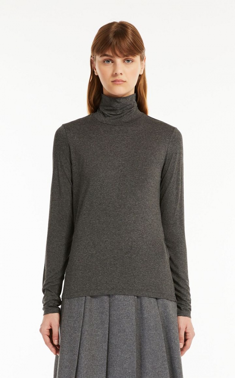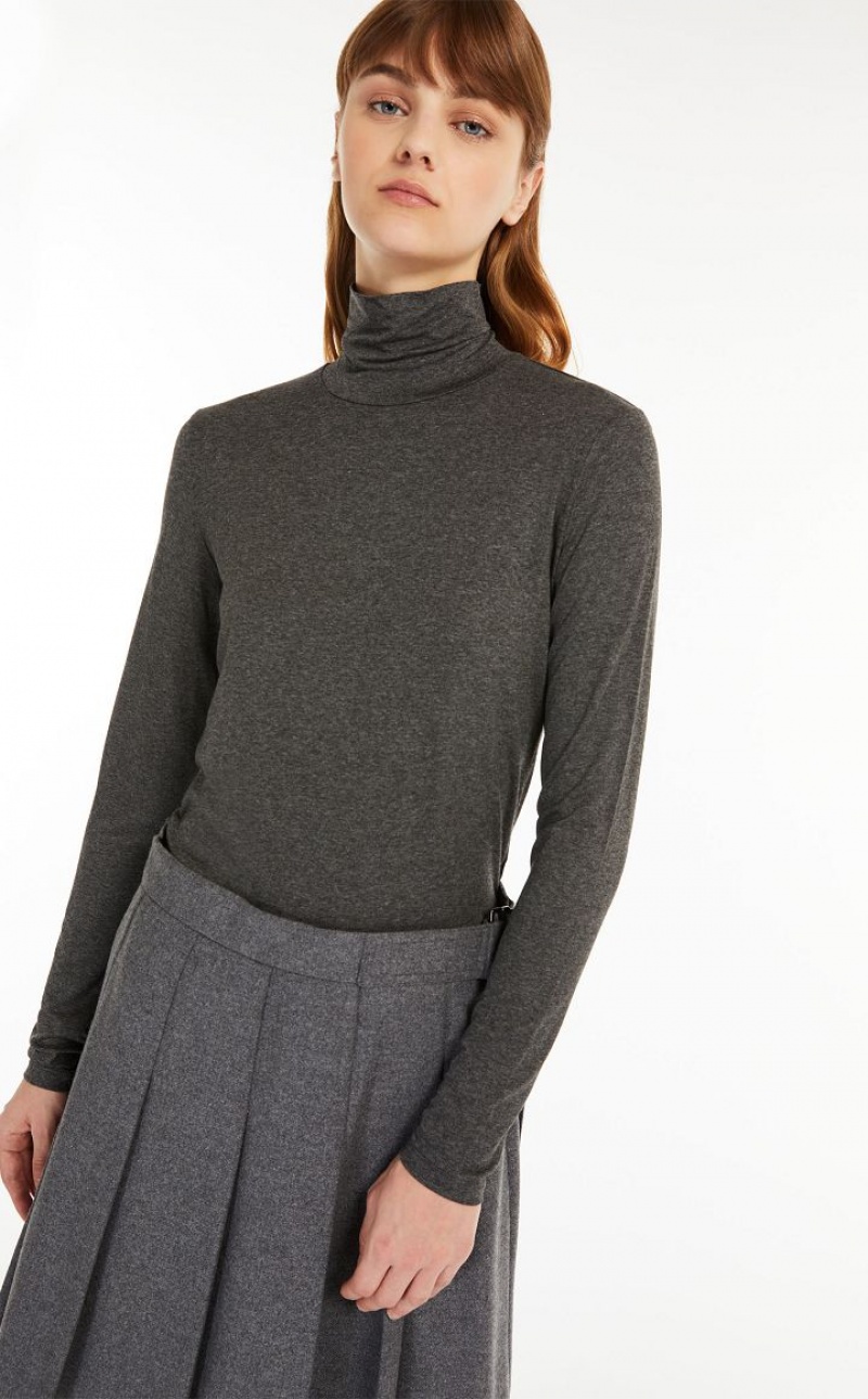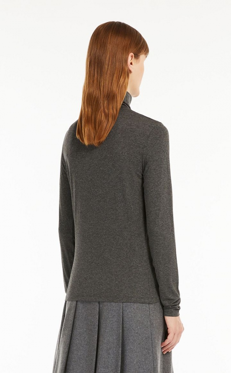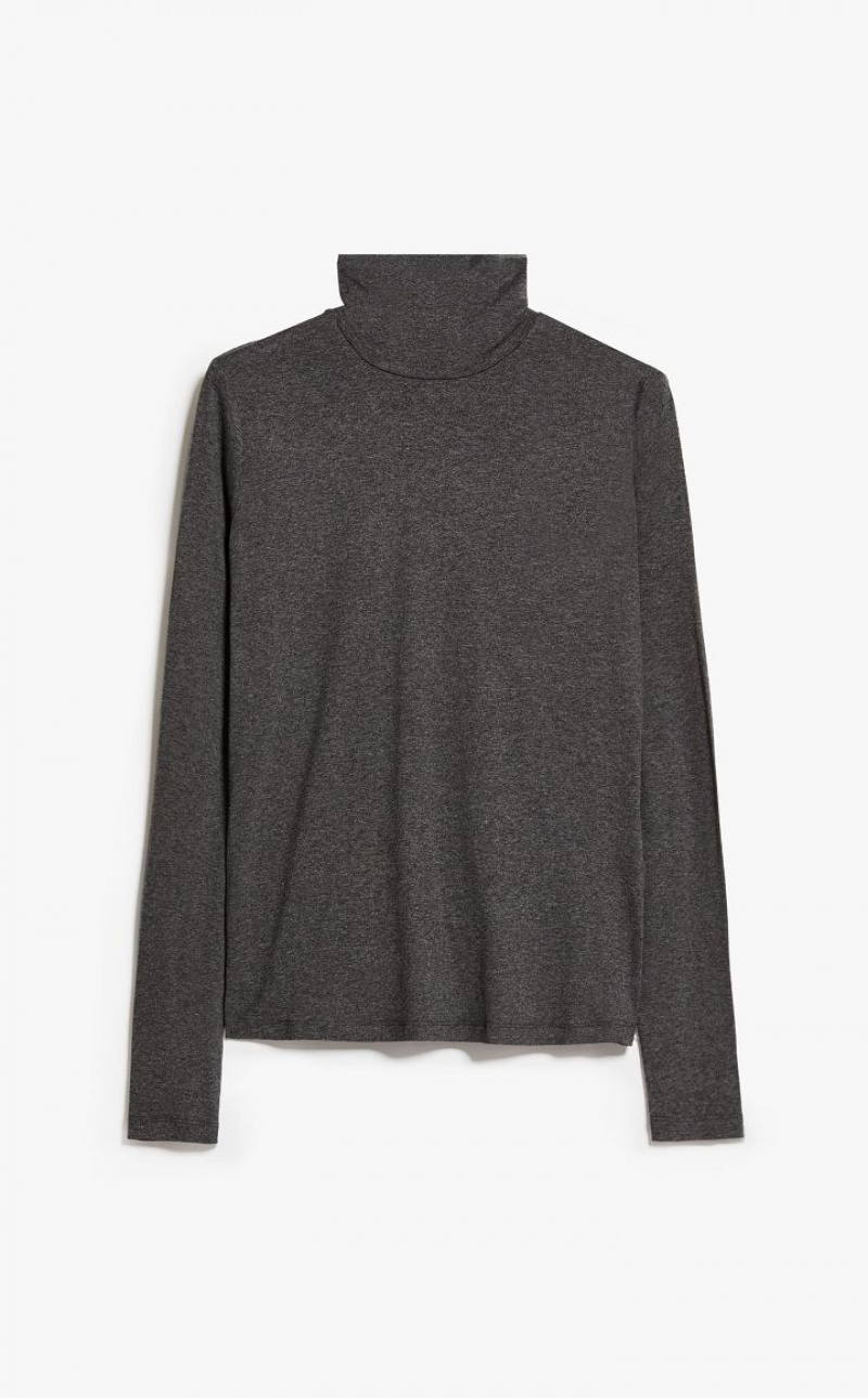 Slim fit long sleeved high neck T shirt in stretch viscose jersey fabric. The back of the neck is customised with a print.