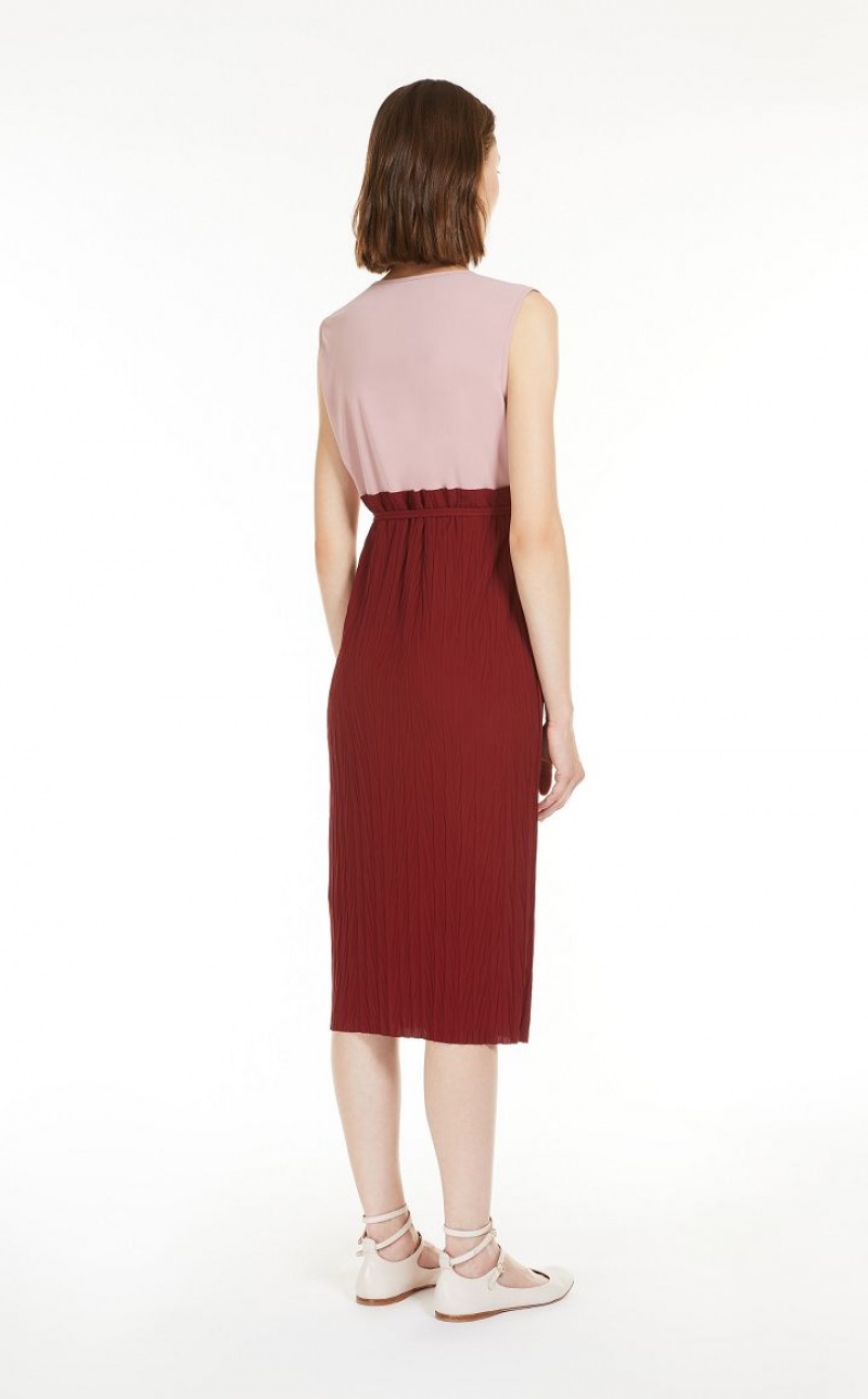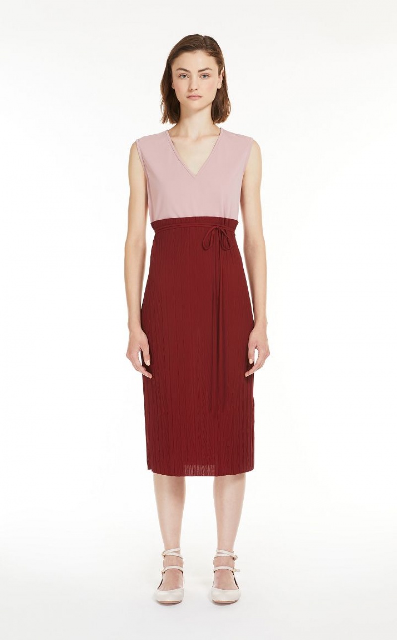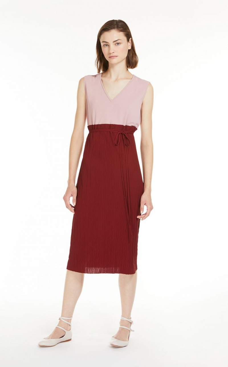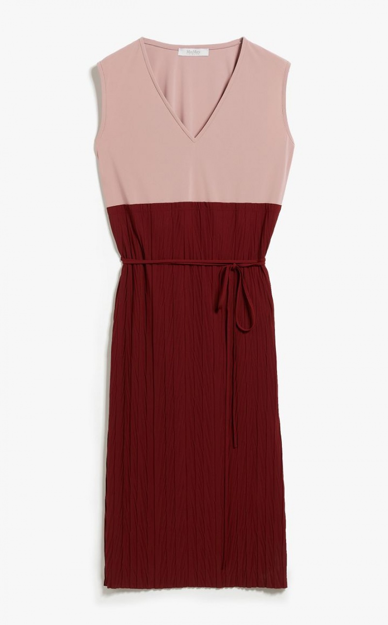 Slim fit sleeveless dress in soft two way stretch jersey fabric. The plain coloured bodice with a V neck front compliments the bark look vertical pleat calf length skirt. The small ruche decorated waistline, on the other hand, slims the figure, whilst the matching small tubular belt accentuates the silhouette.