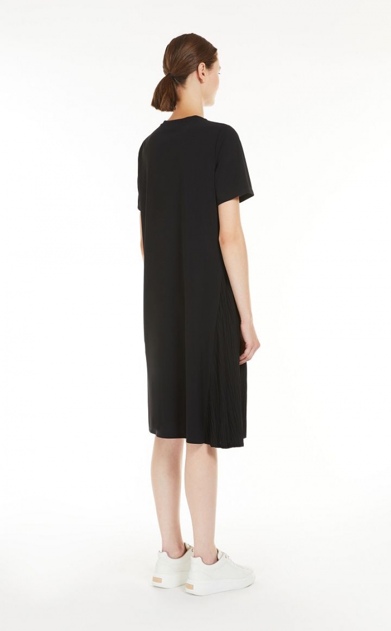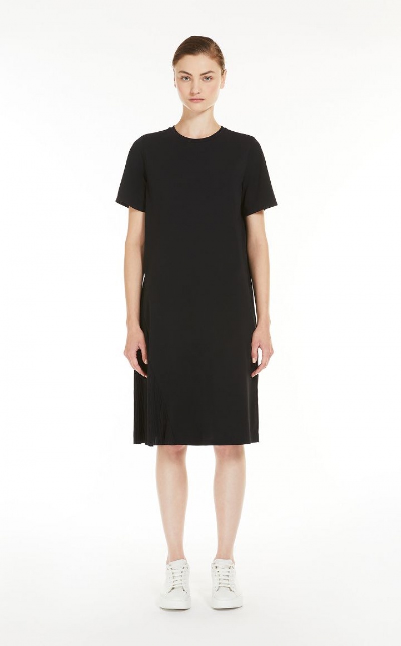 Crew neck dress in soft two way stretch jersey fabric featuring short set in sleeves. The flared model boasts distinctive bark look pleated diagonal detail on the right side, which creates movement from the waist down.