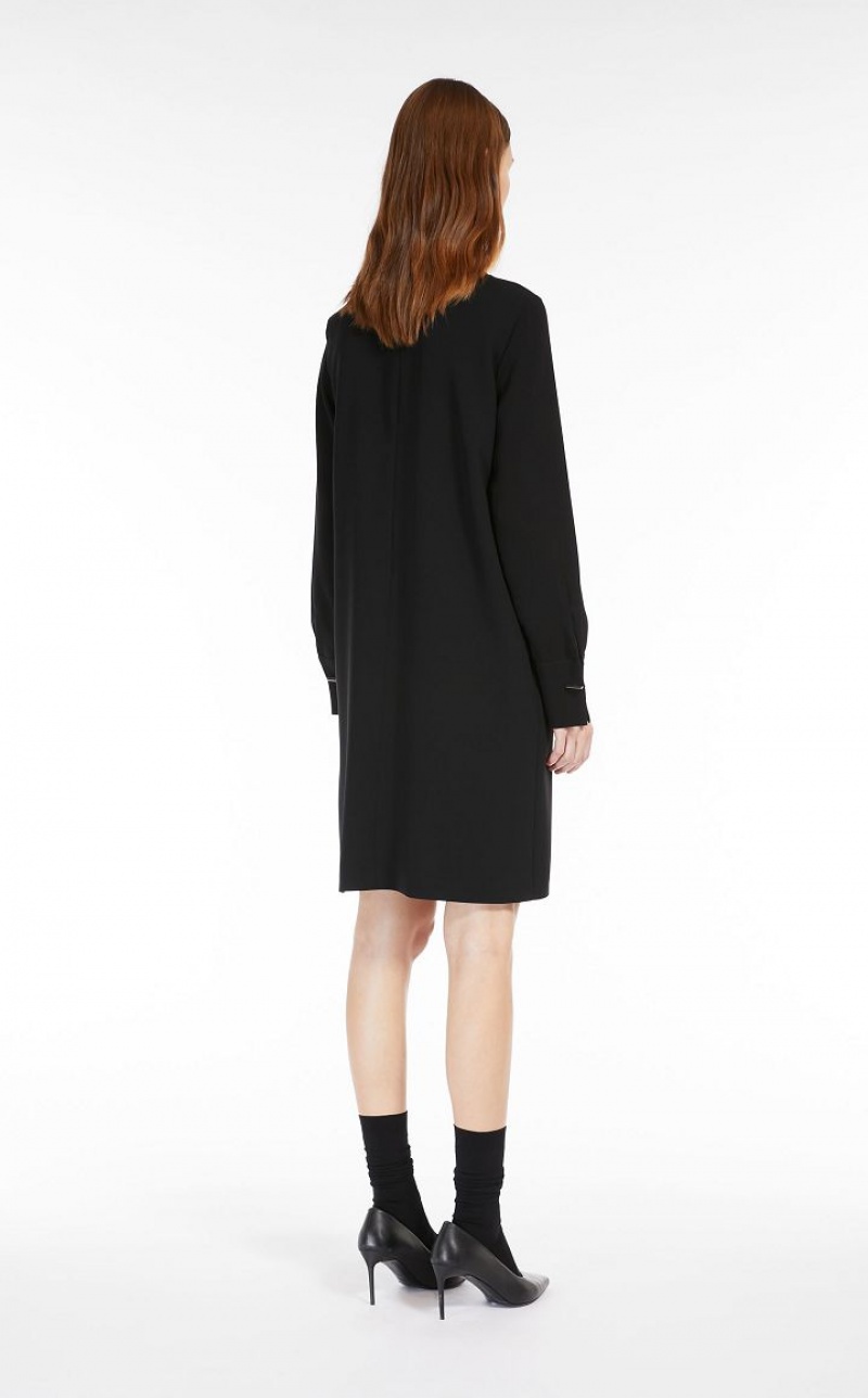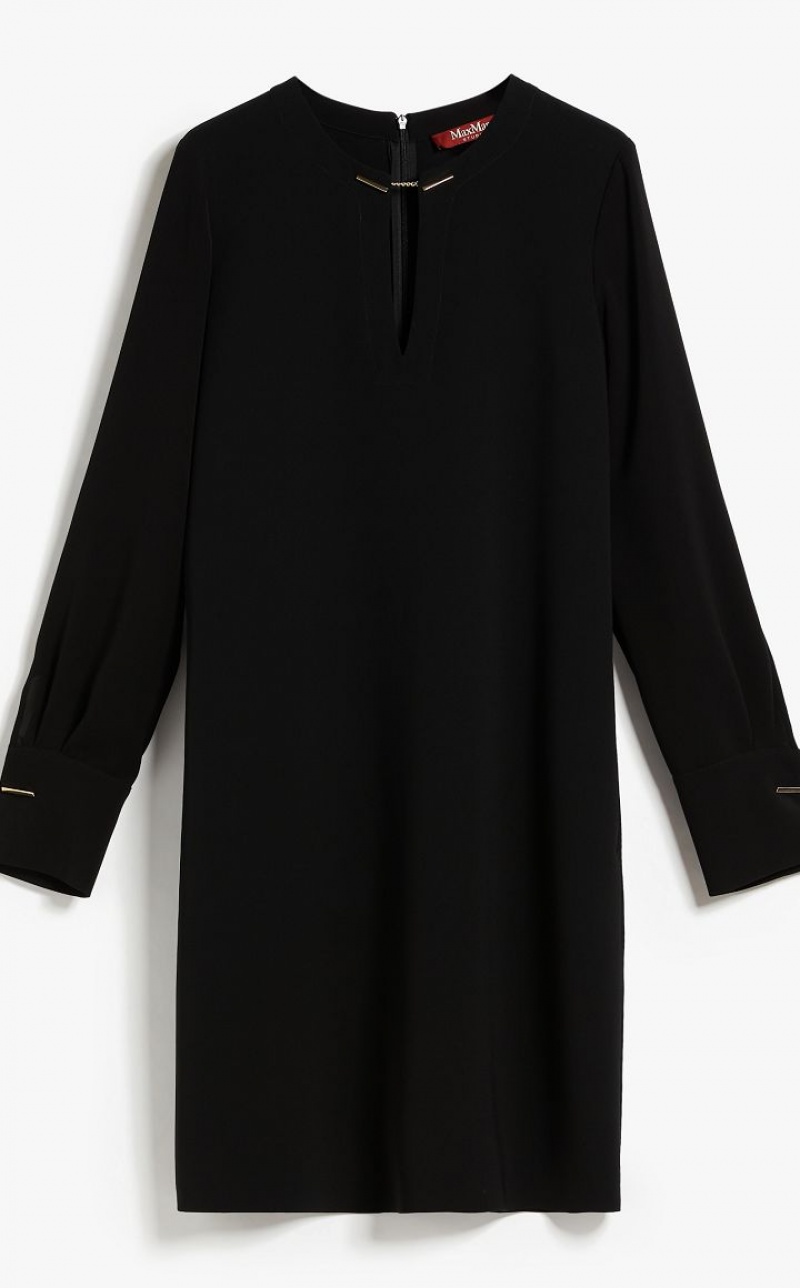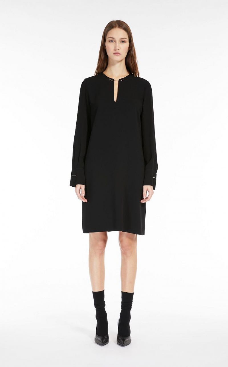 Short dress in refined technical cady fabric featuring a V-slit detail-embellished neckline, complete with toggle and small chain detail. The lightweight cady long sleeves boast bejewelled button-adorned cuffs. Length: 94 cm.