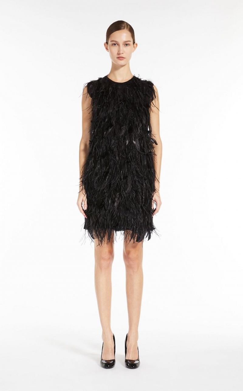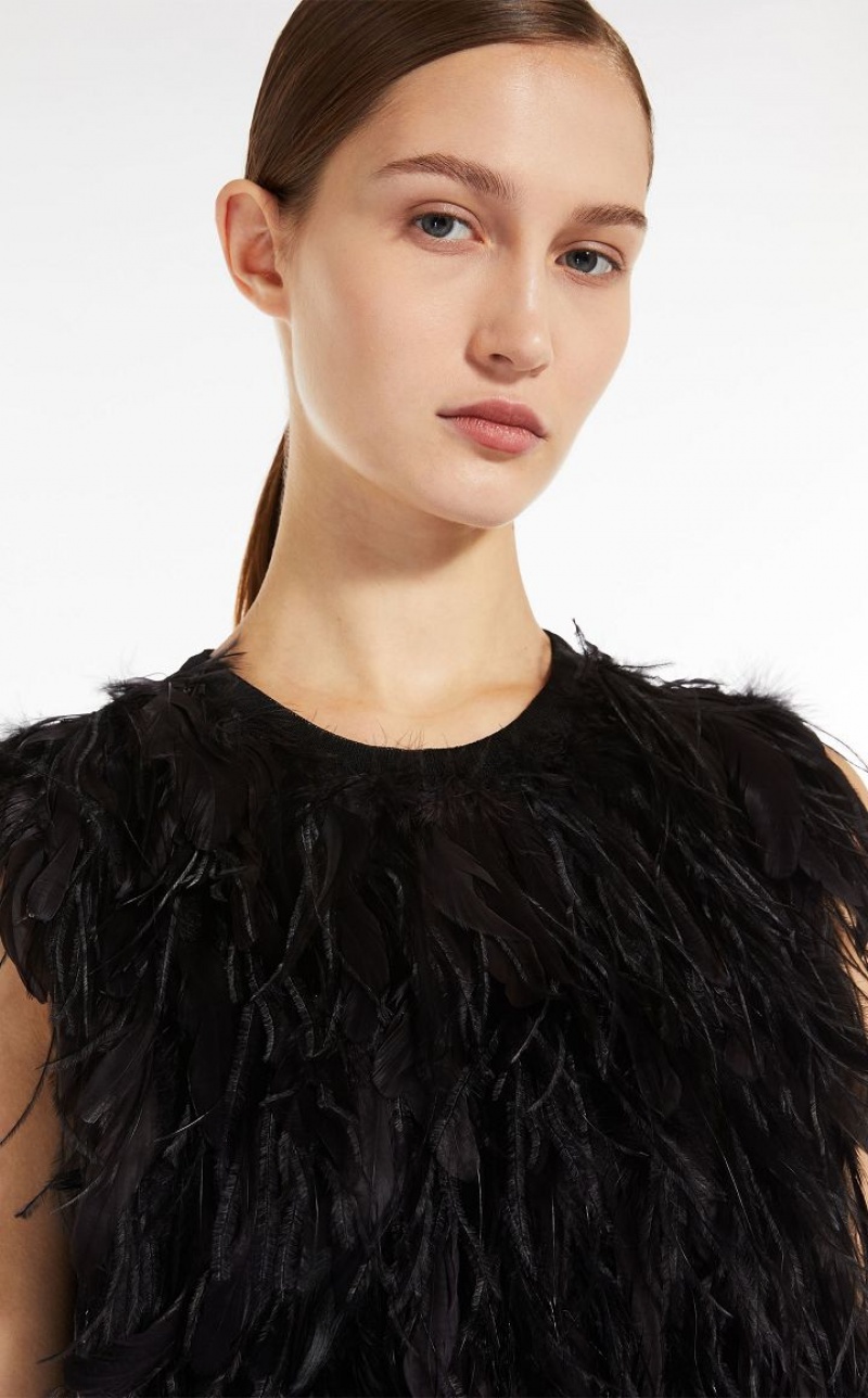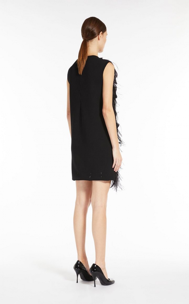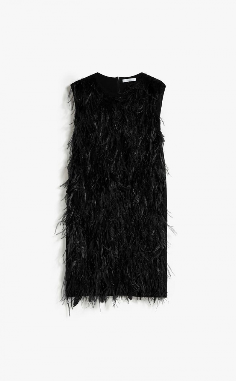 Short sleeveless dress made in a soft stretch viscose fabric-stitch knit, embellished with elegant black hand-embroidered feathers on the front. Lined style with back zip fastening. Length: 90 cm.