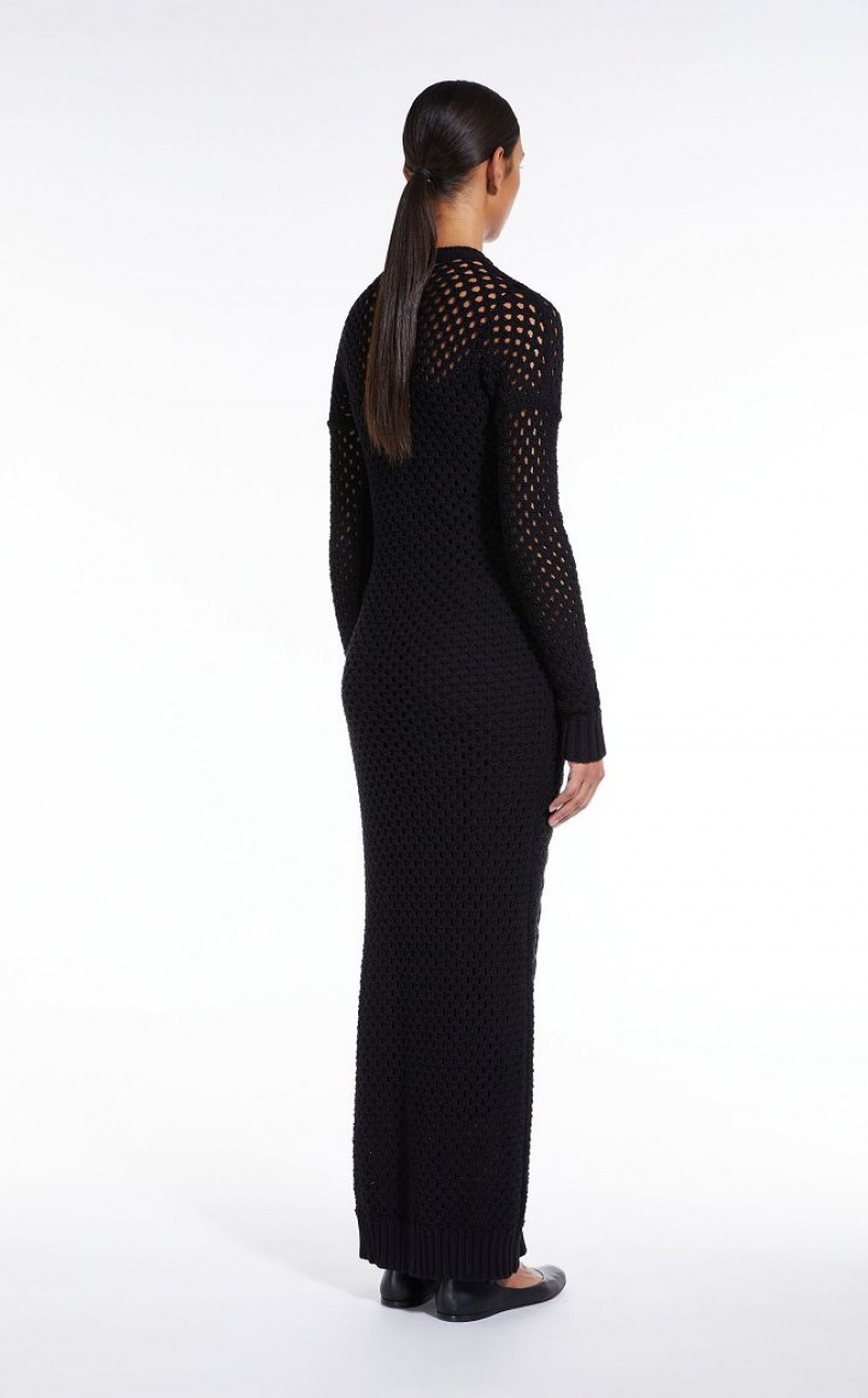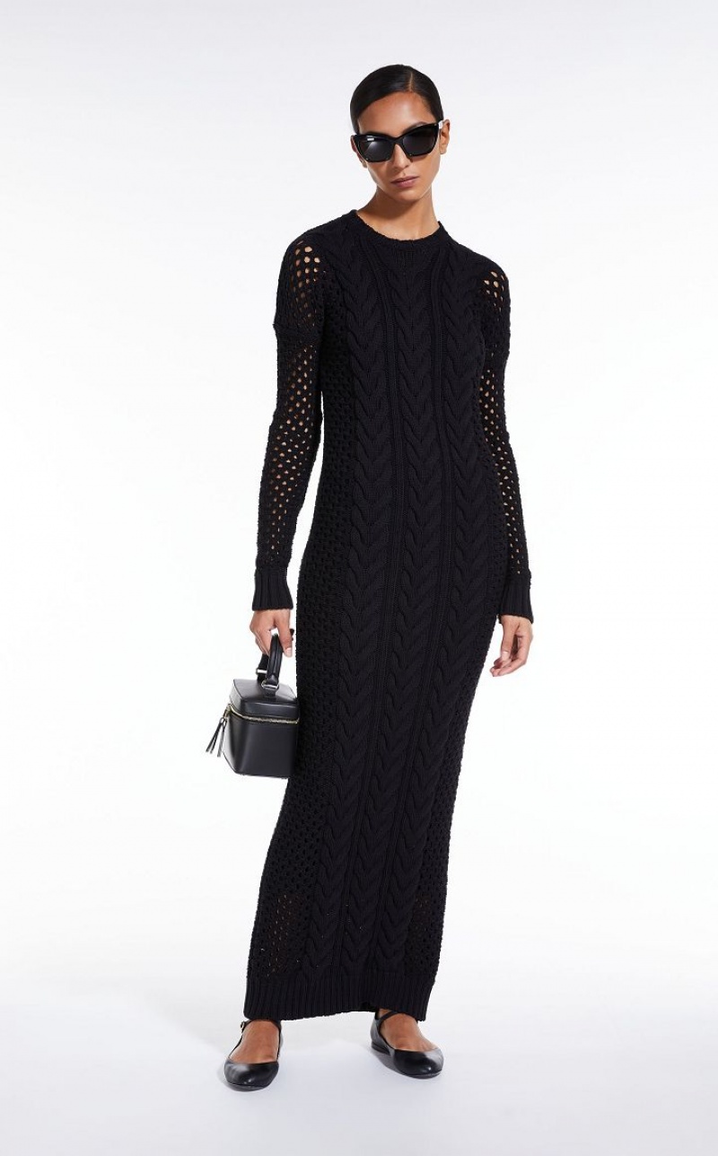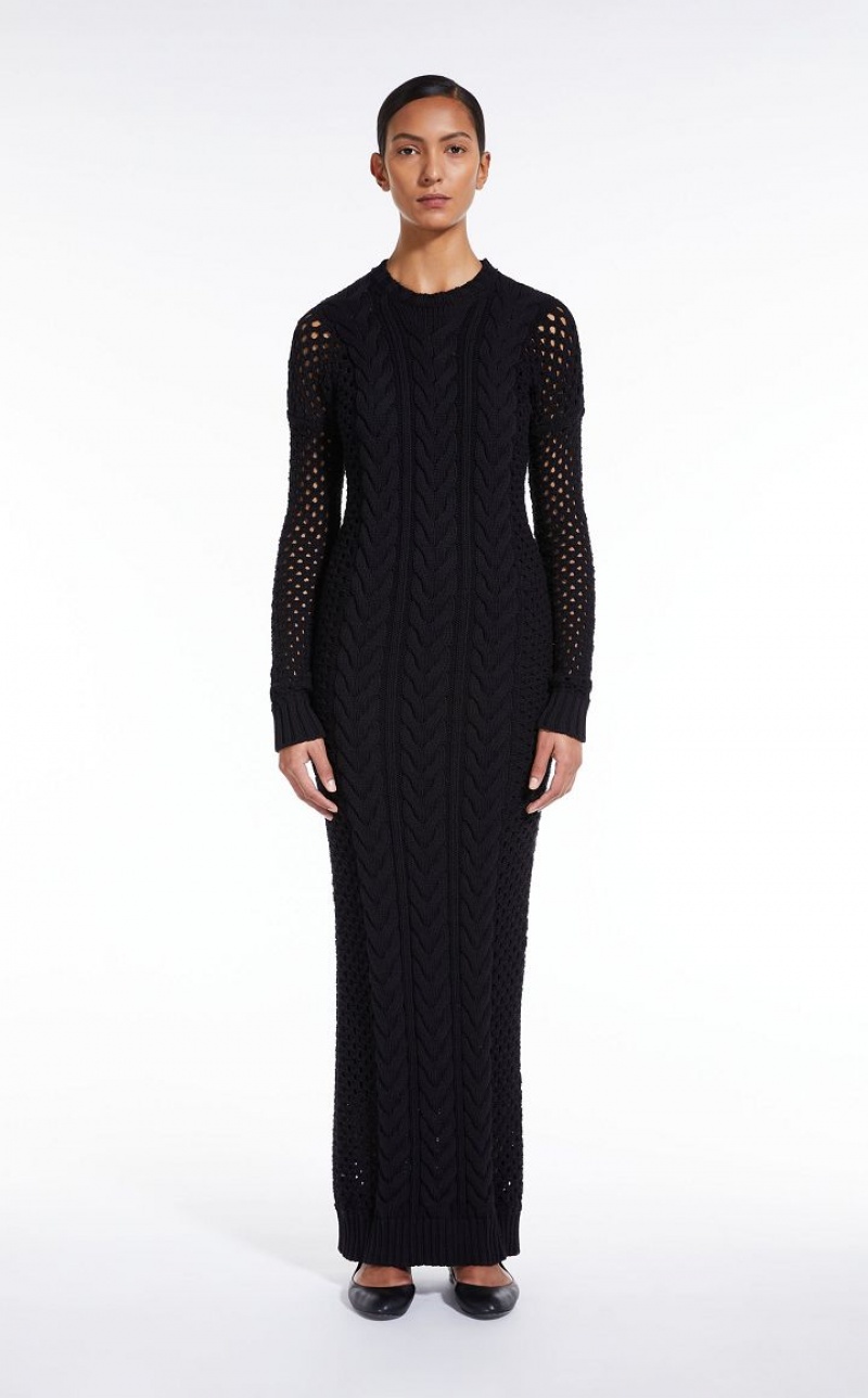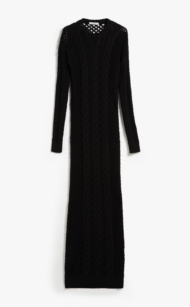 Long, fitted dress made of cotton cordonnet yarn, embellished with a cable knit front and openwork motif on the sleeves and back. The style comes with a matching stretch viscose slip with ribbed edges. Length: 140 cm.