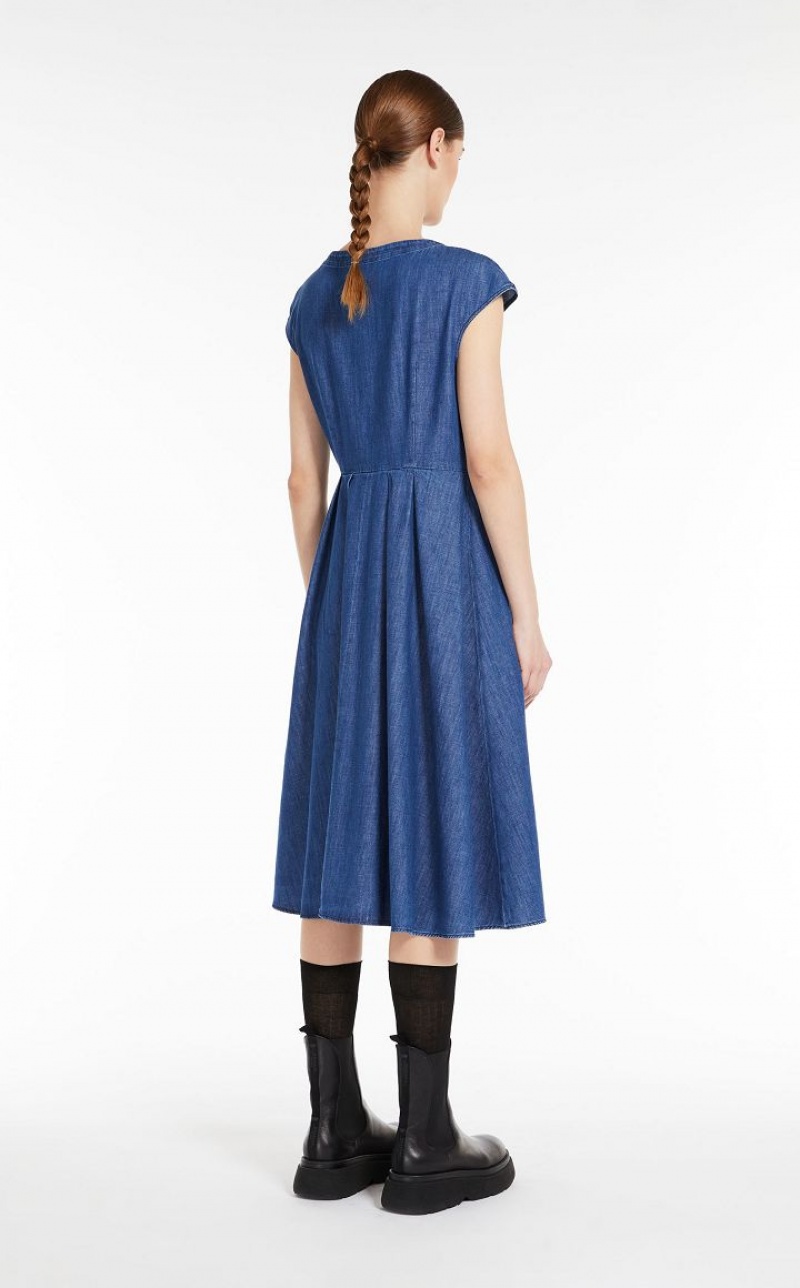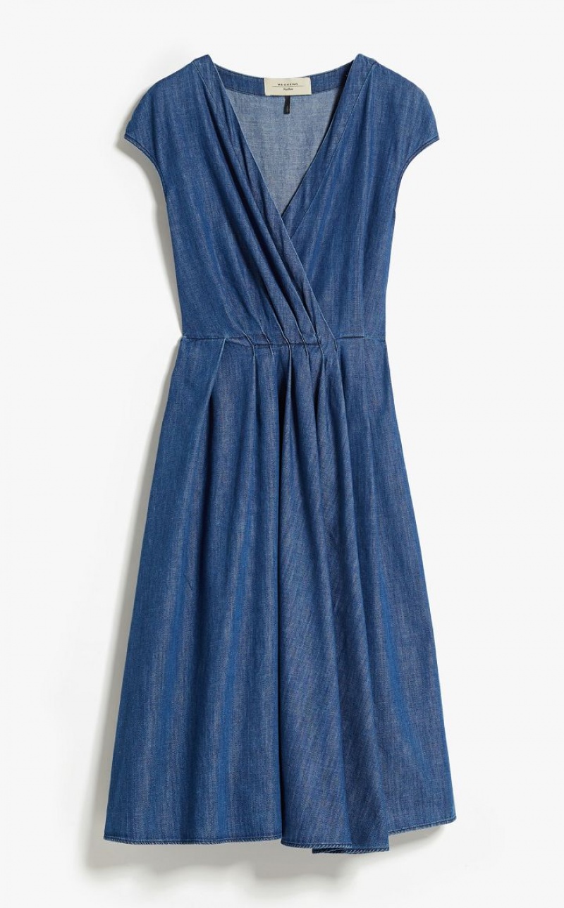 Mini dress in pure cotton denim with short kimono sleeves and pockets set into the side seams. The silhouette features a crossover V neck with draped pleats and a wrap skirt.