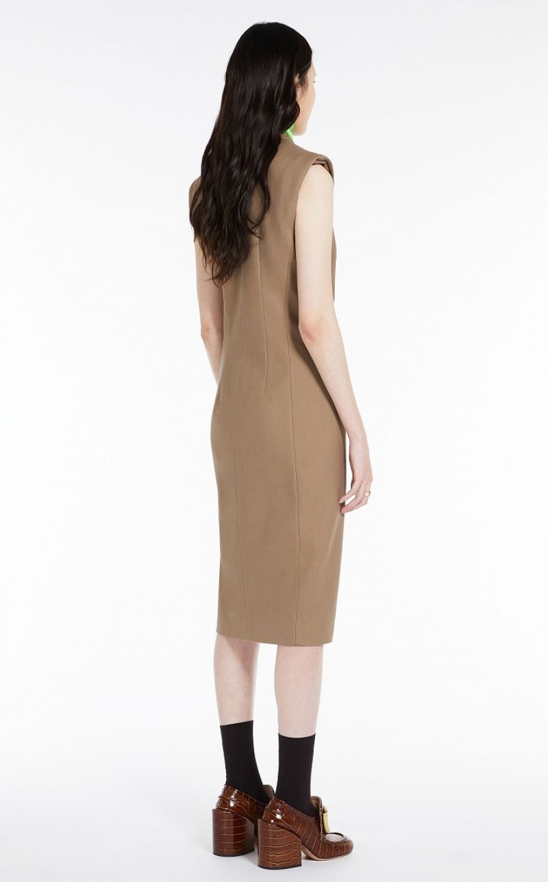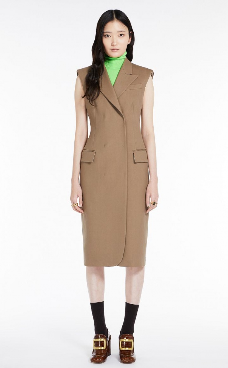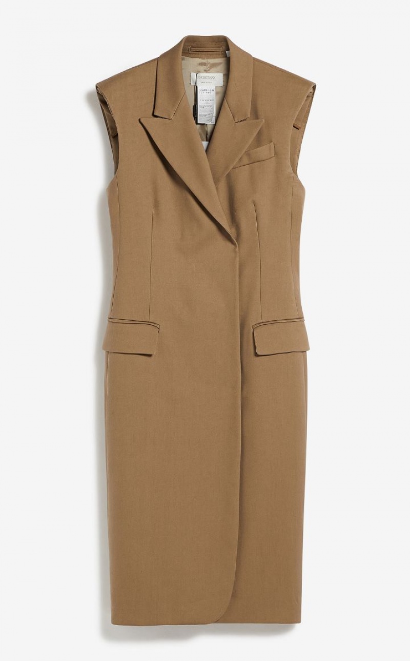 Sleeveless dress with a tailored construction, inspired by the look of a menswear blazer. Created in a double layer of cotton and viscose fabric, it fastens at the front with hidden rubberised press studs, while the darts at the waist on both the front and back define the slim-fit silhouette. The peak lapel collar is completed by a Melton undercollar. Detail of lined shoulder strap visible above the shoulder. Flap pockets along the sides and slanted breast pocket. Lined for exceptional comfort. Below-the-knee length.