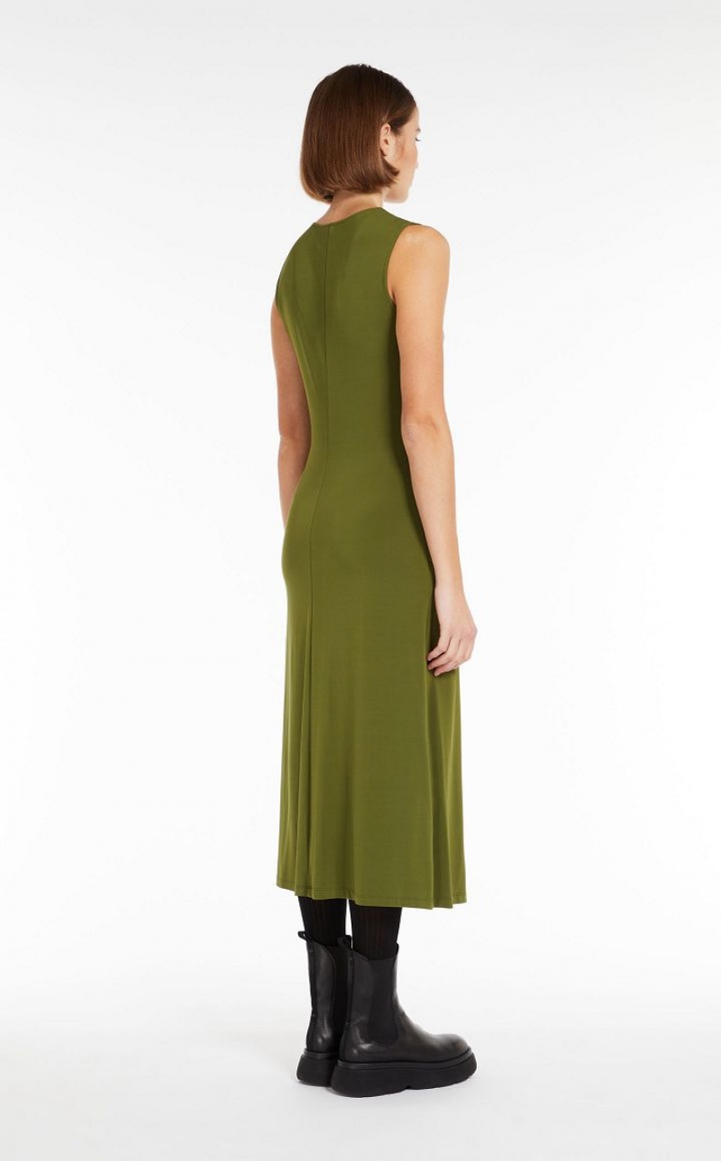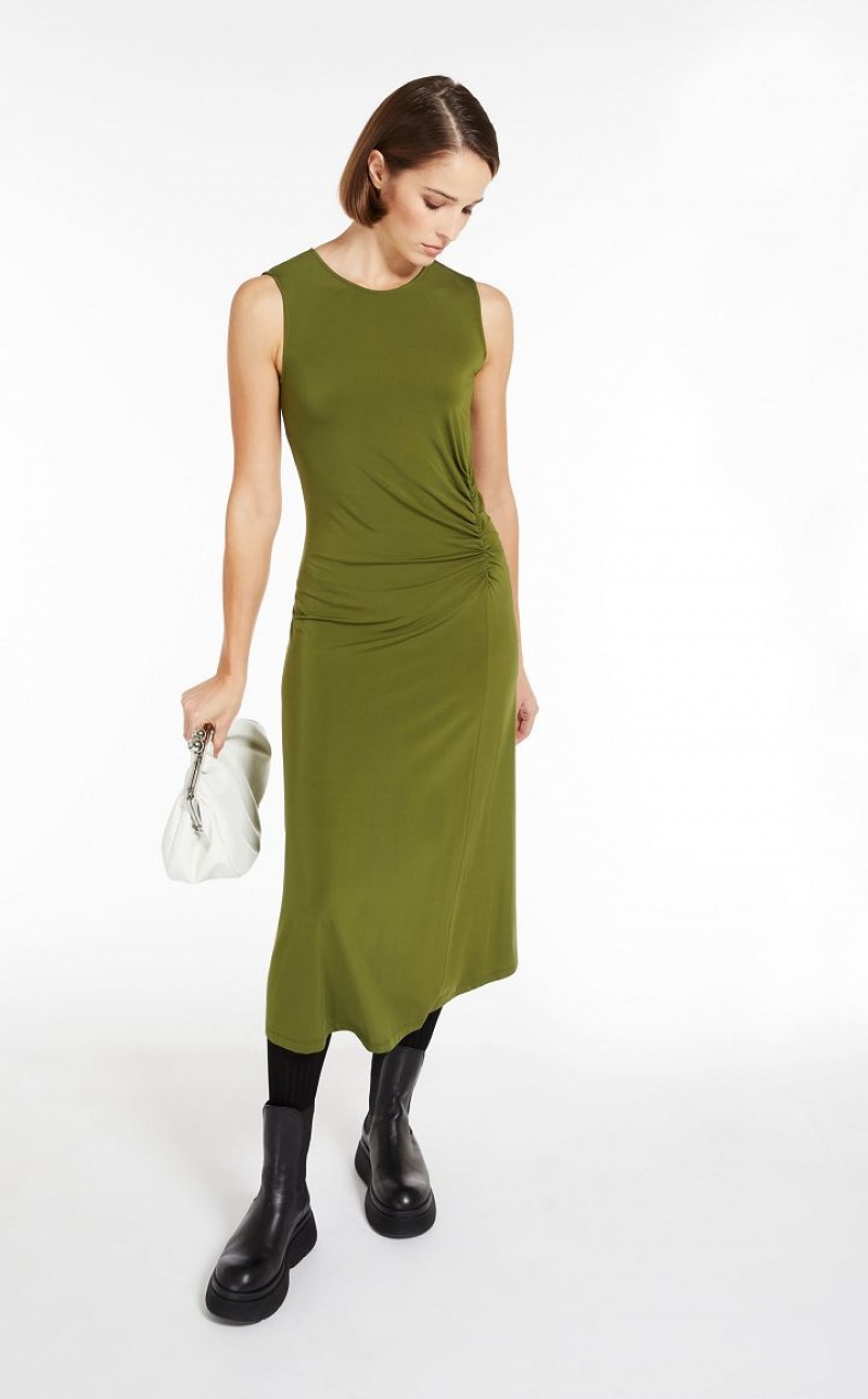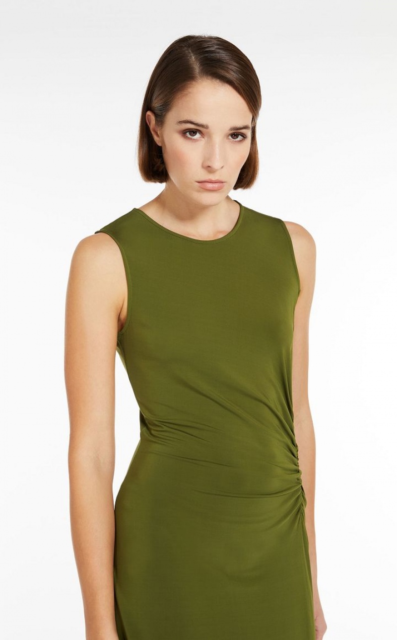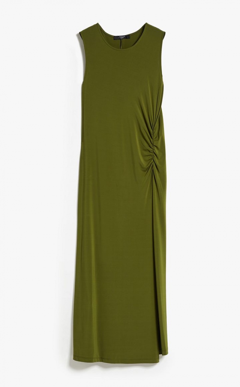 Long sleeveless dress in soft viscose crepe jersey, with a fitted silhouette subtly flaring at the hem. This style features delicate gathering on the side to emphasise the silhouette.