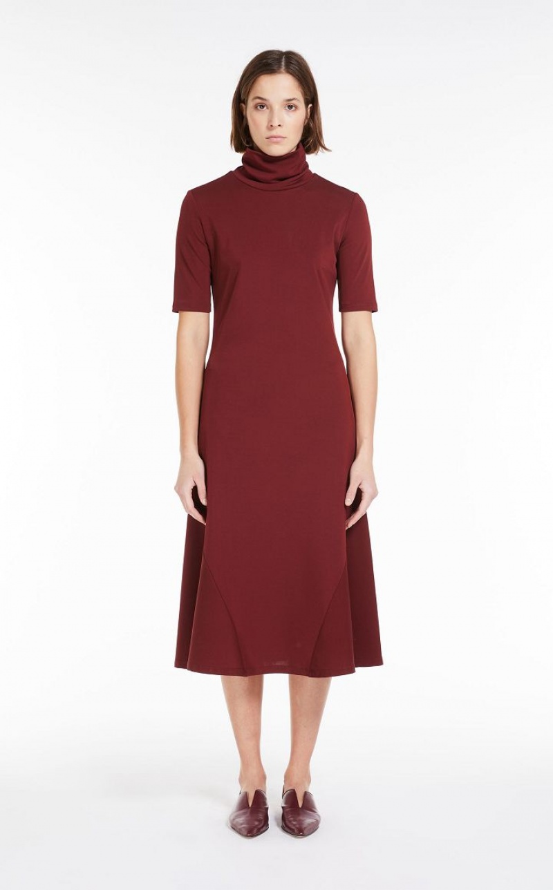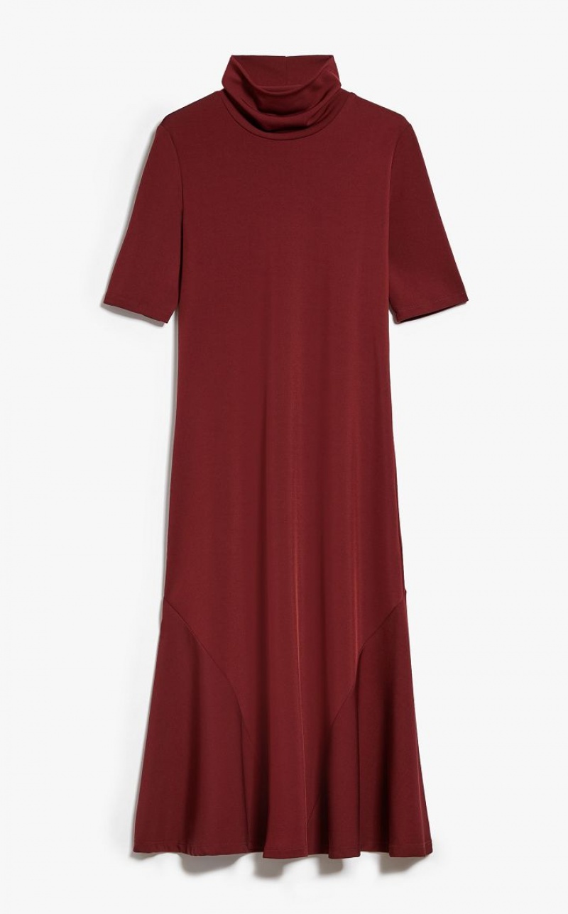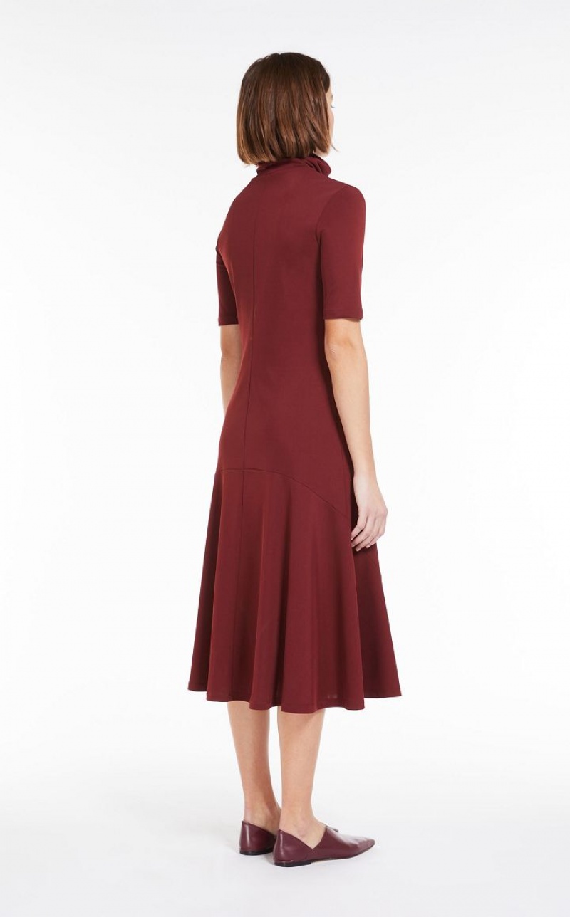 Flowing midi dress in technical jersey featuring a close-fitting silhouette that opens out to the hem with an oblique-cut motif. High neck and short sleeves. Length: 120 cm. The fabric is made from fibres obtained from wood pulp, coming from controlled, managed forests following the criteria of good forest management.