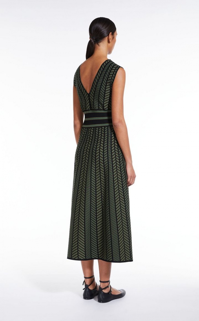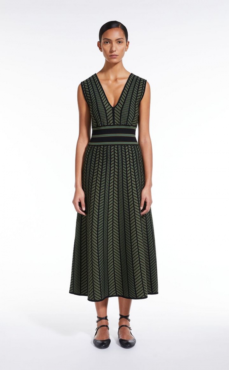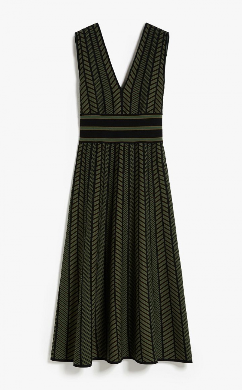 Sleeveless midi dress made of soft jacquard viscose yarn, embellished with an elegant all-over chevron design. The silhouette, with a V neck on the front and back, is accentuated by a striped-pattern band at the waist and a slightly flared skirt. Concealed zip fastening at the side. Length: 125 cm.