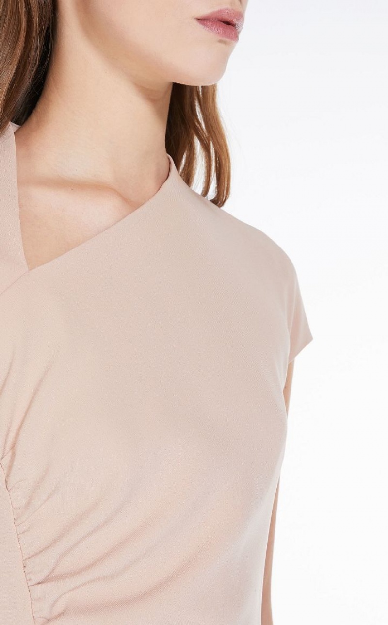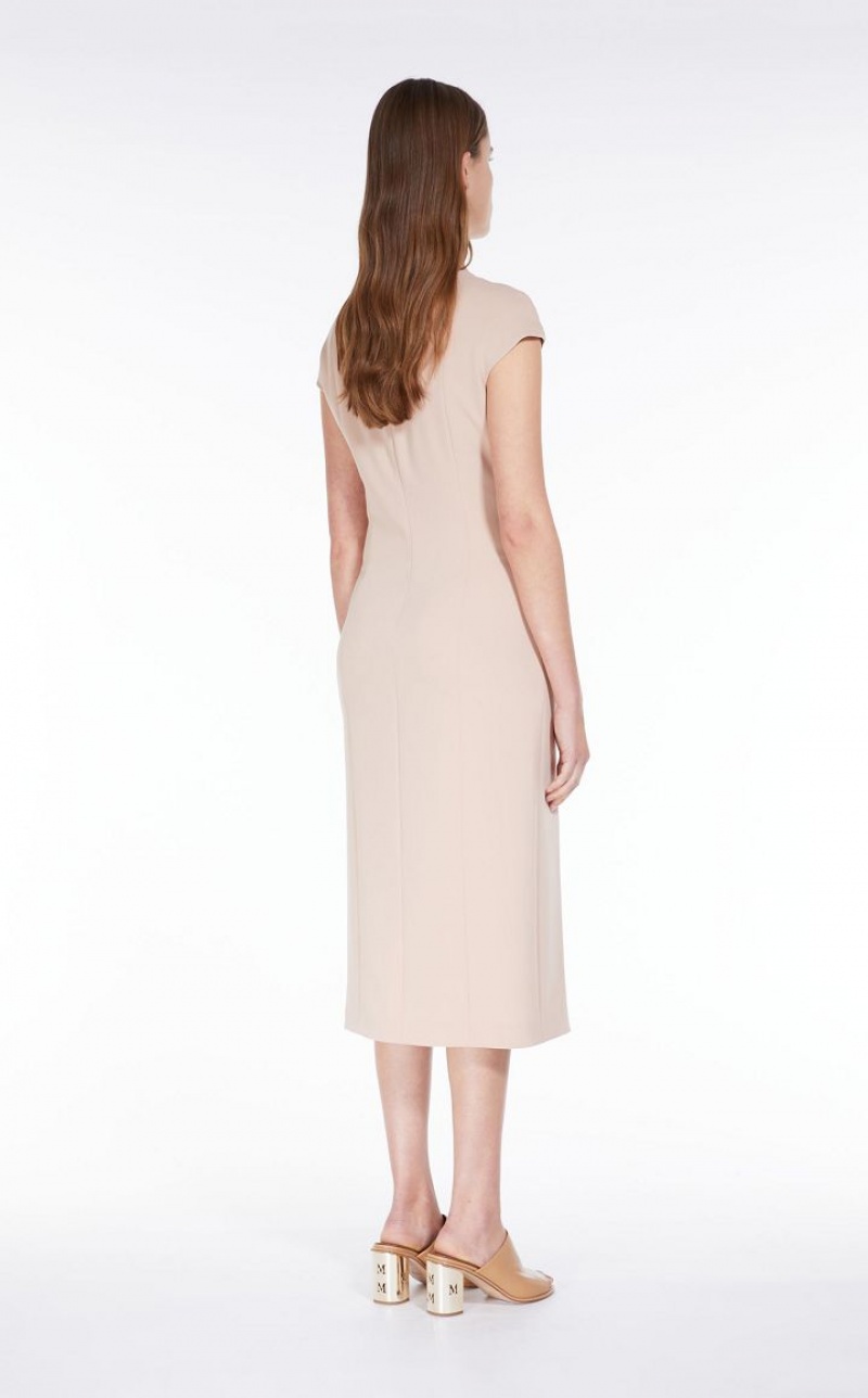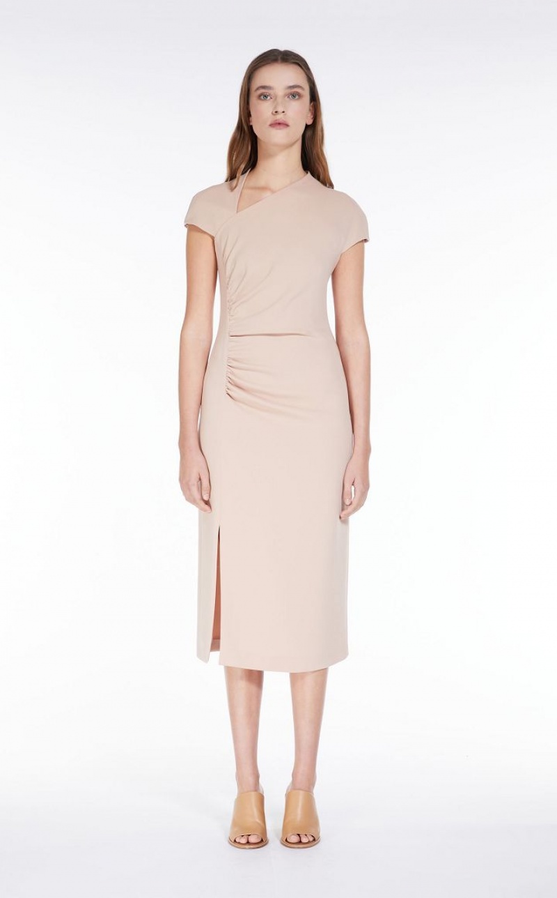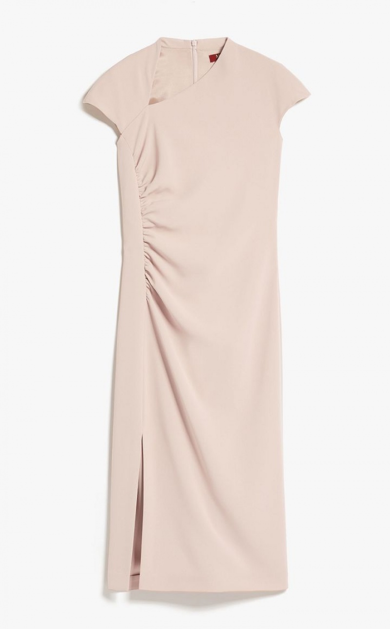 Elegant long sleeveless dress in cady fabric featuring a slim fit, refined gathered detail at the side, an asymmetrical geometric neckline and a small kimono sleeve. Lined model. Length: 118 cm