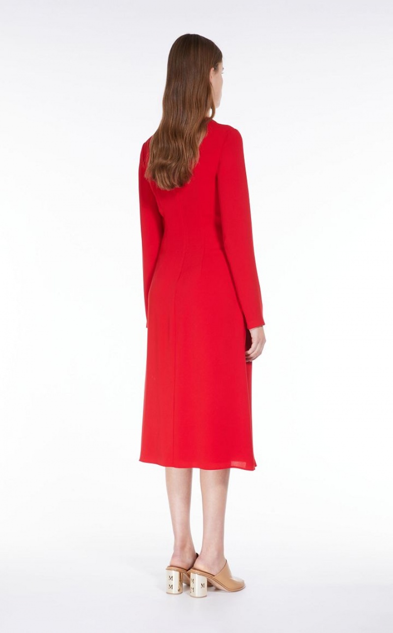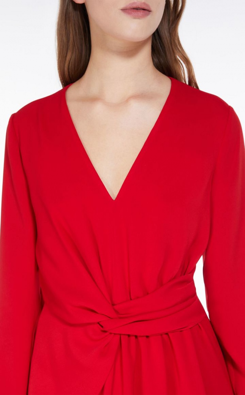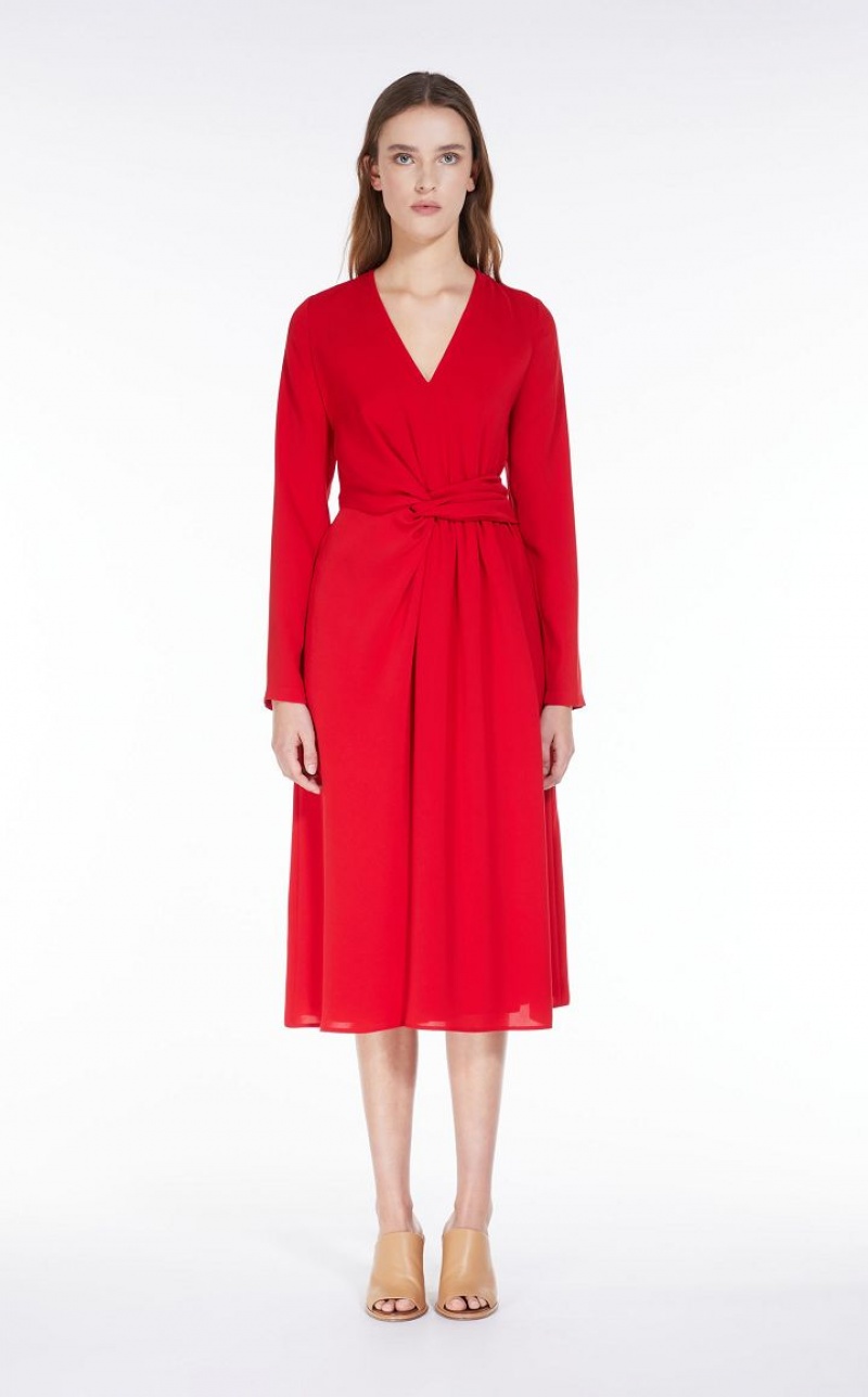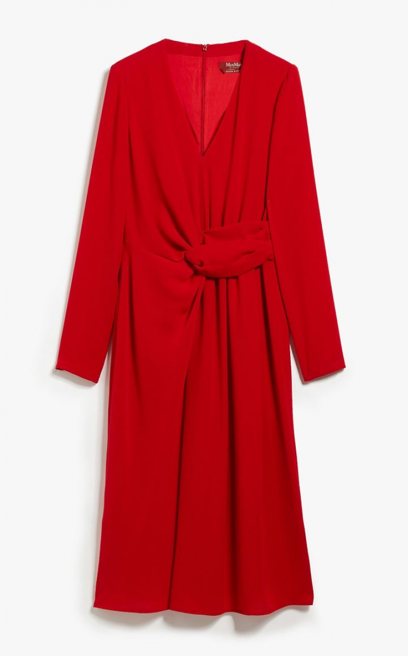 Elegant long dress in lightweight cady fabric. The long-sleeved V-neck model boasts refined draped knot detail at the side. Lined model. Length: 118 cm.