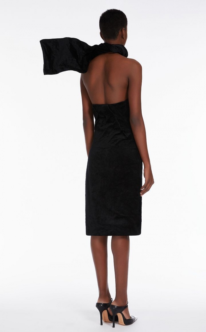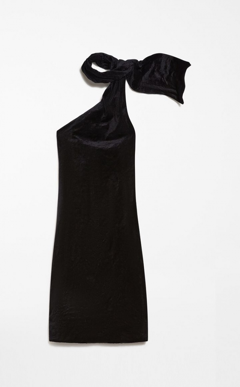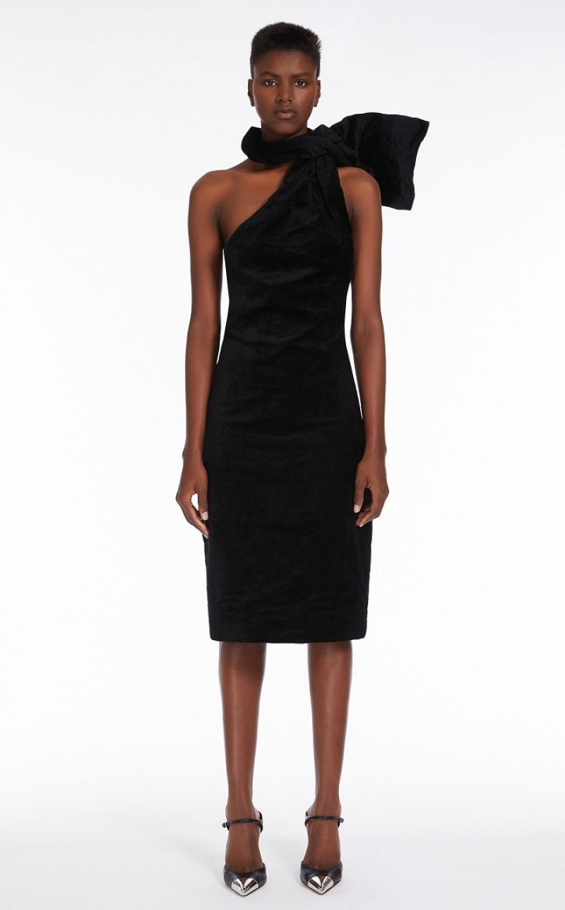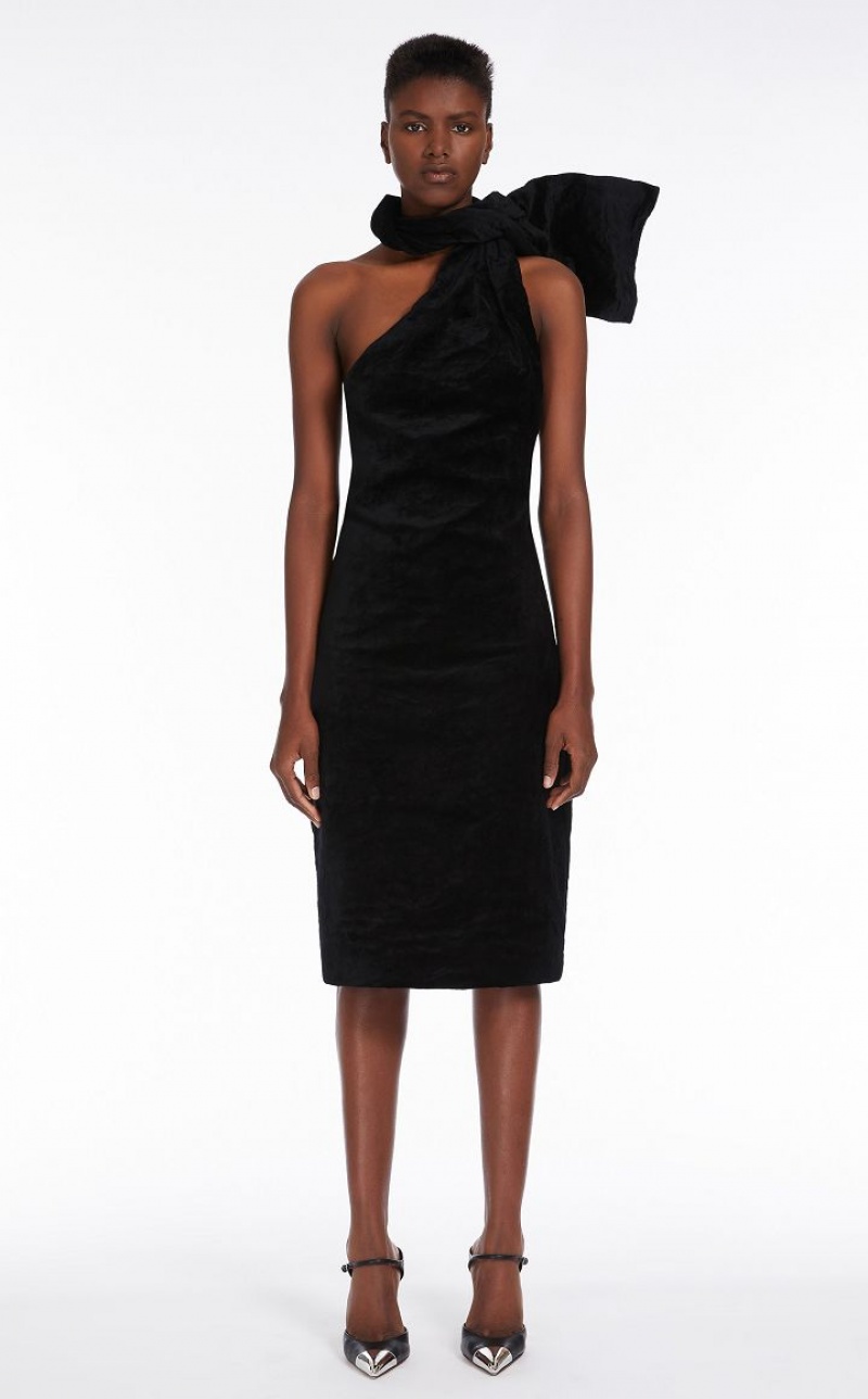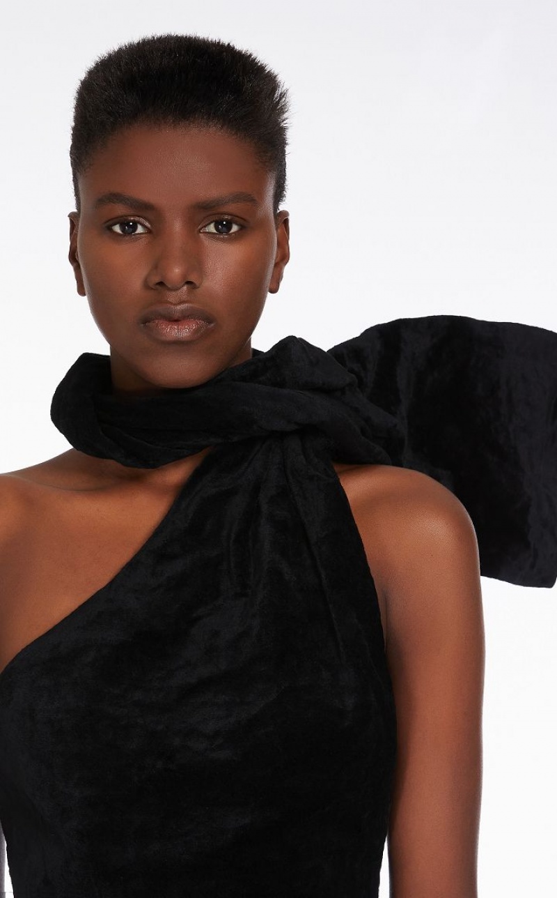 One-shoulder dress in crinkled velvet fabric. The ultra-long left shoulder strap can be wrapped around the neck like a scarf. A slim fit for a feminine silhouette
