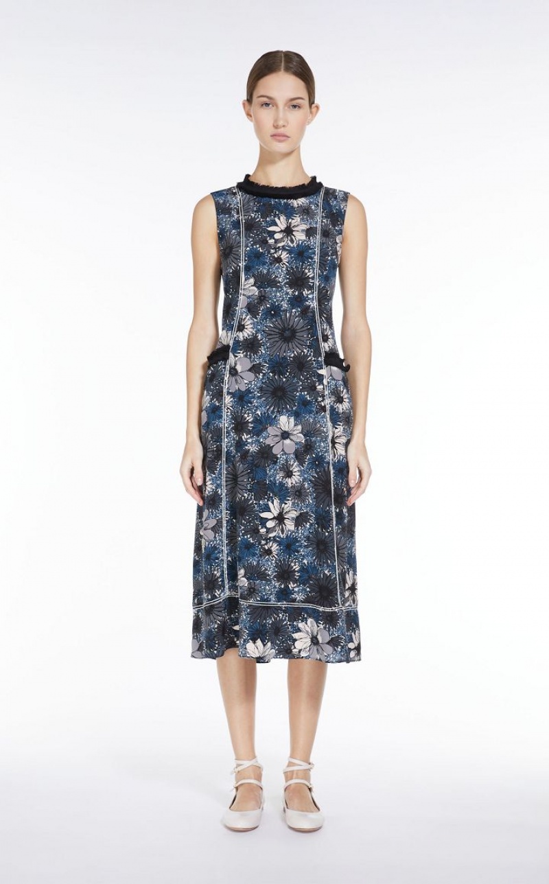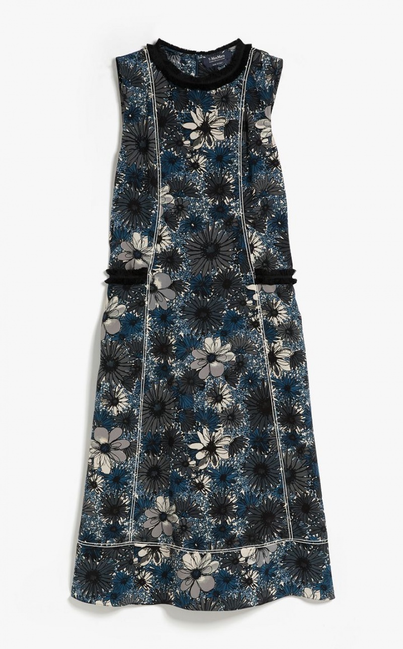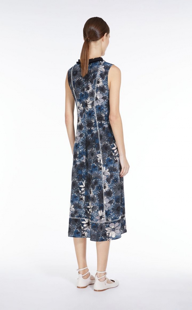 Fluid-fit long sleeveless dress in fine printed pure silk crepe de chine fabric featuring a flared skirt. Embellished with contrasting topstitching, in addition to fringed details on the neckline and side pockets. Length: 120 cm.
